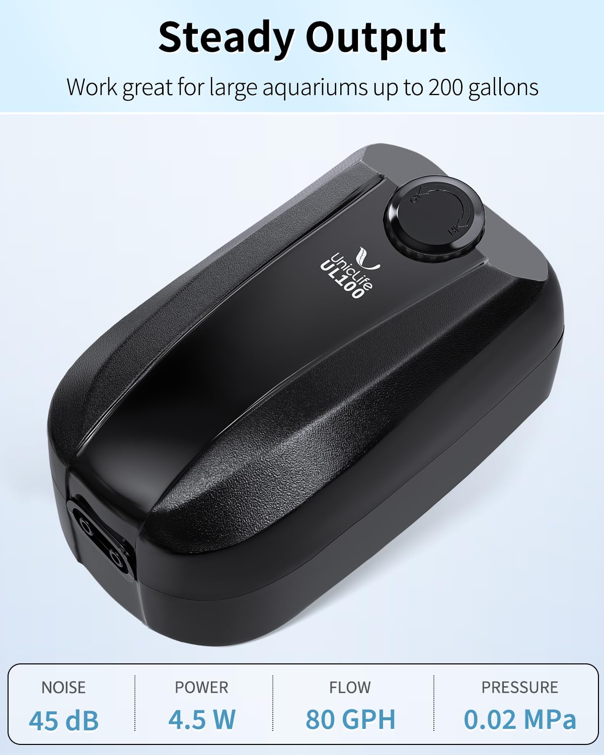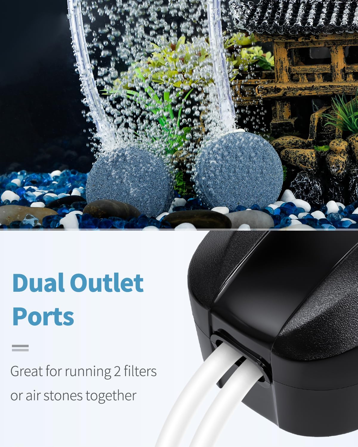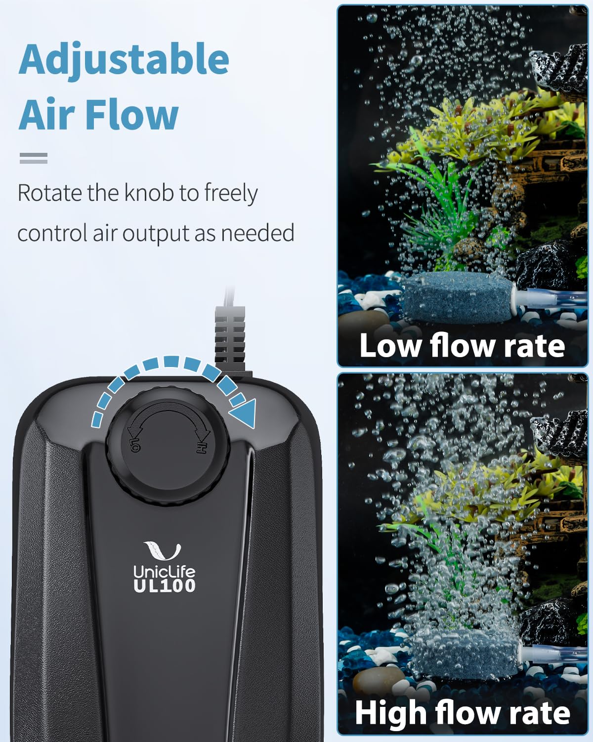 Adjustable Air Flow: Rotate the knob to freely control the flow rate for dual outlets. Greatly meet your desired air flow to keep fish or roots healthy. Ideal for fish tanks, small ponds or DWC systems.