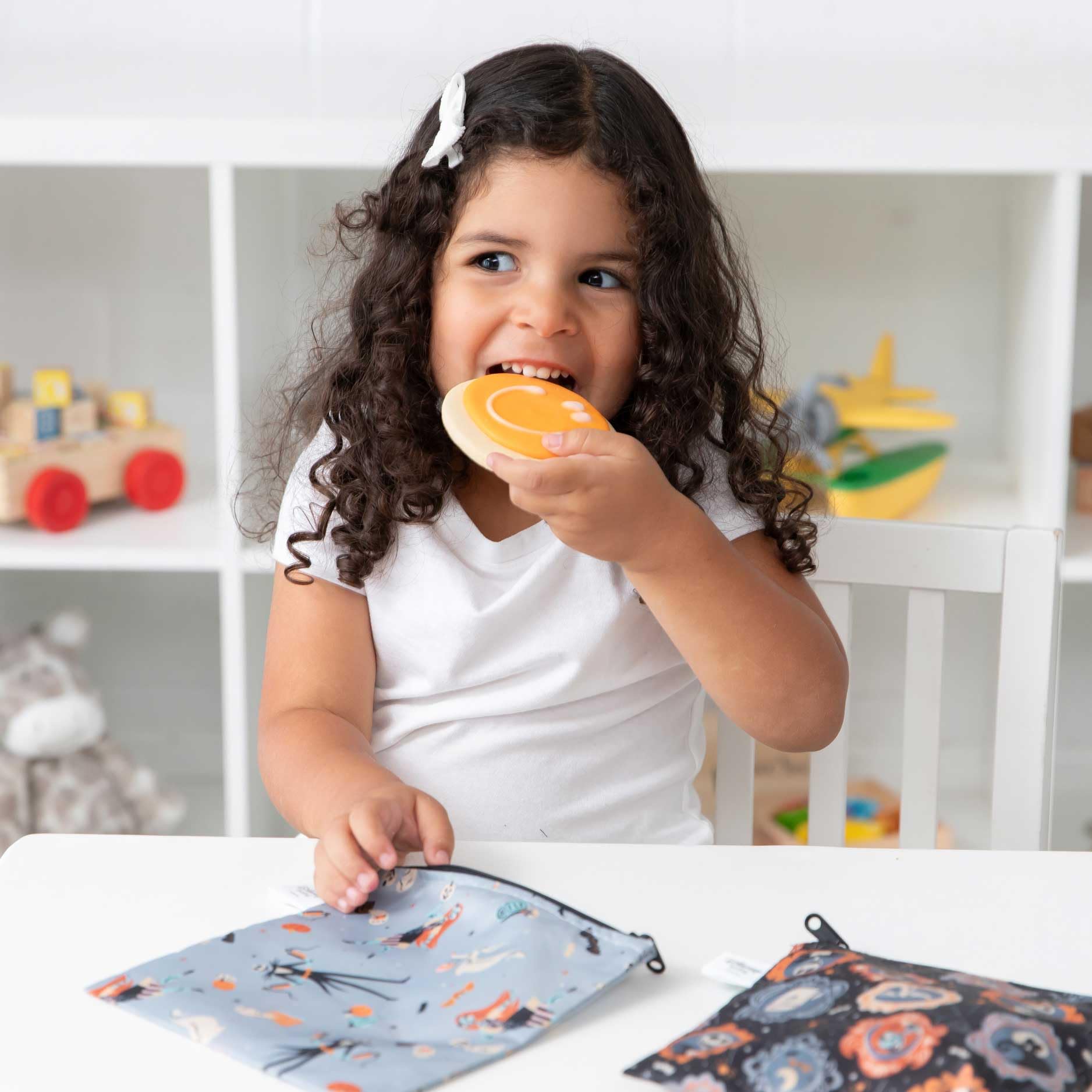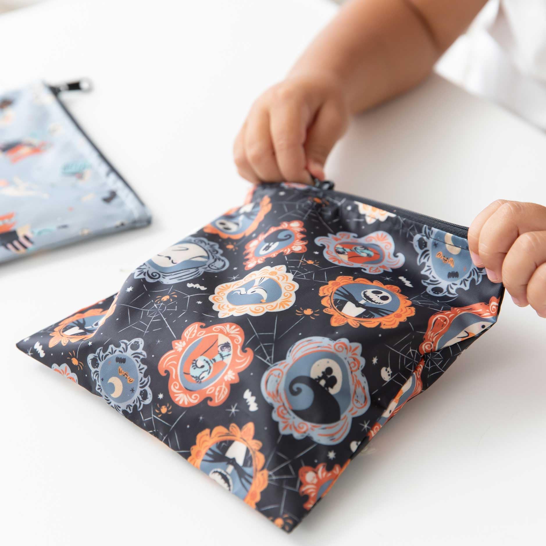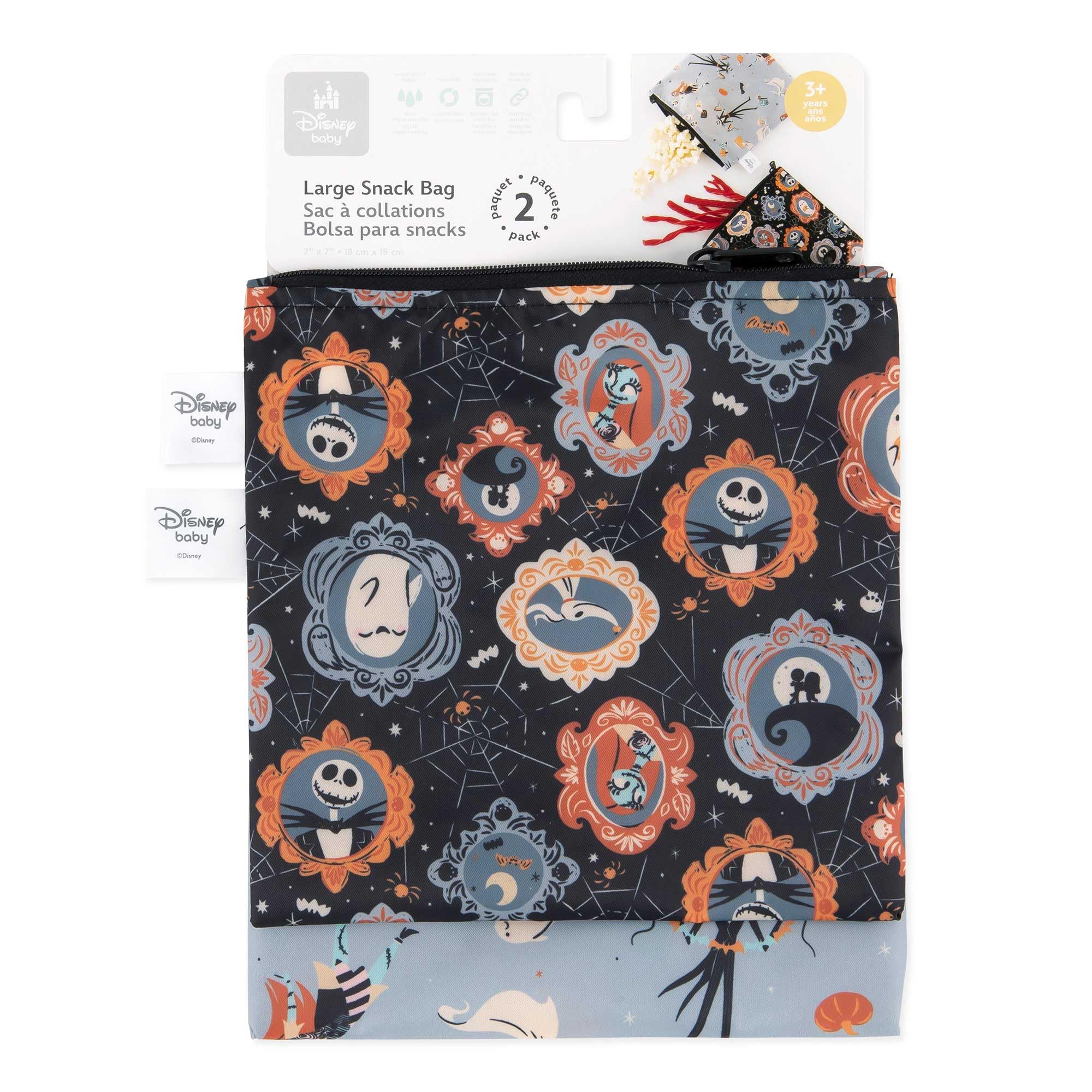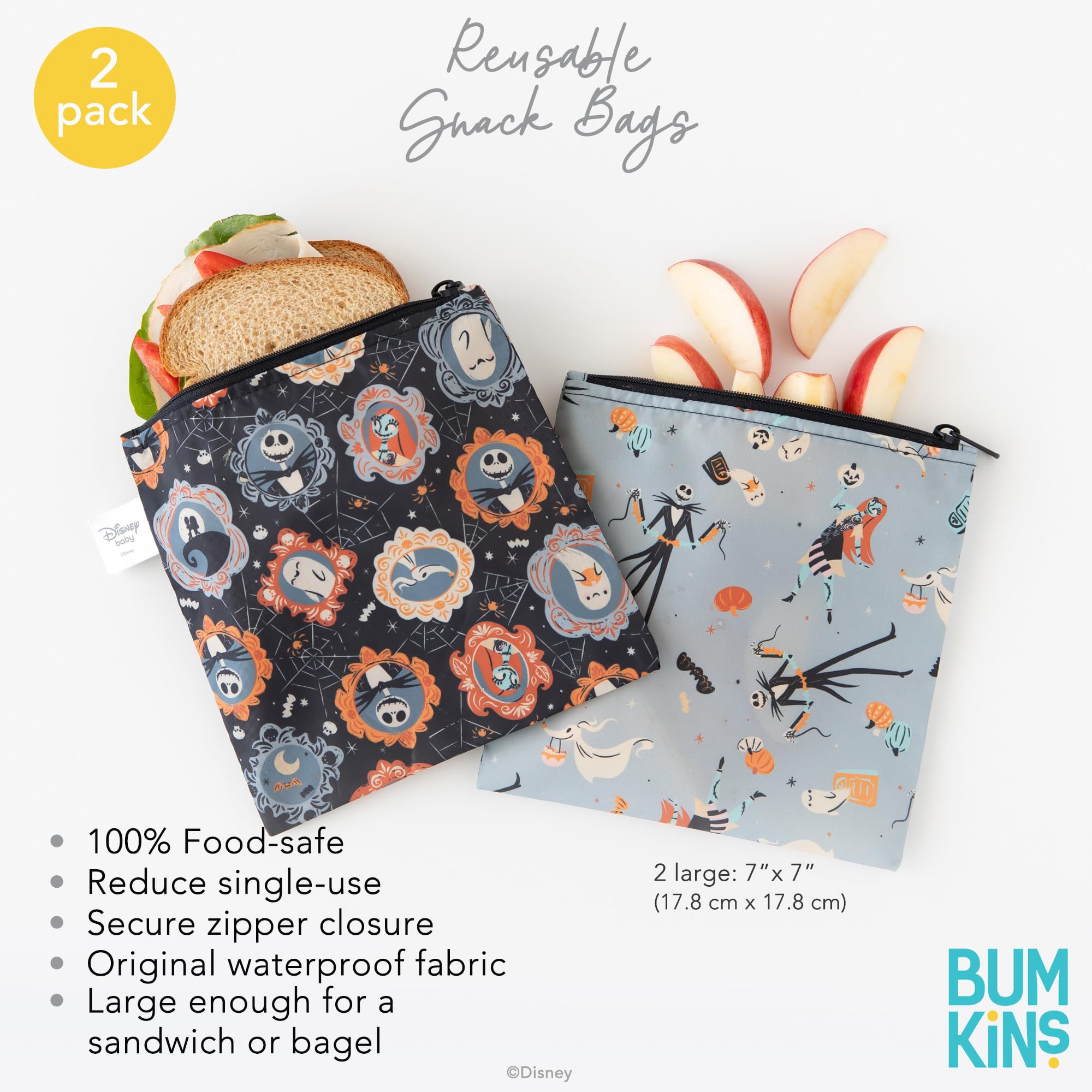 Hide your tricks and stash your treats with in Disney's Nightmare Before Christmas snack bags by Bumkins. A smart alternative to single-use plastic bags, our reusable sandwich and snack bags are made from Bumkins’ original easy-wipe waterproof fabric. Reusable cloth bags help reduce waste from plastic bags and takeout containers. By packing lunches and snacks, you can stay on budget, ensure foods are allergy-free and adhere to dietary restrictions, plan healthier options. Not just for food—snack bags make excellent organizers for storage and travel! Stash inside a lunch bag, purse, diaper bag, or travel bag. Our reusable bag has a strong and durable zipper closure that keeps in crumbs, and the single-ply fabric means no worrying about icky stuff growing between layers of extra material. It’s lightweight and lays flat, so when traveling it takes up less space when empty. Machine washable. Measures approximately 7in x 7in (17.78 cm x 17.78 cm), it’s large enough to fit a sandwich or bagel. We use third party labs to ensure the products we manufacture comply with CPSC and CPSIA standards for BPA, Lead, and Phthalates. Tested for Small Parts according to 16 CFR 1500.50 – Results: No small parts.