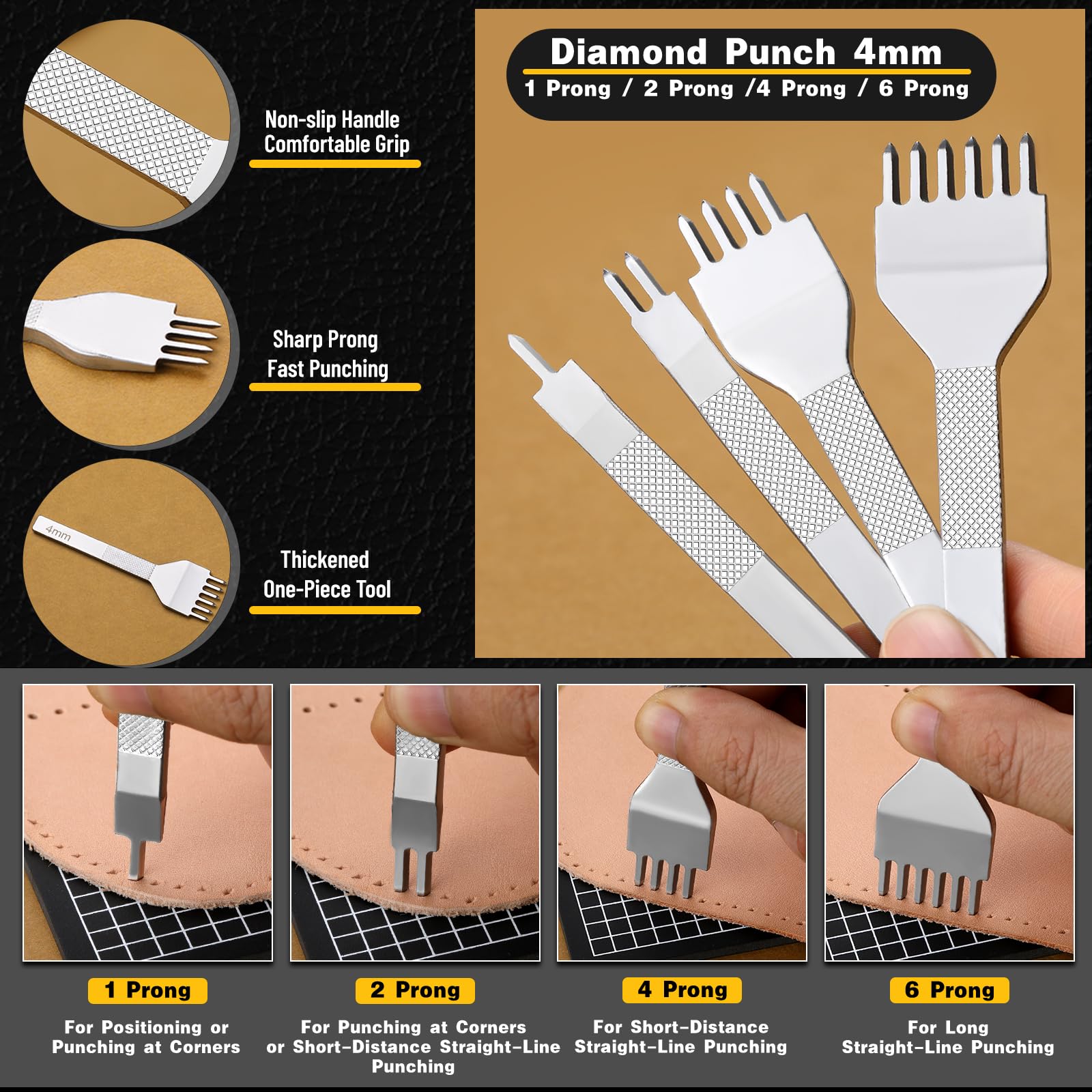 LACING STITCHING CHISEL SET: These 1/2/4/6 leather chisel punches are made of high-quality steel for reliable performance, rust and corrosion resistance, and durability. After fine polishing, the handle is comfortable and the punch tip is sharp. Each punch stitching hole tool has a sharp, well-defined prong to help punch quickly, which can create clean and accurate holes to make your stitches even and beautiful.