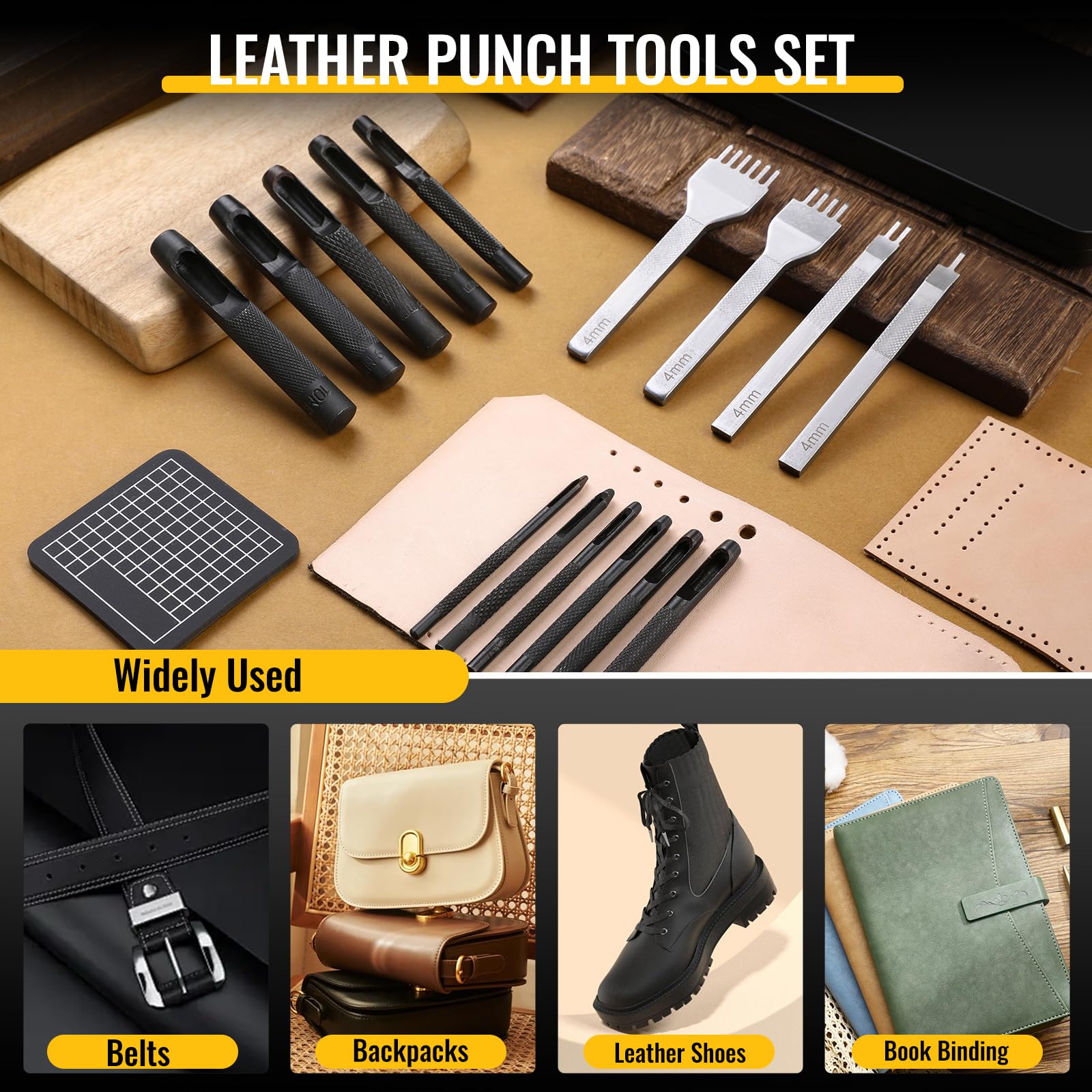 LEATHER PUNCH SET: You will get a 4mm 1/2/4/6 leather stitching punches set, 11 hollow punches with different sizes, a cutting mat, and a black metal box. This is a very practical stitching punch set. All the leather punch tools are packed in a metal box, which is neatly stored and easy to carry.