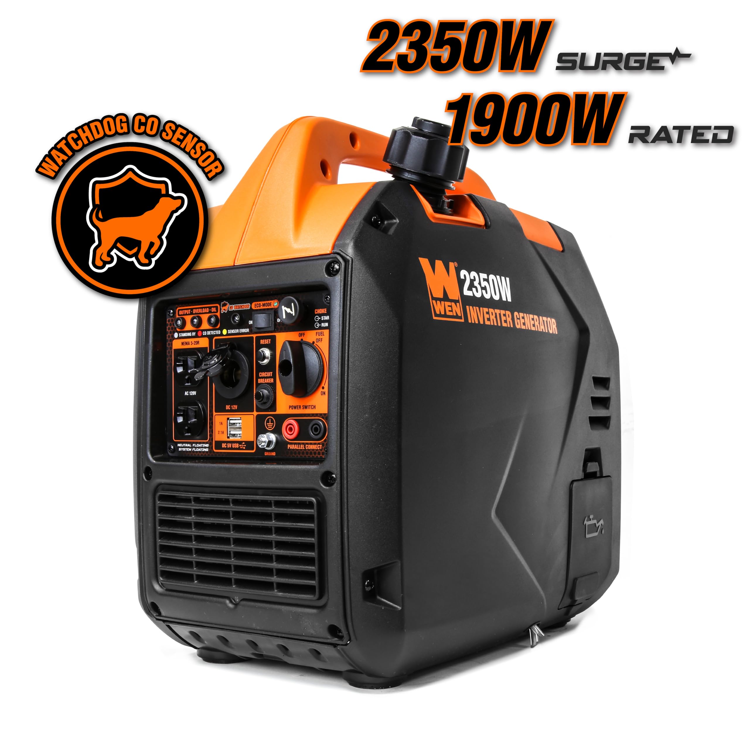 Remember when you had clean and quiet portable power? The WEN 2350-Watt Inverter Generator provides clean energy, free of voltage spikes and drops, without all the noise of a regular generator. Produce up to 2350 surge watts and 1900 rated watts of power. The WEN Watchdog CO Shutdown Sensor helps protect both you and your family by automatically turning off the generator if dangerous levels of carbon monoxide are detected. Our 79cc 4-stroke OHV engine operates at an extremely quiet 51 decibels at quarter load, quieter than a window air conditioner or the average conversation. This limits its invasiveness while camping, hunting, tailgating, and restoring backup power. The WEN 2350W Inverter Generator is also equipped with fuel shutoff. This feature turns off the flow of fuel, allowing for the generator to use up the remaining fuel from the carburetor before automatically shutting down. This helps fight the build-up and blockages caused by stagnant fuel inside of the carburetor, minimizing maintenance while prolonging the unit’s lifespan. Designed to mirror a pure sine wave, this generator limits total harmonic distortion to under 0.3 percent at no load and under 1.2 percent at full load, making it safe to run laptops, cellphones, monitors, tablets and other sensitive electronics. The lightweight 39-pound design makes for easy portability while the ultra-efficient one-gallon tank provides over 5.7 hours of half-load run time. The fully-packed panel comes equipped with two three-prong 120V 14A NEMA 5-20R receptacles, one 12V 8.3A DC receptacle and two 5V USB ports. Maximize fuel economy by engaging the eco-mode switch. This allows the generator's engine to automatically adjust its fuel consumption as items are plugged into and unplugged from the panel, preventing the unnecessary usage of gasoline. Need more energy? Easily link up any two WEN inverter generators using a WEN Parallel Connection Kit (sold separately) in order to share wattage amongst multiple units. Low-oil and low-fuel automatic shutdown combine with the built-in overload protection and indicator lights to safeguard both your generator and your electronics from damage. And because this is a WEN Product, your inverter generator comes backed by a 2-year warranty, a nationwide network of skilled service technicians and a friendly customer helpline. Remember when your generator powered your electronics safely and quietly? Remember WEN.