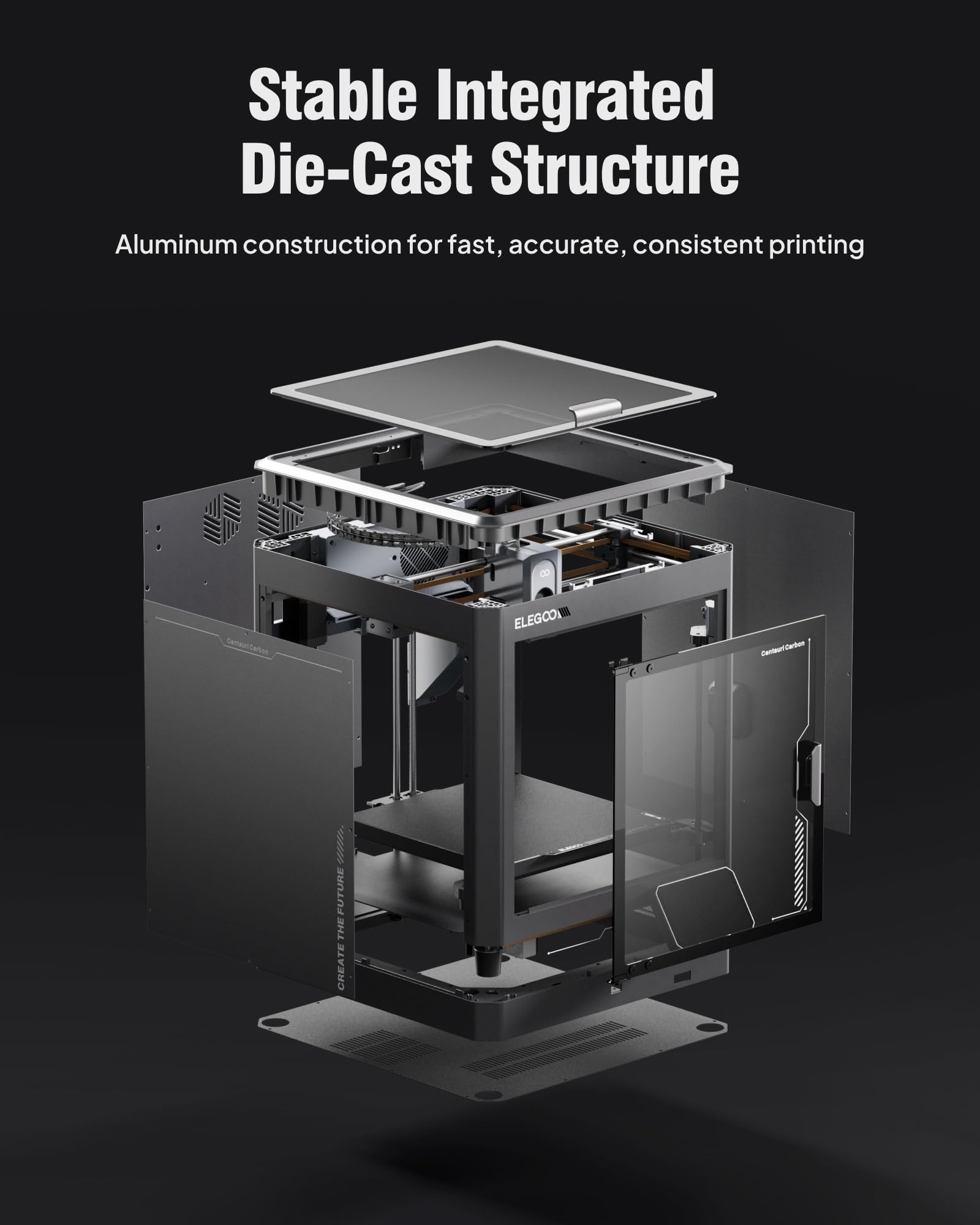 Rock-Solid Die-Cast Frame for Precision: Centauri Carbon 3D printer features a rigid, integrated die-cast aluminum frame that minimizes vibrations and maintains exceptional stability, even at high speeds. Combined with automatic vibration compensation and pressure advance, it ensures smooth first layers, and consistent, high-quality prints