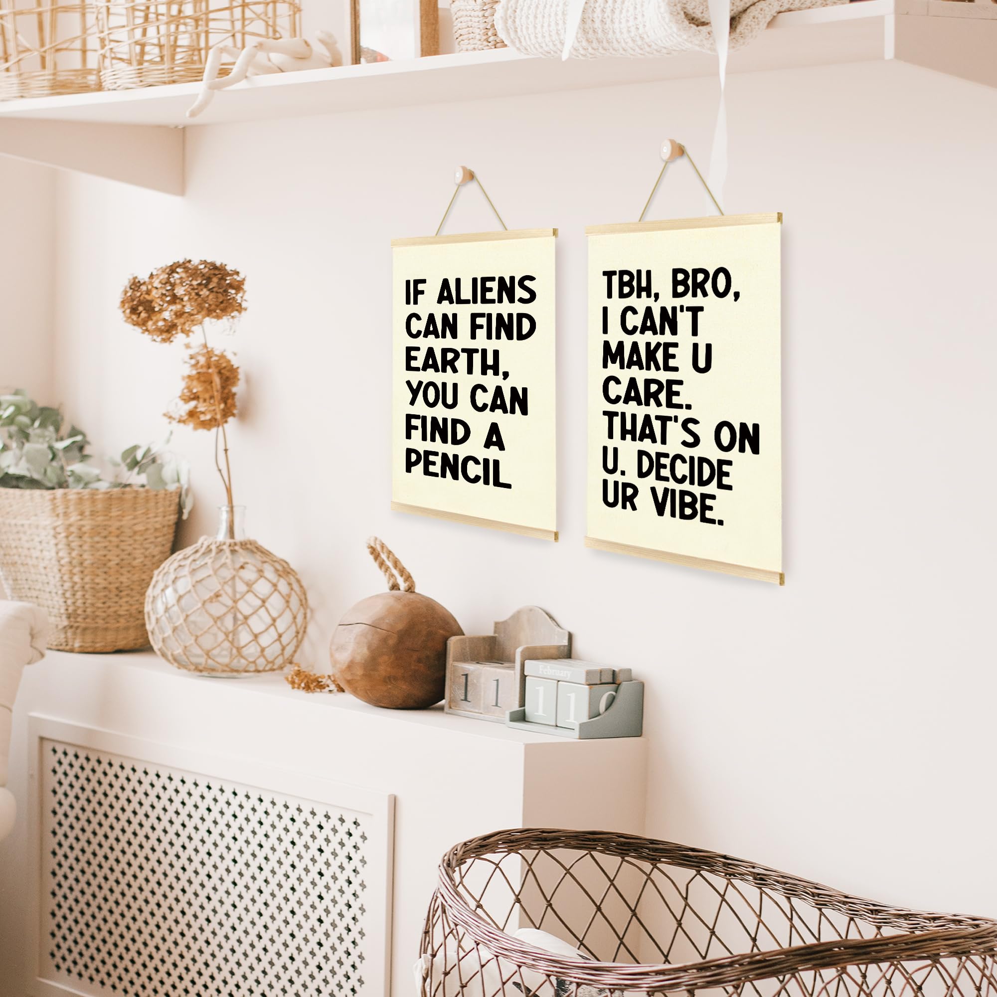 Printed on natural linen fabric with solid wood bars on top and bottom. The wooden frame provides durability, and the linen material enhances the overall aesthetic appeal.