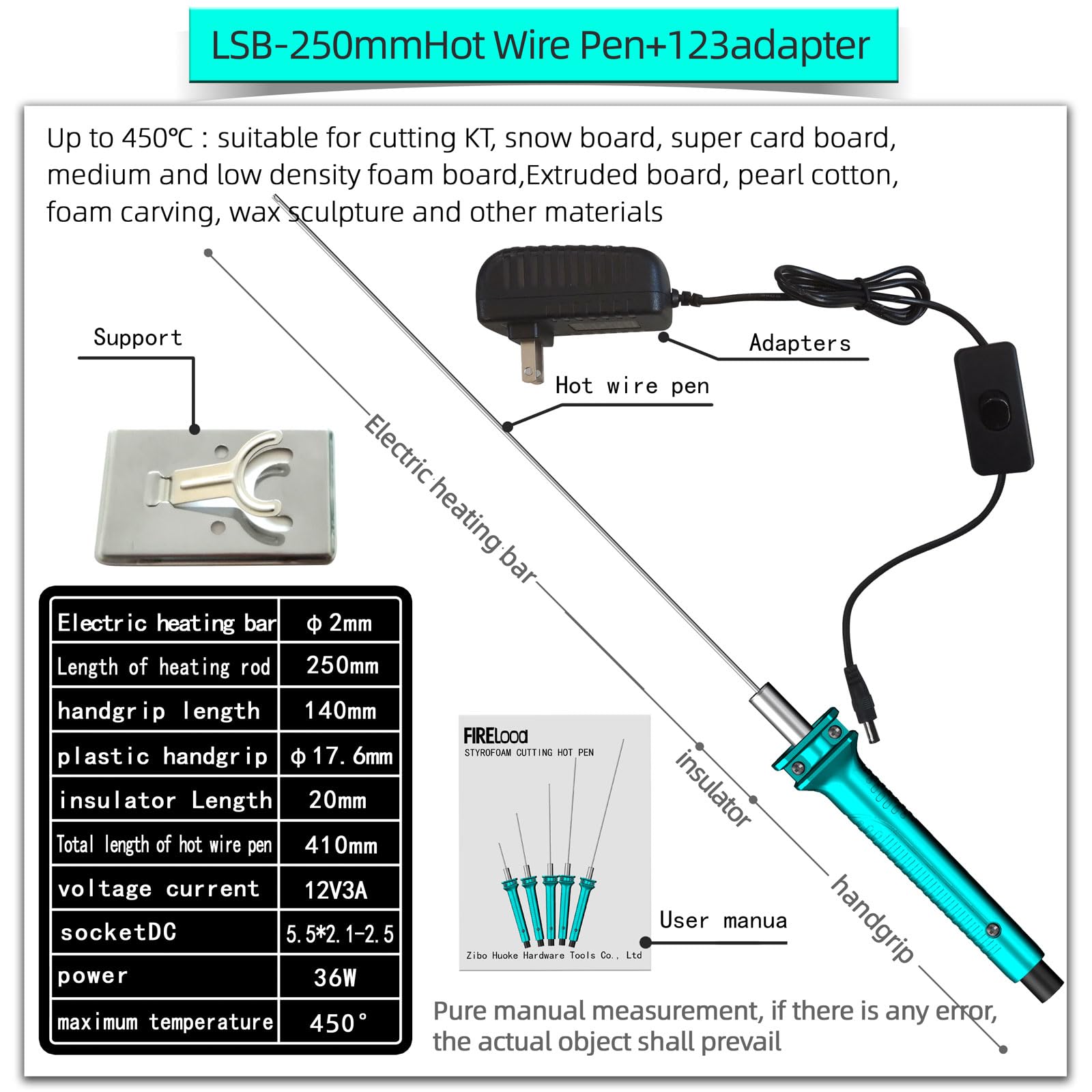 MULTIFUNCTIONAL STYROFOAM CUTTING HOT PEN:electric foam cutting machine pen 25CM with adaptor,It can cut and carve foam board, kt board, pearl cotton, chemical fabric and other melting materials.ideal for low density styrofoam,Hot Wire Pen is art model making,students handmade practise,advertising words making,creative modela very suitable tool. The hot wire cutter kit includes, a hot wre pen a 12V adapter, a metal holder, and a manual.
