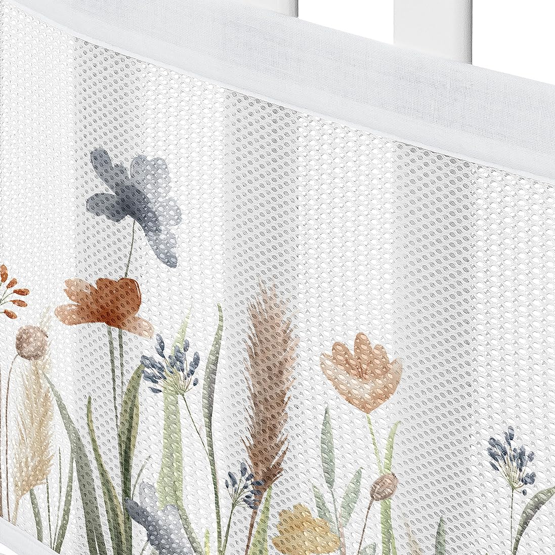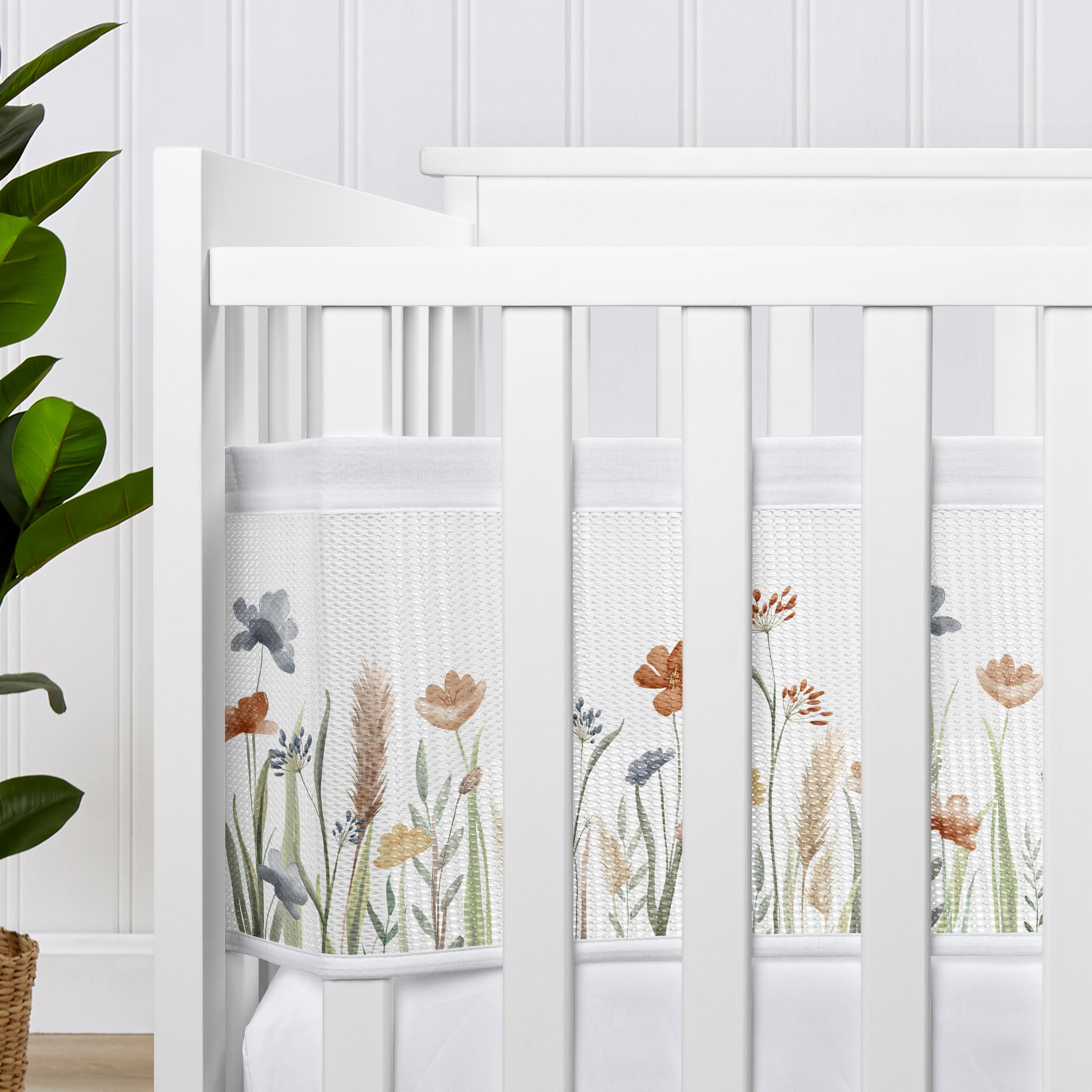 This mesh crib liner features a wildflower garden floral flowers print with complimentary color palette from the matching Sweet Jojo Designs Watercolor Floral Garden bedding collection of sage green beige blue rust orange and taupe.