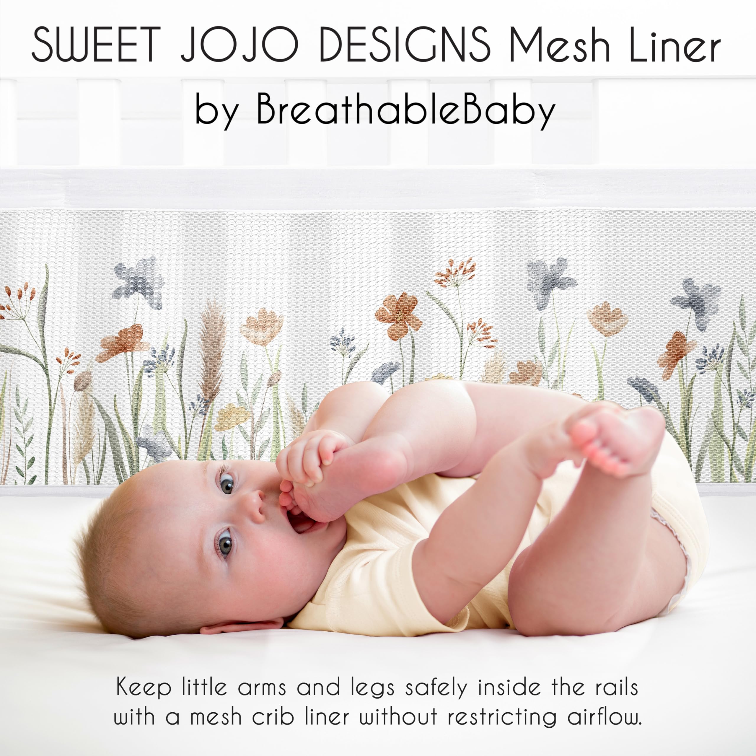Mesh crib liners are essential for providing the ideal solution to a painful and disruptive problem: helps keep arms and legs safely inside the crib without the risk of restricted airflow. And, as an added bonus, besides perfectly matching your Sweet Jojo Designs baby bedding set, mesh liners also provide a visual shield to help provide a more peaceful night's sleep. Not to mention, they keep pacifiers inside and within reach!