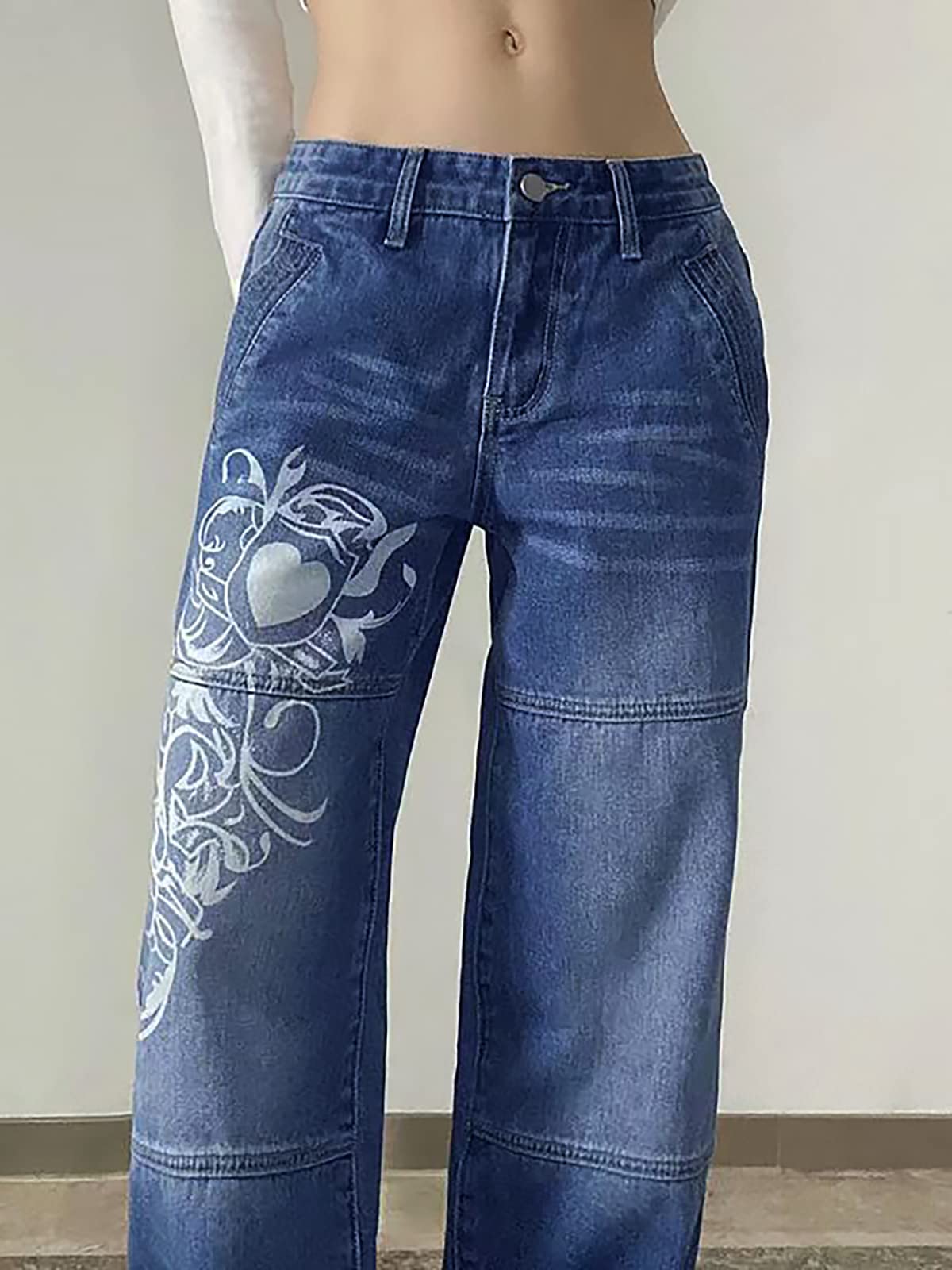 Customized size and material, our Low Rise Heart Pattern Baggy Jeans are only sold in XinruiUS !!! The other will not really deliver Design: Low rise waistline, wide straight leg, basic 4 pockets, button fly, zipper closure