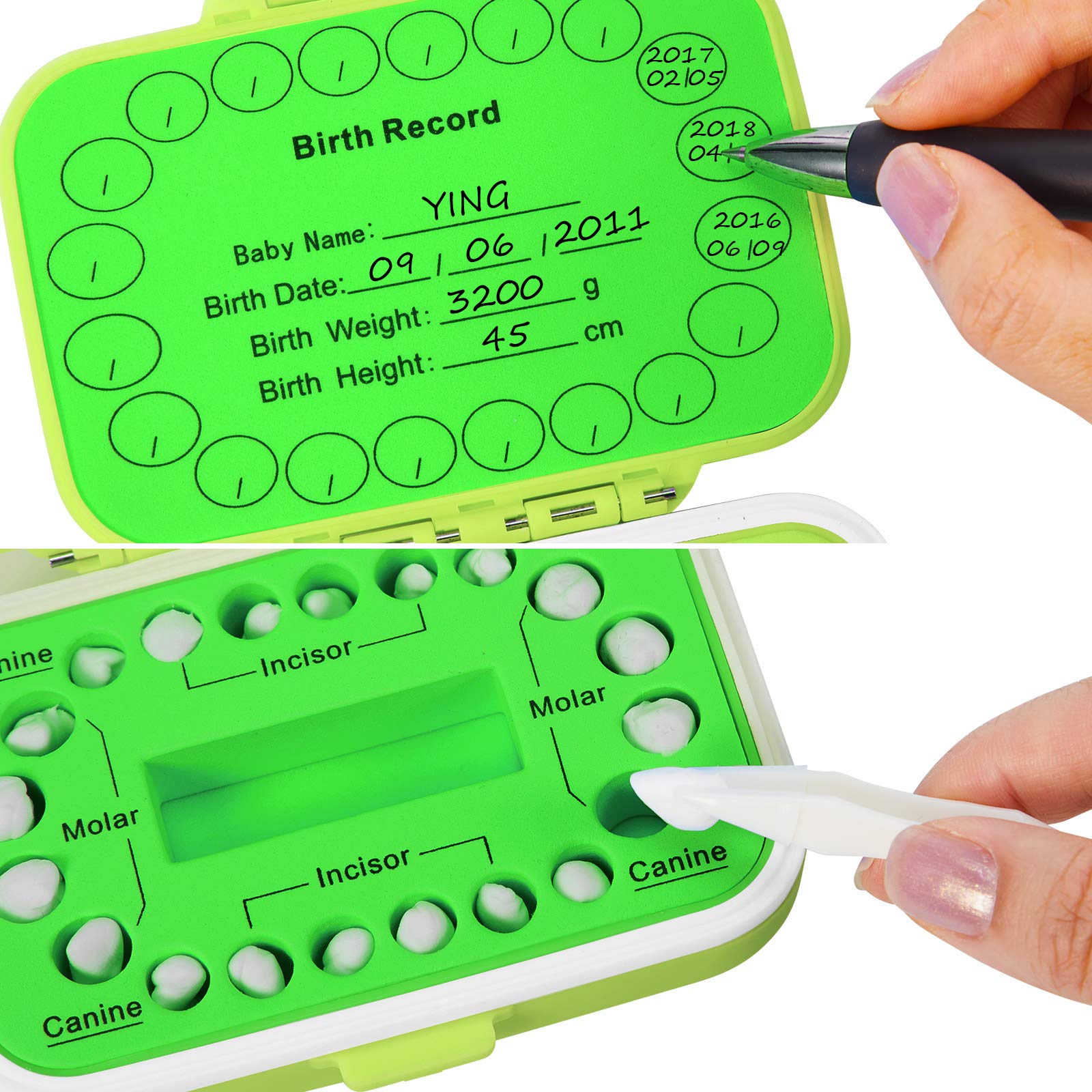 Package includes: you will get 1 piece baby teeth keepsake box in green, coming with 1 piece tweezer and 1 piece transparent baby fetal hair container; It's a nice set for you to keep the child's memory