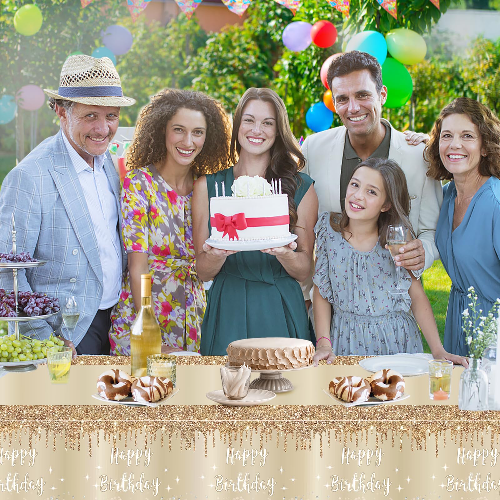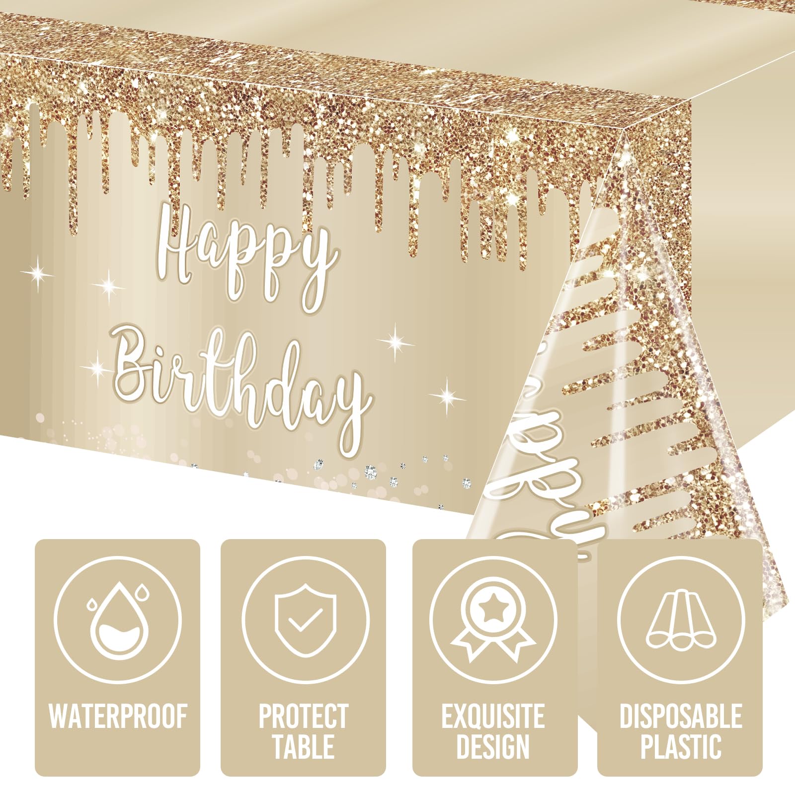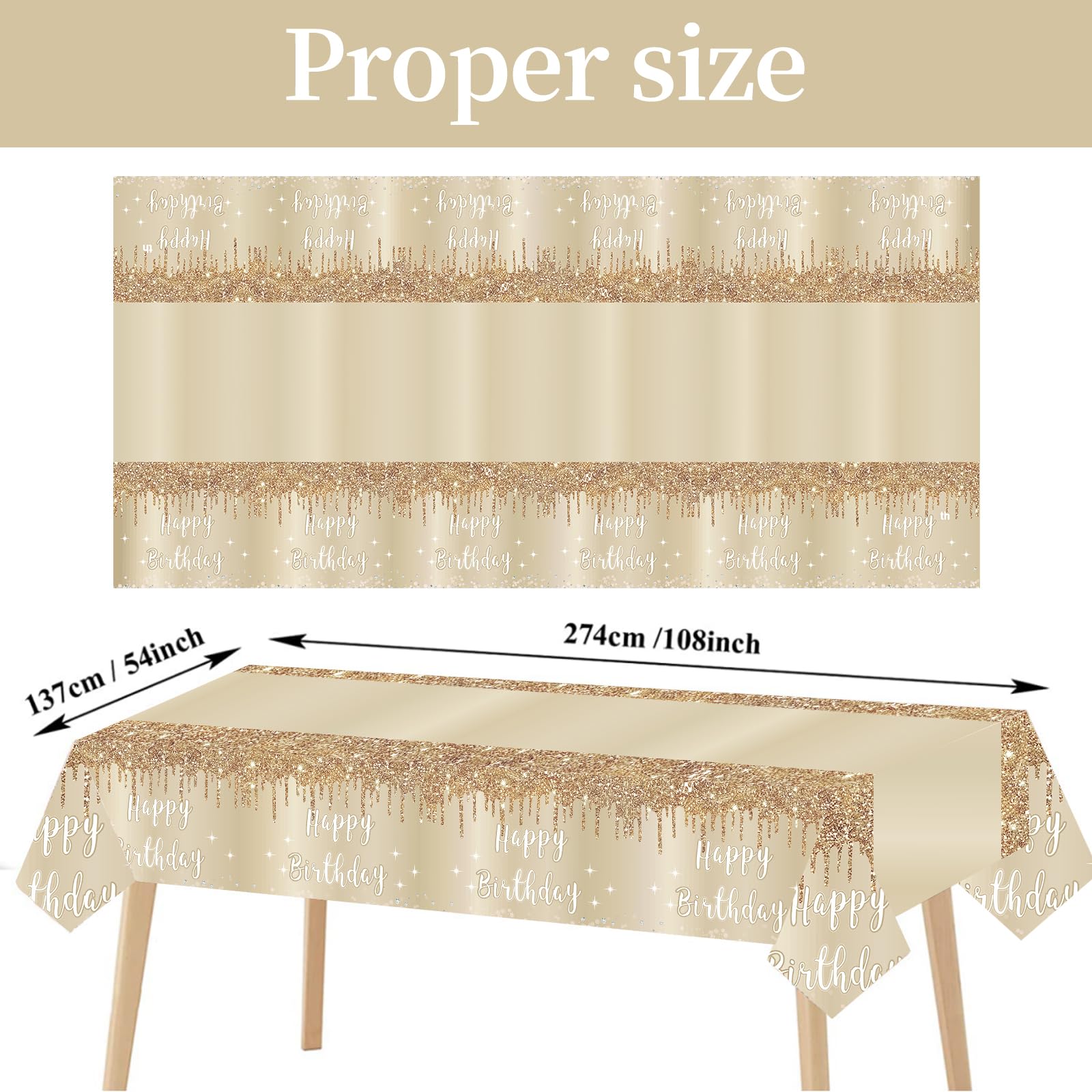 [Reusable] - This gold birthday table cover is lightweight and durable, with clear printing and no fading. You can easily clean it with a cloth after use, dry it and fold it up for reuse.