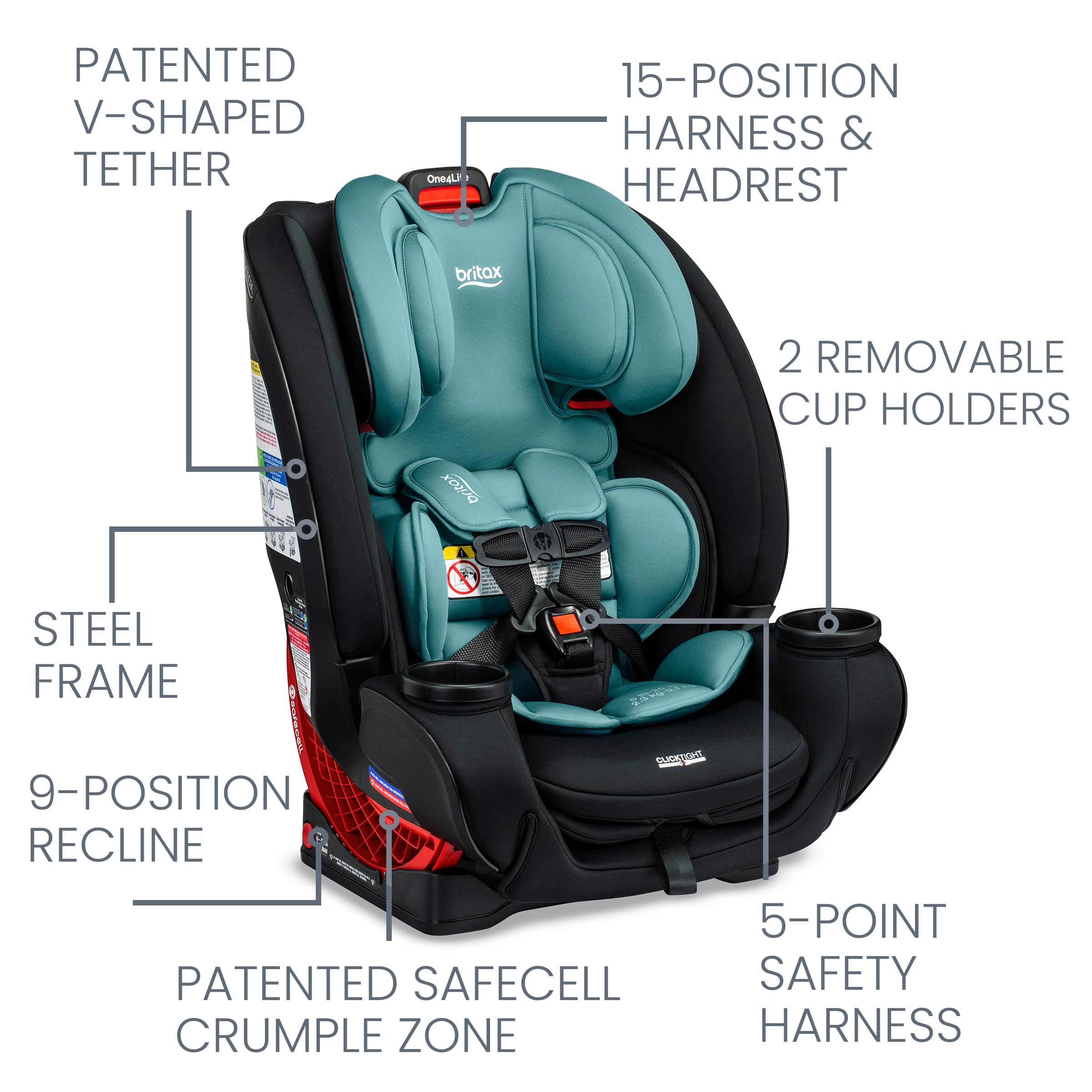 Enjoy safe travels from birth to big kid with the Britax One4Life all-in-one car seat. This car seat features 4 configurations, including rear facing infant car seat, rear facing toddler car seat, forward facing 5 point harness car seat, and forward facing high back booster seat. Start with the rear facing car seat for infants and toddlers, then graduate to the forward facing car seat and booster car seat for preschoolers and big kids. ClickTight technology makes it easy to install your new baby car seat with confidence. Simply open the seat, follow the path to thread the seat belt, buckle it, and click the seat closed. The One4Life all in one car seat is outfitted with a high-strength steel frame, a SafeCell crumple zone, and a patented V-shaped tether. The protective seat shell and foam-lined headrest help absorb impact energy and are designed to help keep your child's head, neck, and body safe. Adjust the 15-position headrest and no-rethread harness at the same time, so you can find a secure fit in seconds. Quickly adjust between 9 recline positions and use the easy-read level indicators to find the correct angle. The Britax One4Life comes with an easy-to-remove, machine-washable cover, and the knit construction is naturally flame-retardant.