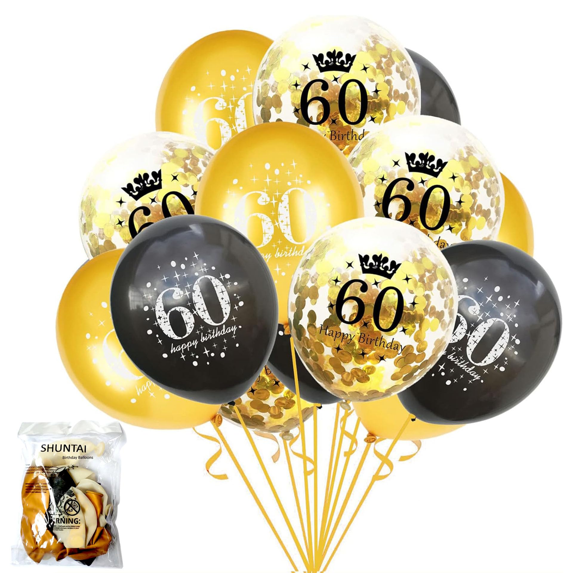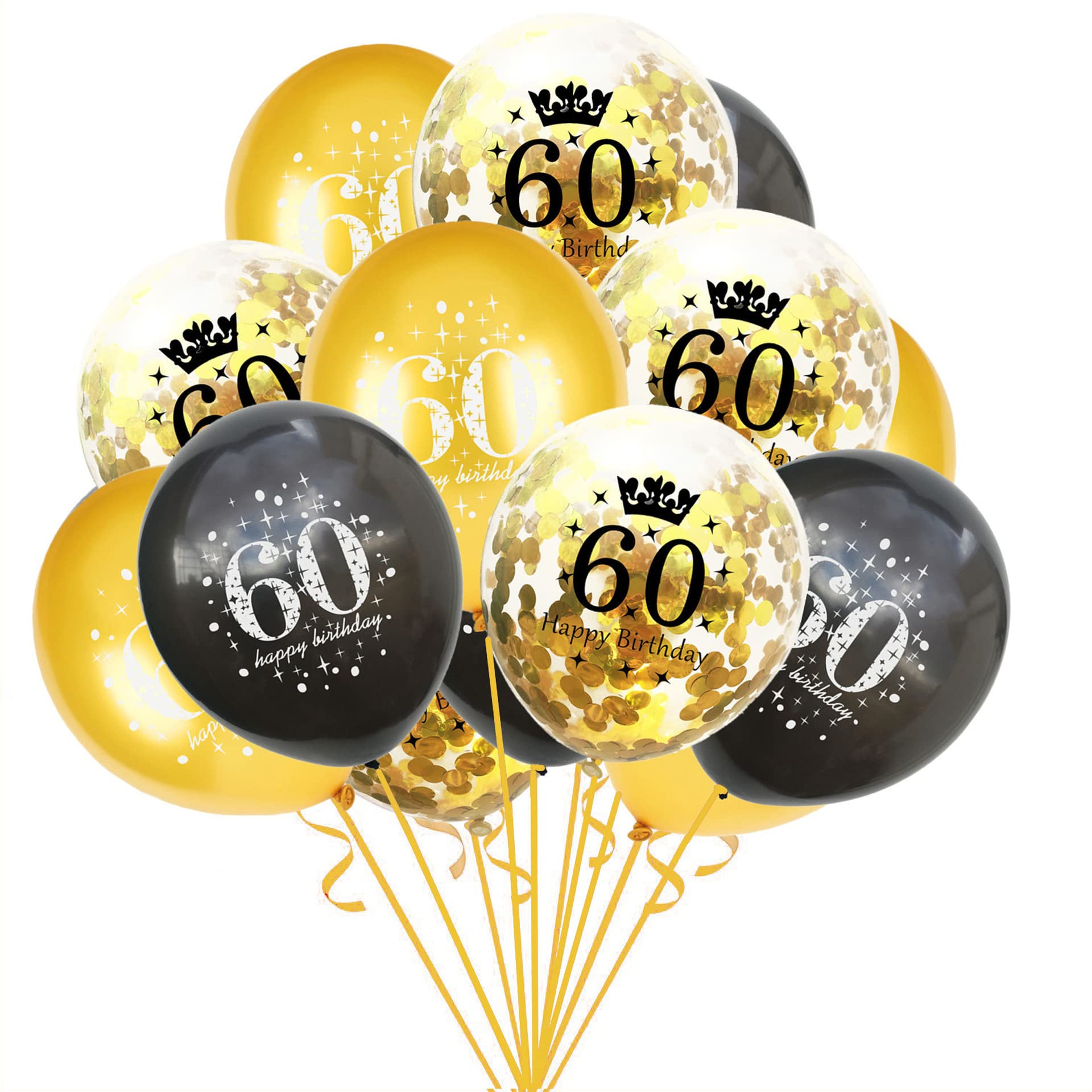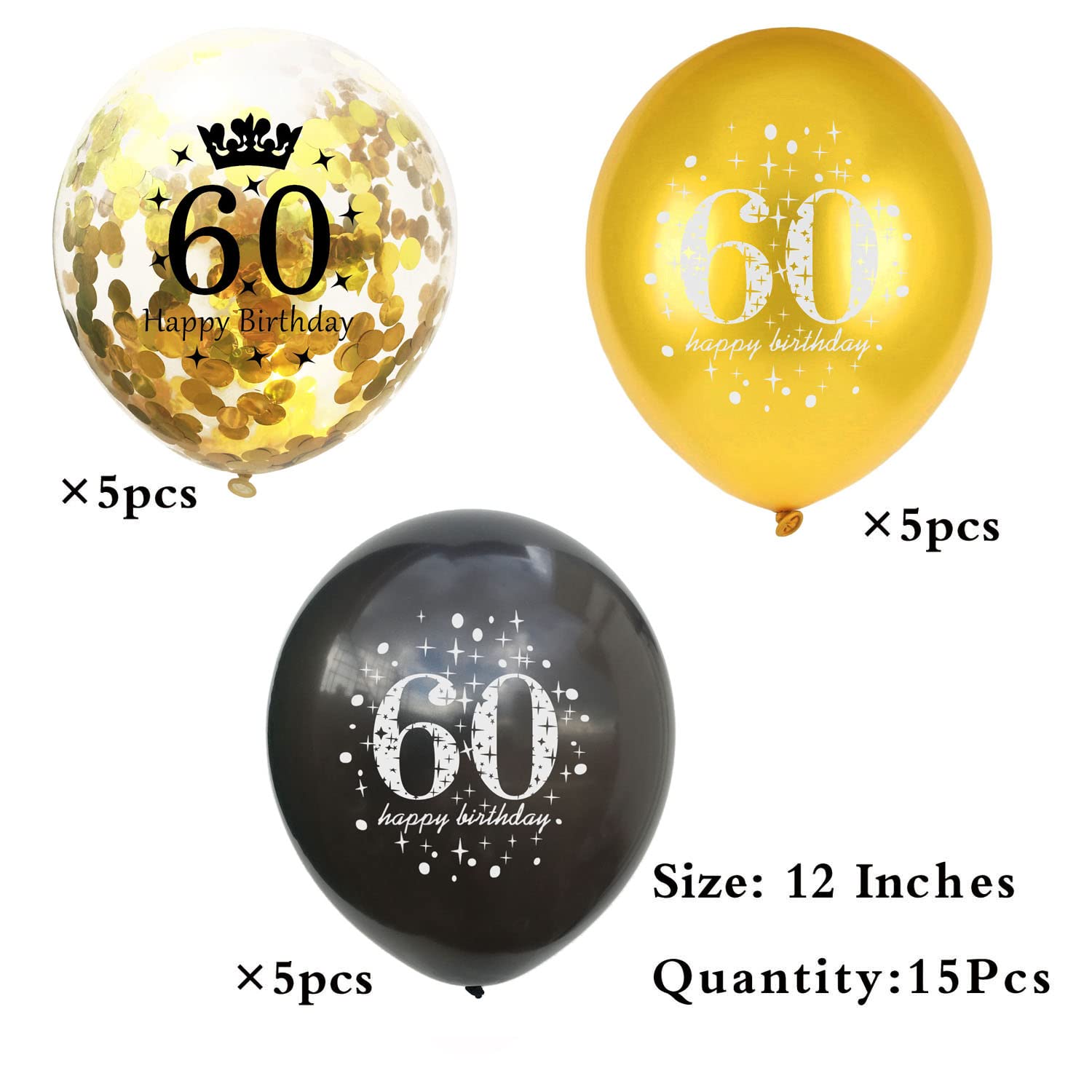 Package:5 pieces 12 inch black latex balloon printed with the words "60 Happy Birthday", 5 pieces 12 inch gold latex balloon printed with the words"60 Happy Birthday",5 piece 12 inch gold confetti balloons printed with the words"60 Happy Birthday", very suitable for 60th birthday party decorations