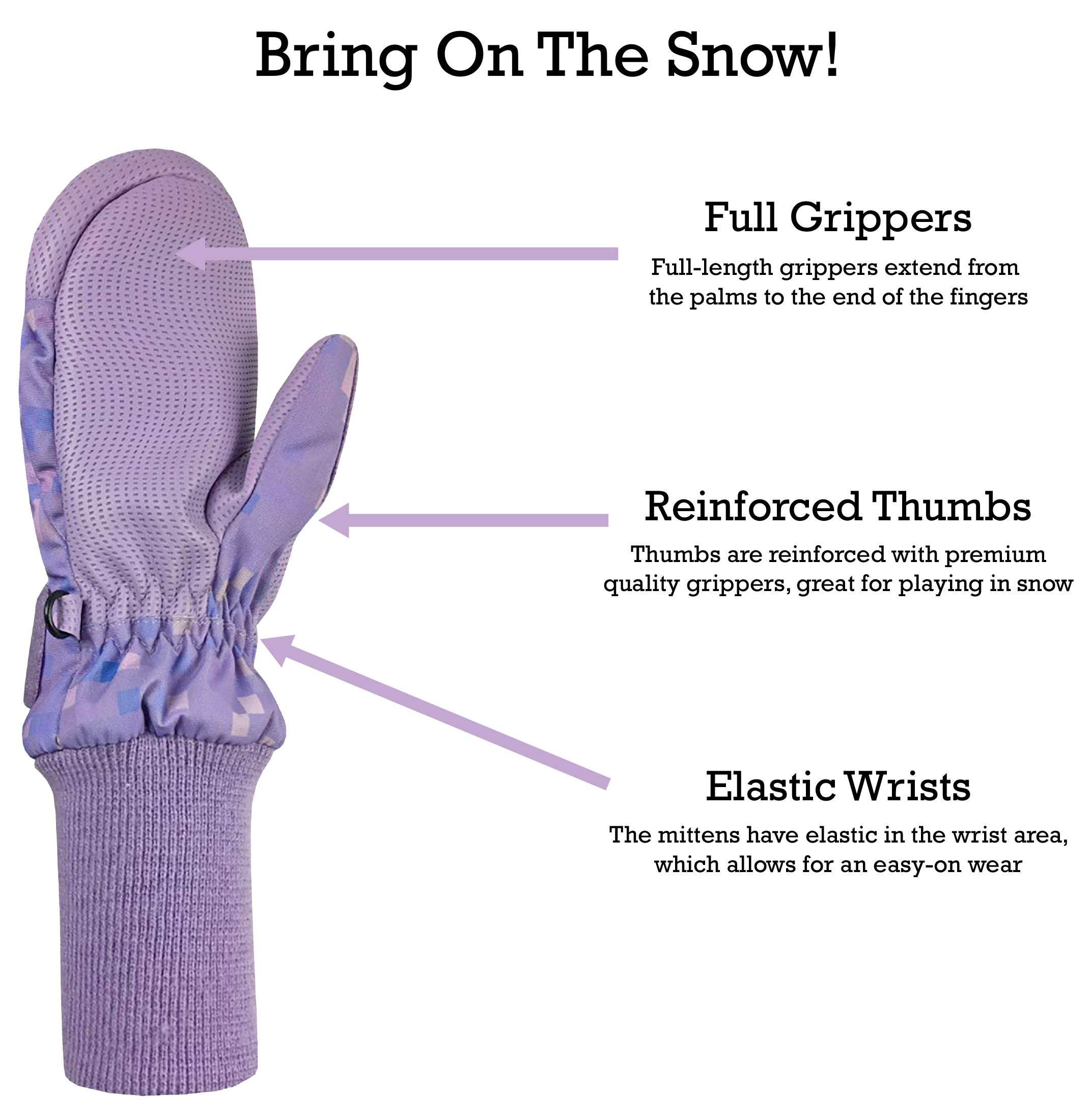 BRING ON THE SNOW! Your little girls, boys, toddlers and infants will love playing in the snow wearing these warm and high quality kids insulated winter mittens. The childrenβs winter gloves have a grippy palm area as well as grippers on the thumbs, which makes them well suited for playing in the snow and other cold weather activities.