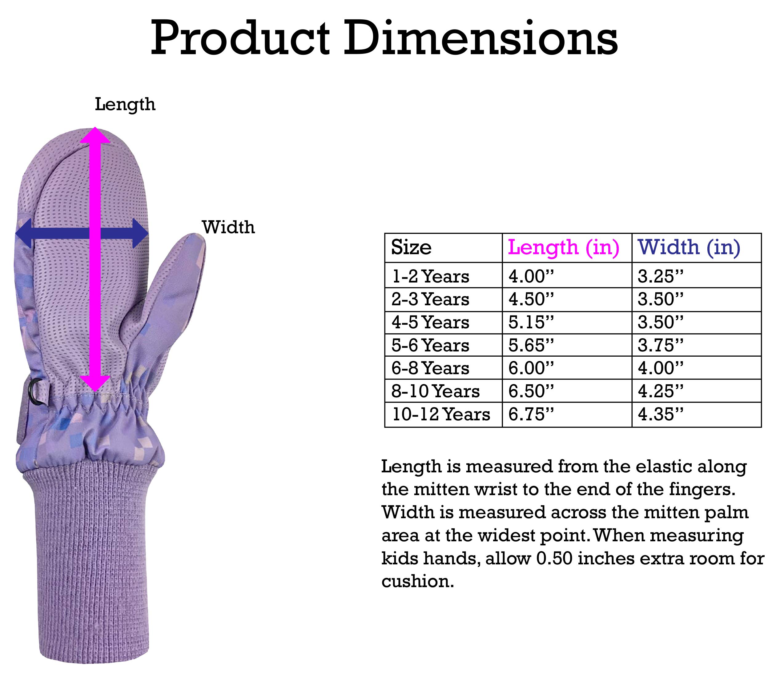 PRODUCT DIMENSIONS: Length (L) is measured from the elastic along the mitten wrist to the end of the fingers; Width (W) is measured across the mitten palm area at the widest point: 1-2 years (4.0" L, 3.25" W); 2-3 years (4.5" L, 3.5" W); 4-5 years (5.15" L, 3.5" W); 6-8 Years (6.0" L, 4.0" W); 8-10 Years (6.5" L, 4.25" W). When measuring kids hands, allow 0.5 inches extra room for cushion.
