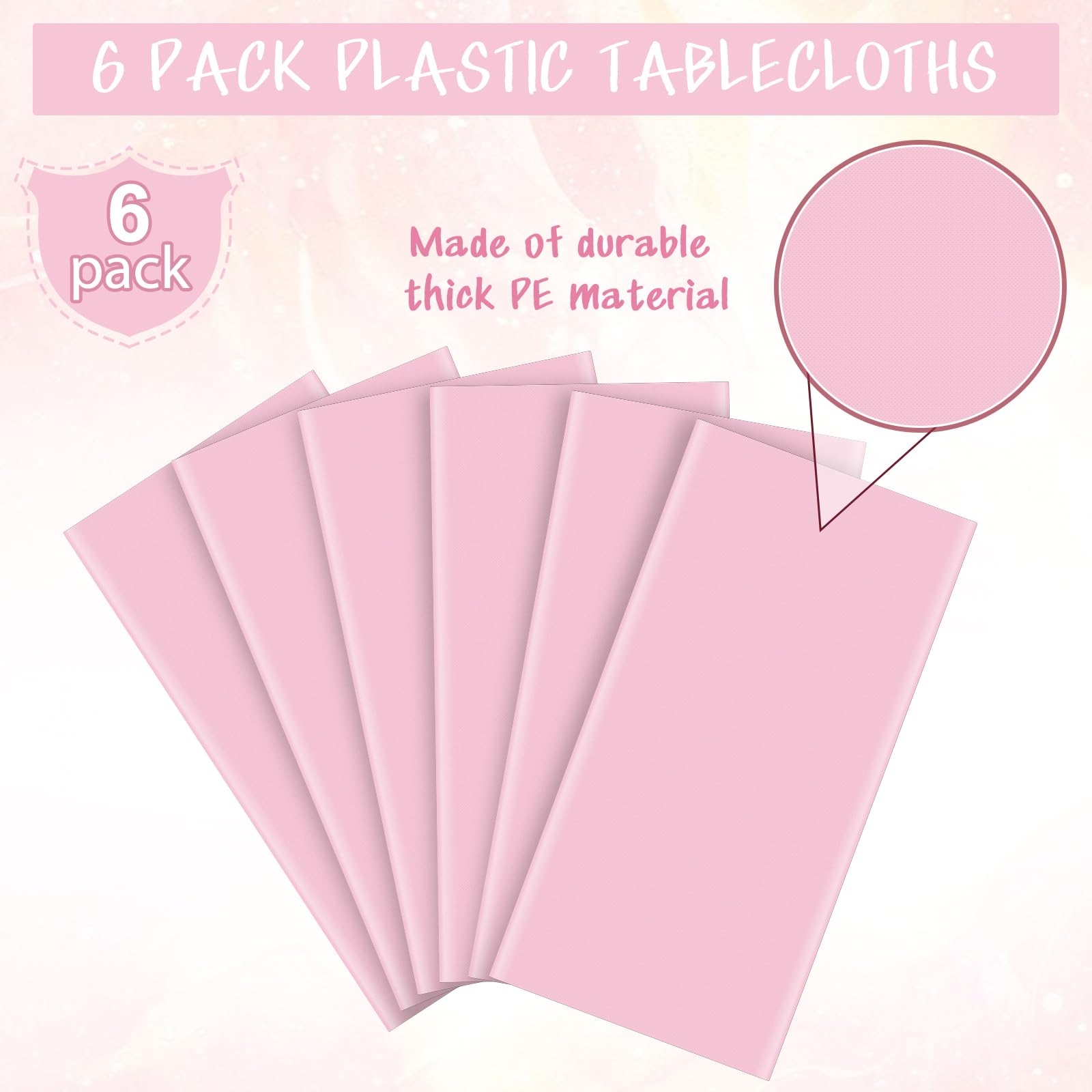 Packing Include: you will receive 6 pieces of plastic table cloth disposable for rectangle tables in light pink,this disposable tablecloth each measures 54×108 inches,which fits for most rectangle tables of 8-10 seats,sufficient quantities can meet your use and replacement needs.
