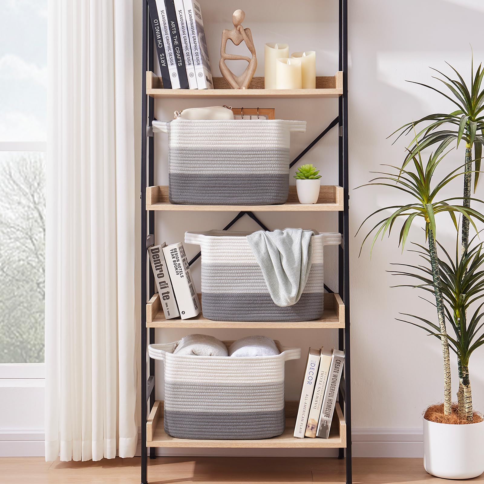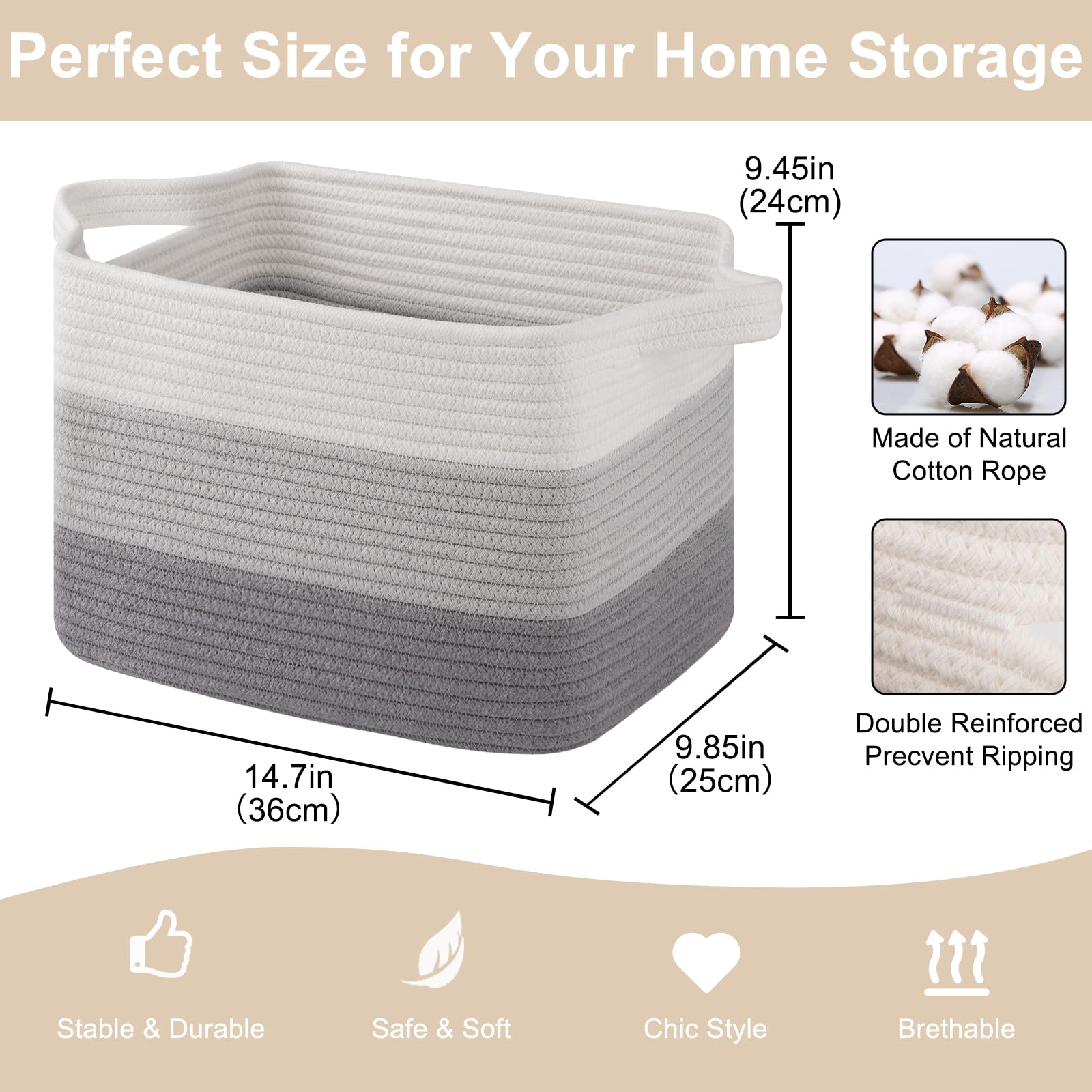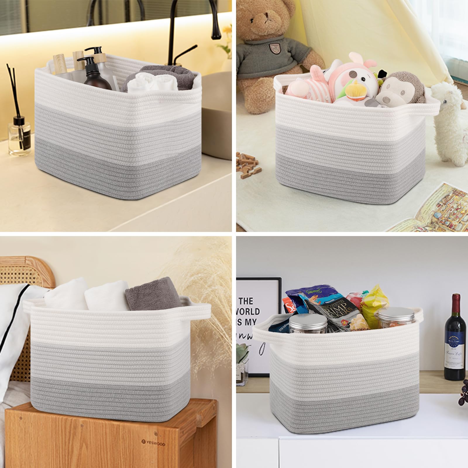 Soft and Durable: Our shelf baskets are meticulously handcrafted from high-quality natural cotton rope that's ultra-soft and durable. No odor or sharp corners, making it safe for babies, and won't scratch your furniture and floor. Ideal for nurseries and playrooms