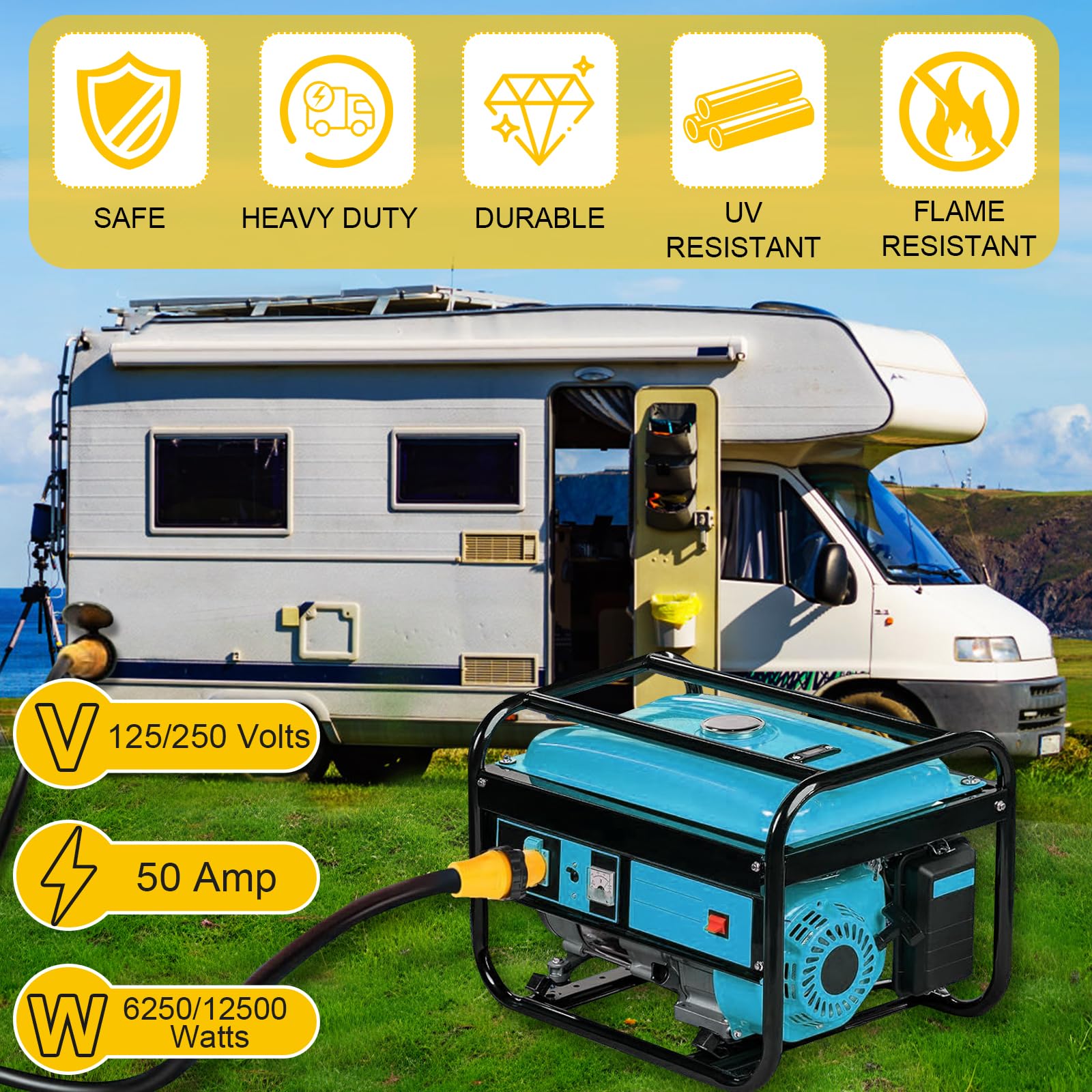 【Wide Range of Applications】This adapter is used in RVs, boats and homes; connect the NEMA 14-50P male plug to the 50 amp generator output and the SS2-50R female connector to the RV/boat/home for power