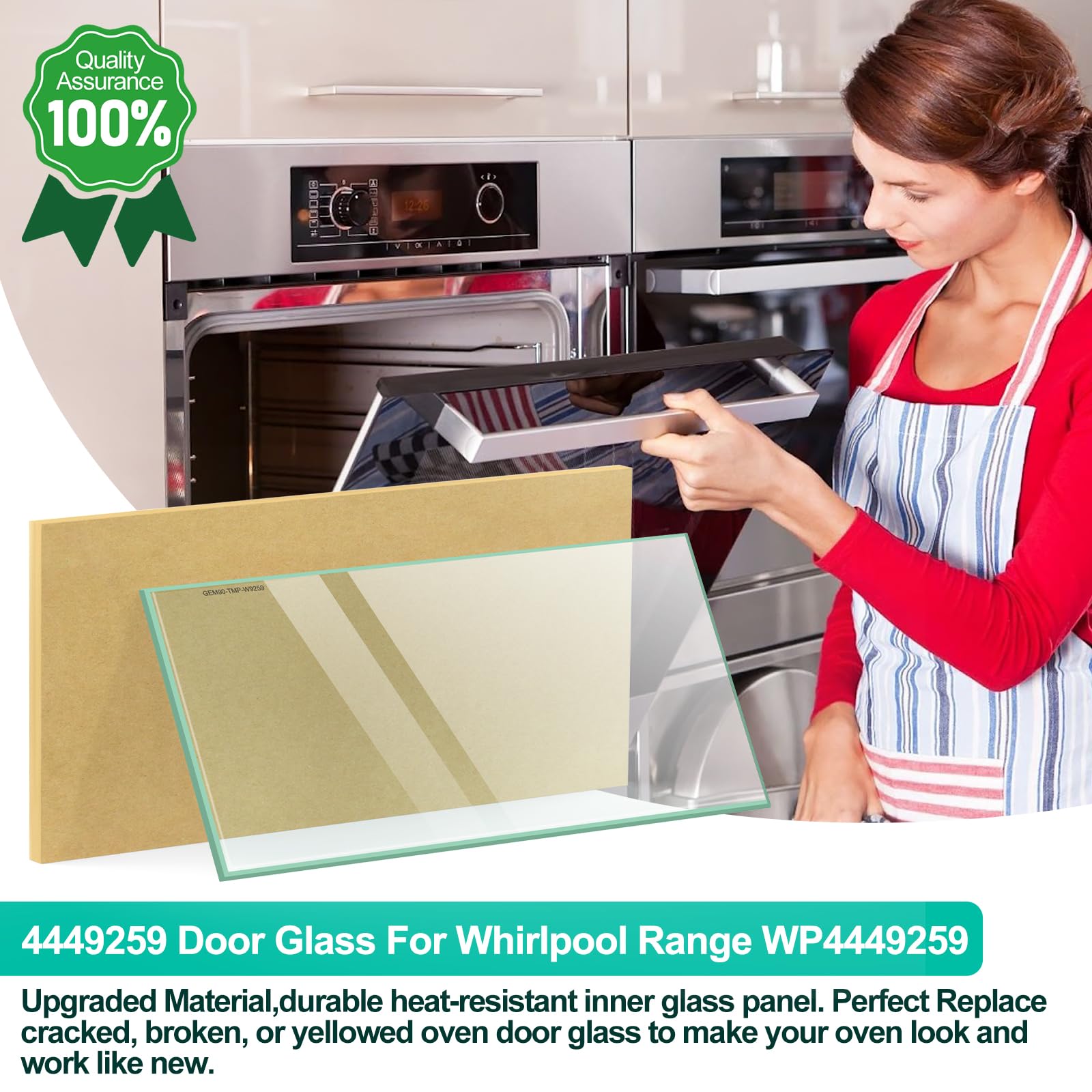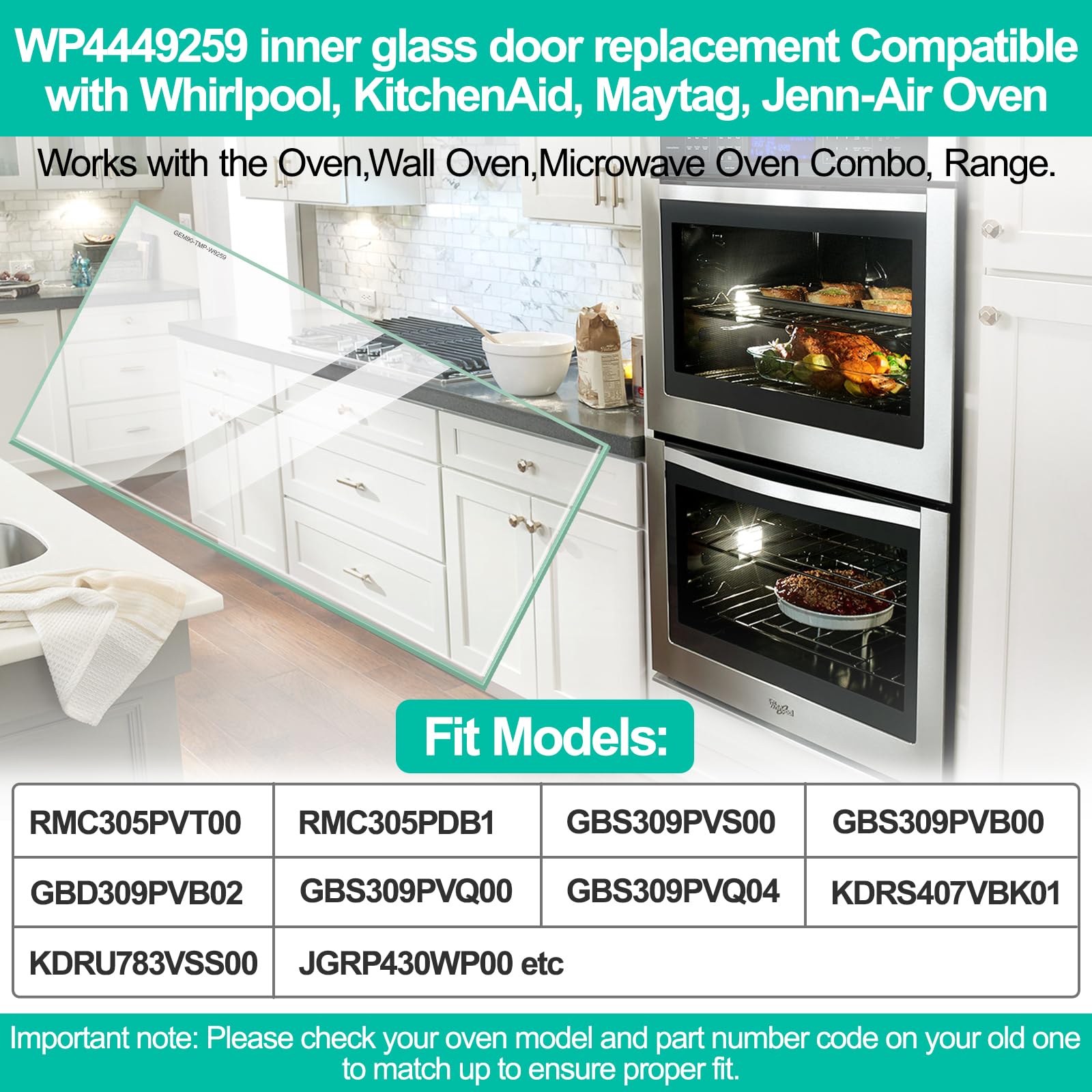 【Wide Compatibility of wp4449259 Oven Inner Door Glass】WP4449259 inner glass door replacement compatible with Whirlpool, KitchenAid, Maytag, Jenn-Air oven parts. Works with the following products: Electric Oven/ Wall Oven/ Built-In Oven/ Microwave Combo/ Range. Fit models: RMC305PVT00, RMC305PDB1, GBS309PVS00, GBS309PVB00, GBD309PVB02, GBS309PVQ00, GBS309PVQ04, KDRS407VBK01, KDRU783VSS00, JGRP430WP00...more compatibility, please check our product page.