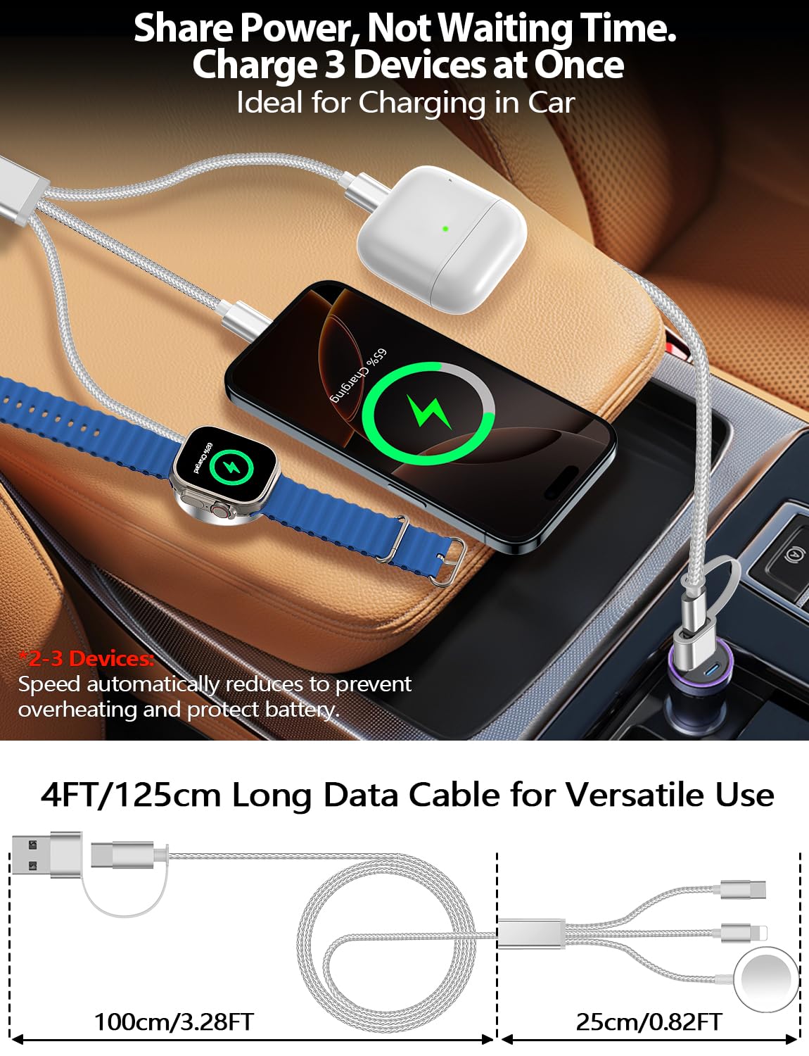 【Portable Travel Camping Essentials&Car accessories】This 1.25M/4ft 3 in 2 charging cable is convenient to carry around with lightweight and portable design.It fits seamlessly into travel vocation essentials like bags and suitcases so it is a perfect choice when going on holiday,business trip,travel,office,dorm life,apartment living, college campuses,and hiking adventures. Ideal for charging in car,Charge iPhone, iWatch, and USB A to C cable-compatible devices simultaneously—no adapters needed.