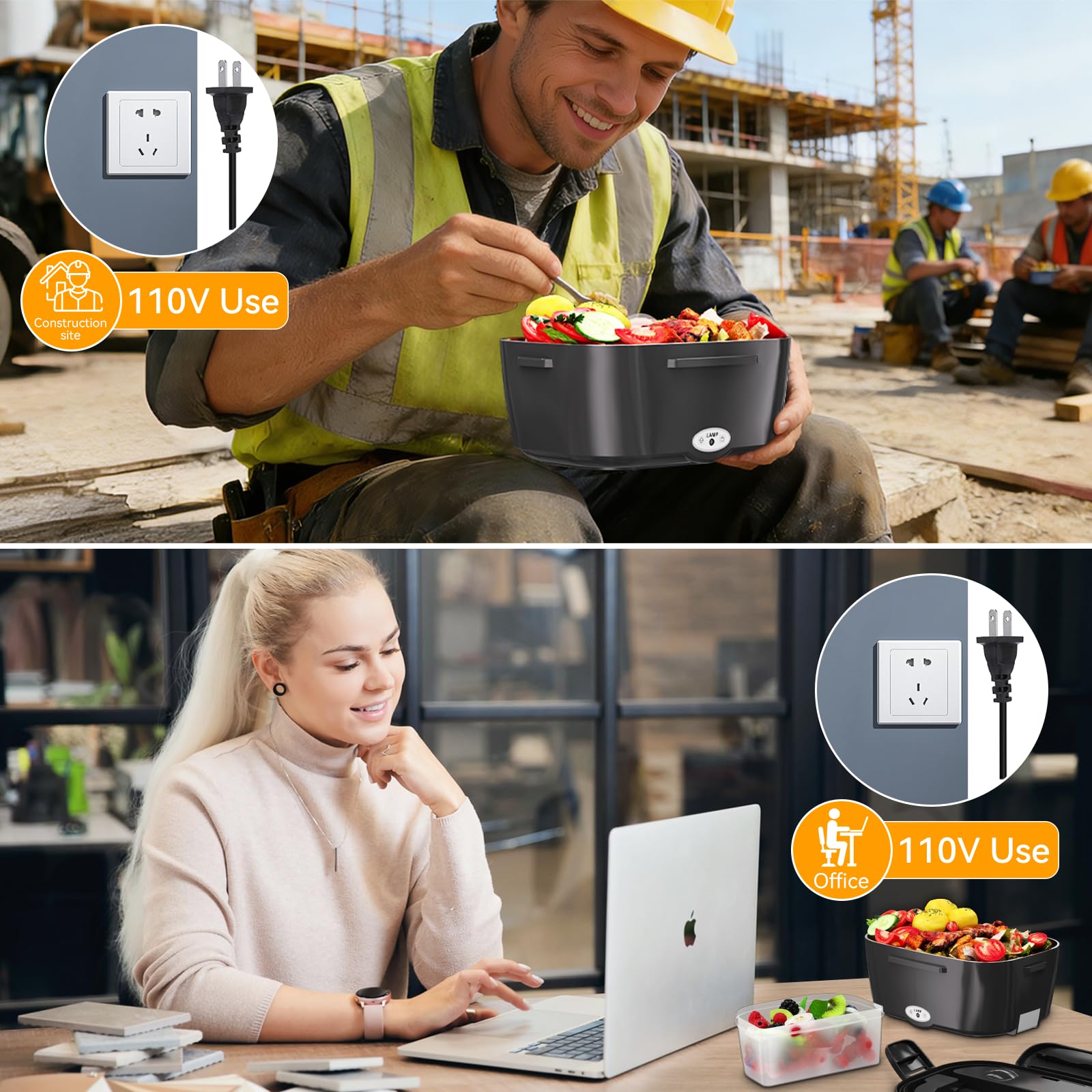 【 3-In-1 Self Heating Lunch Box 】 Our food warmer lunch box supports multiple power options: 110V for home/office use, 12V for the car, and 24V for trucks. It's the perfect companion to enjoy warm home-cooked food while on the go, whether in a car, truck, or at work. Ideal for office employees, building workers, car/truck drivers, and more.