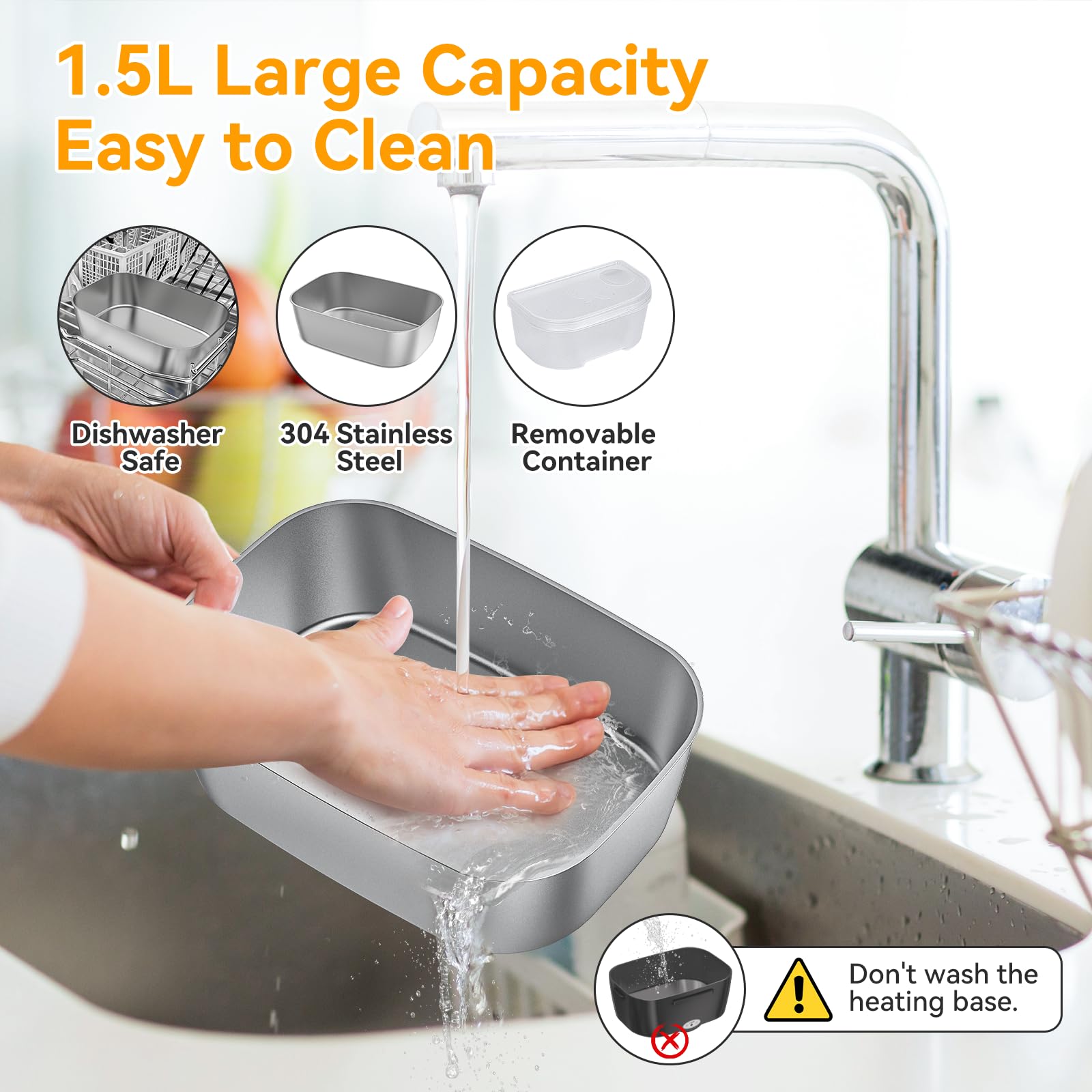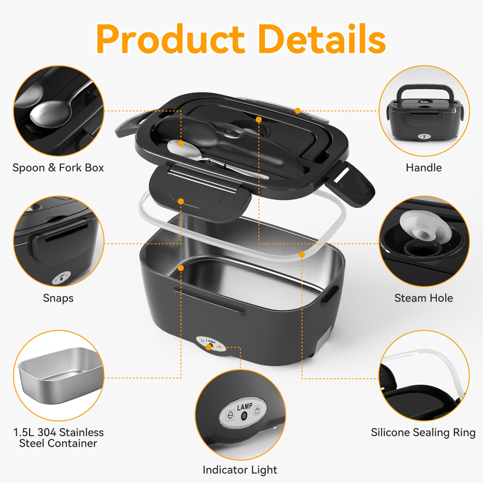 【 1.5L Large Capacity 】 The removable 304 stainless steel container holds up to 1.5L of food, you can pack a satisfying meal to keep you fueled and energized throughout your busy day. The attached plastic box can hold fruits or sauce. And the container is dishwasher safe (Note: keep the heating base away from water).