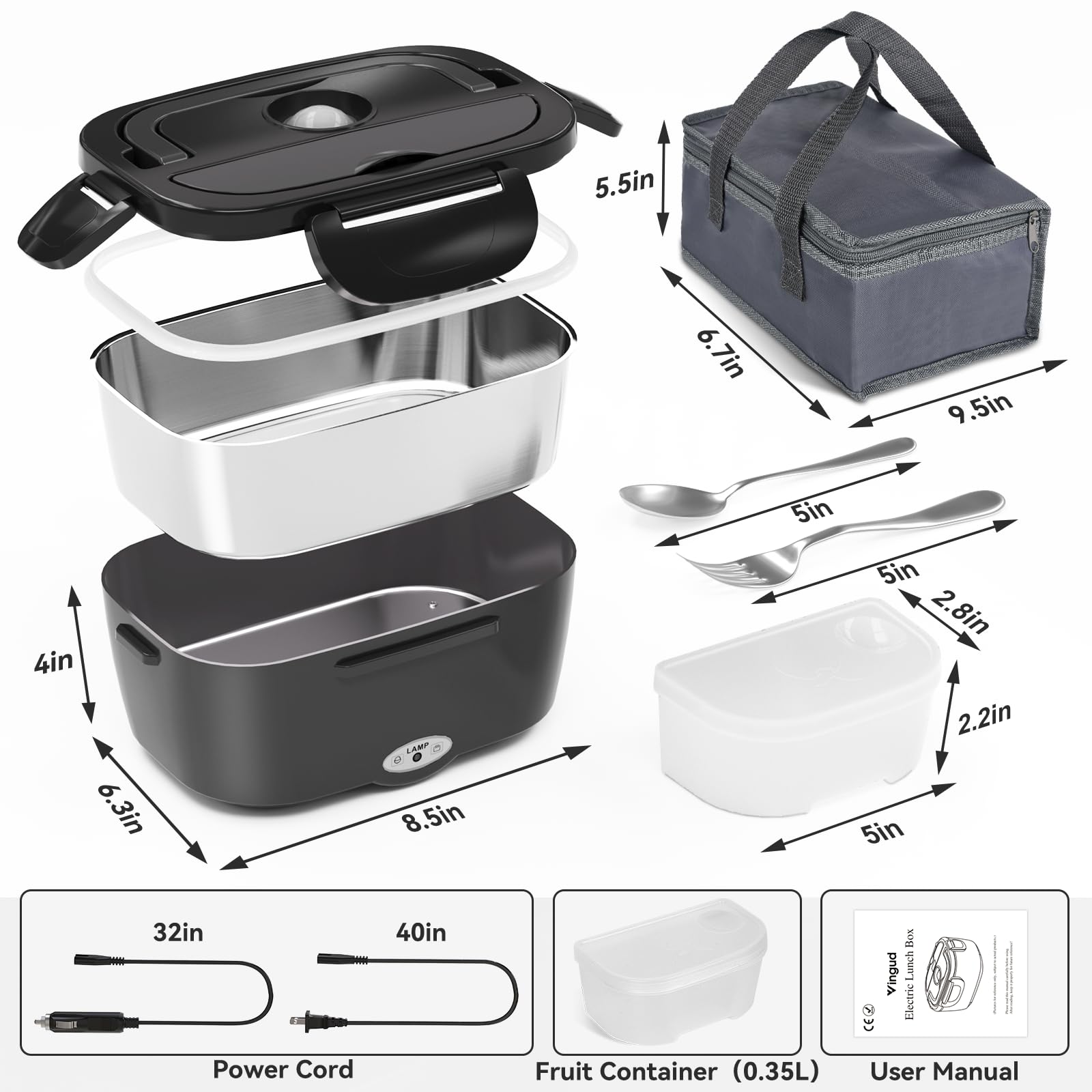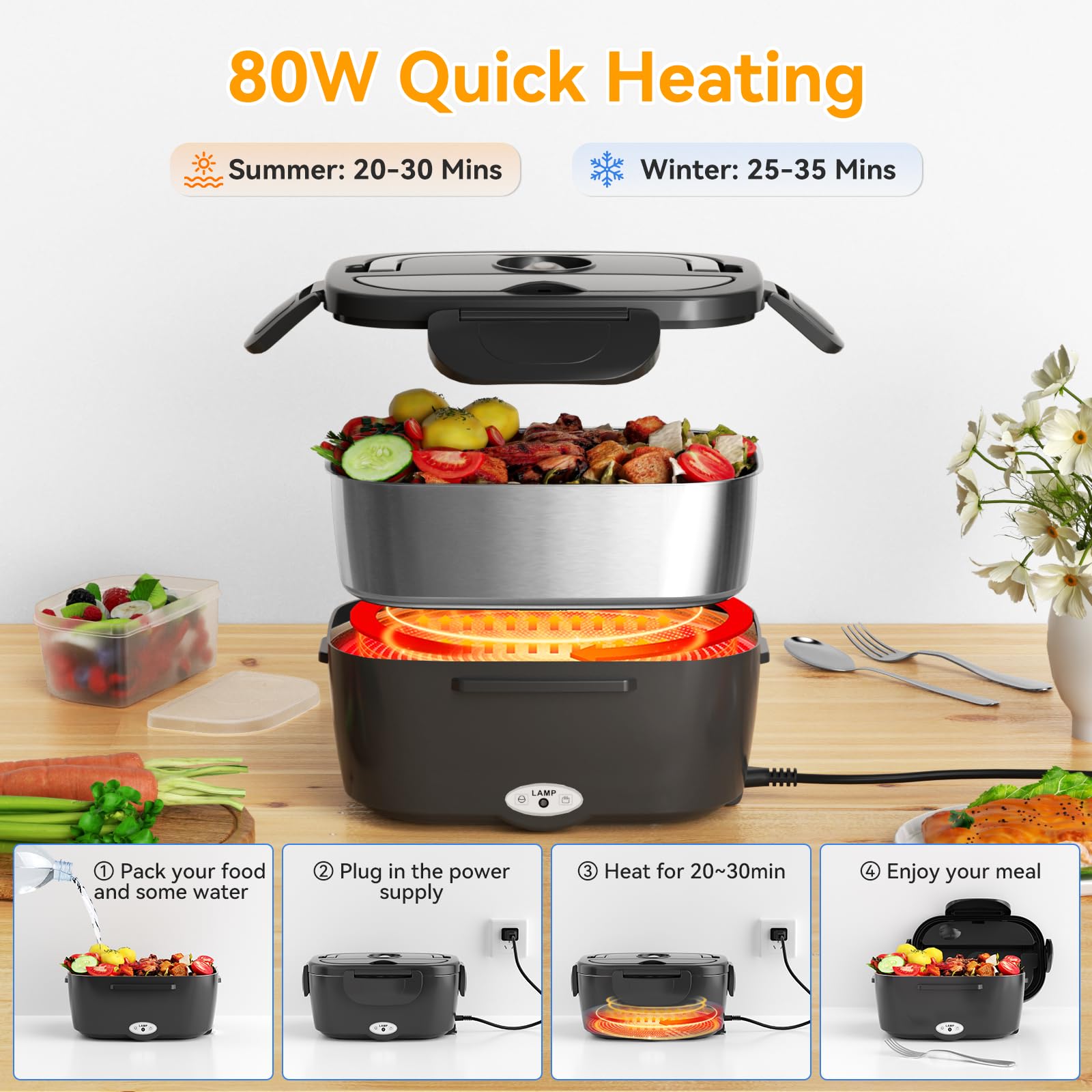【 Rapid Up to 80W Heating 】 Vingud heated lunchbox for adults boasts a high-power system, ensuring quick and even food heating. Simply plug it in approximately 20-30 minutes before mealtime for self-heating convenience. Enjoy your delectable homemade meals whenever you like, without the need for a microwave oven. Pro tip: adding a bit of water to the food aids in the heating process.