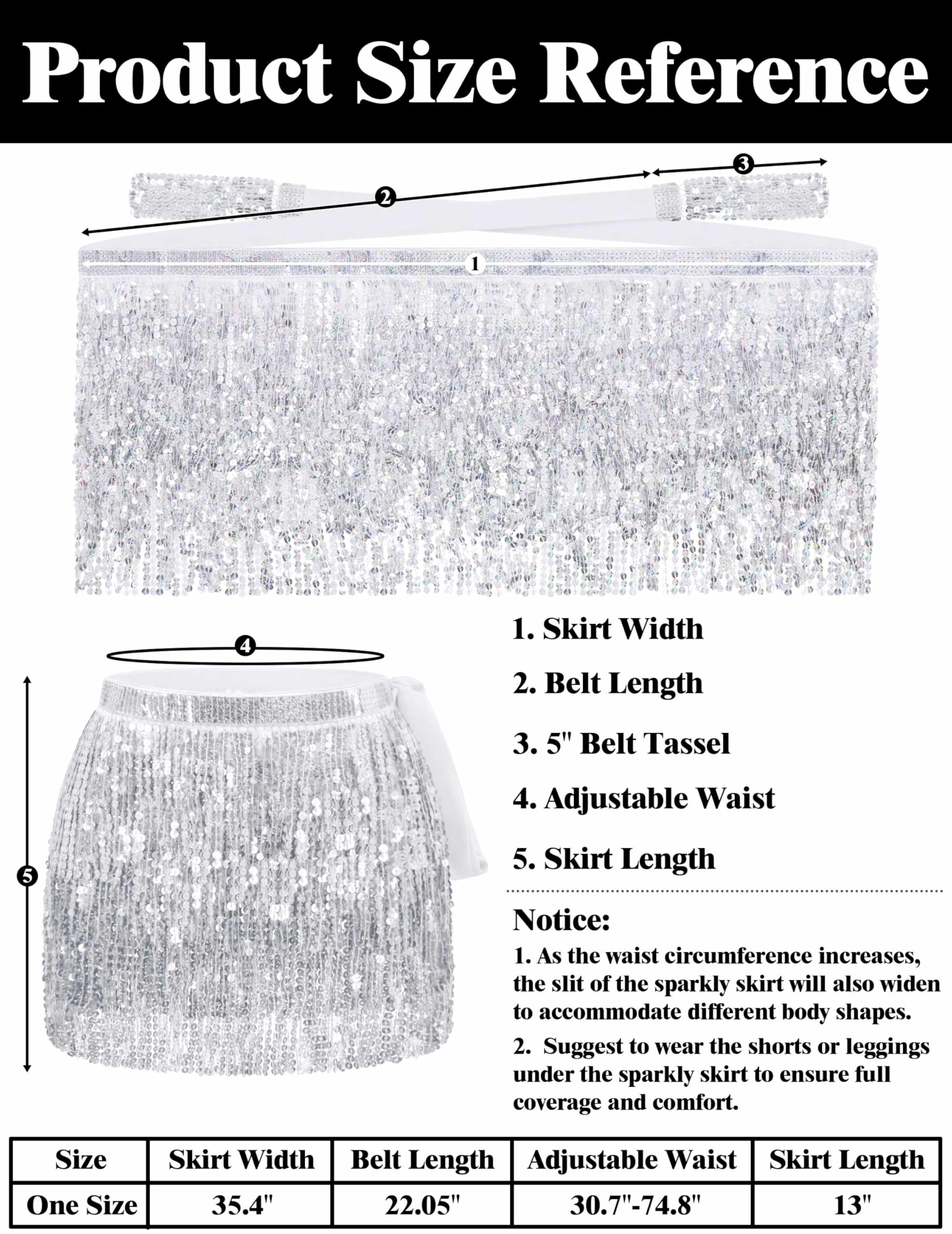 ONE SIZE FITS MOST: The tassle skirt is designed of lacing belt, which allows you to adjust the length of the belt to suit your waistline. The skirt width of belly dancer skirt is about 30.7'', and the waistline of the sequince skirt can be adjusted approximately from 30.7'' to 74.8". The fringe length is 13'', the length of each belt is 22.05'', the length of belt tassel is 5''. As the waist circumference increases, the slit of the skirt will also widen to accommodate different body shapes.