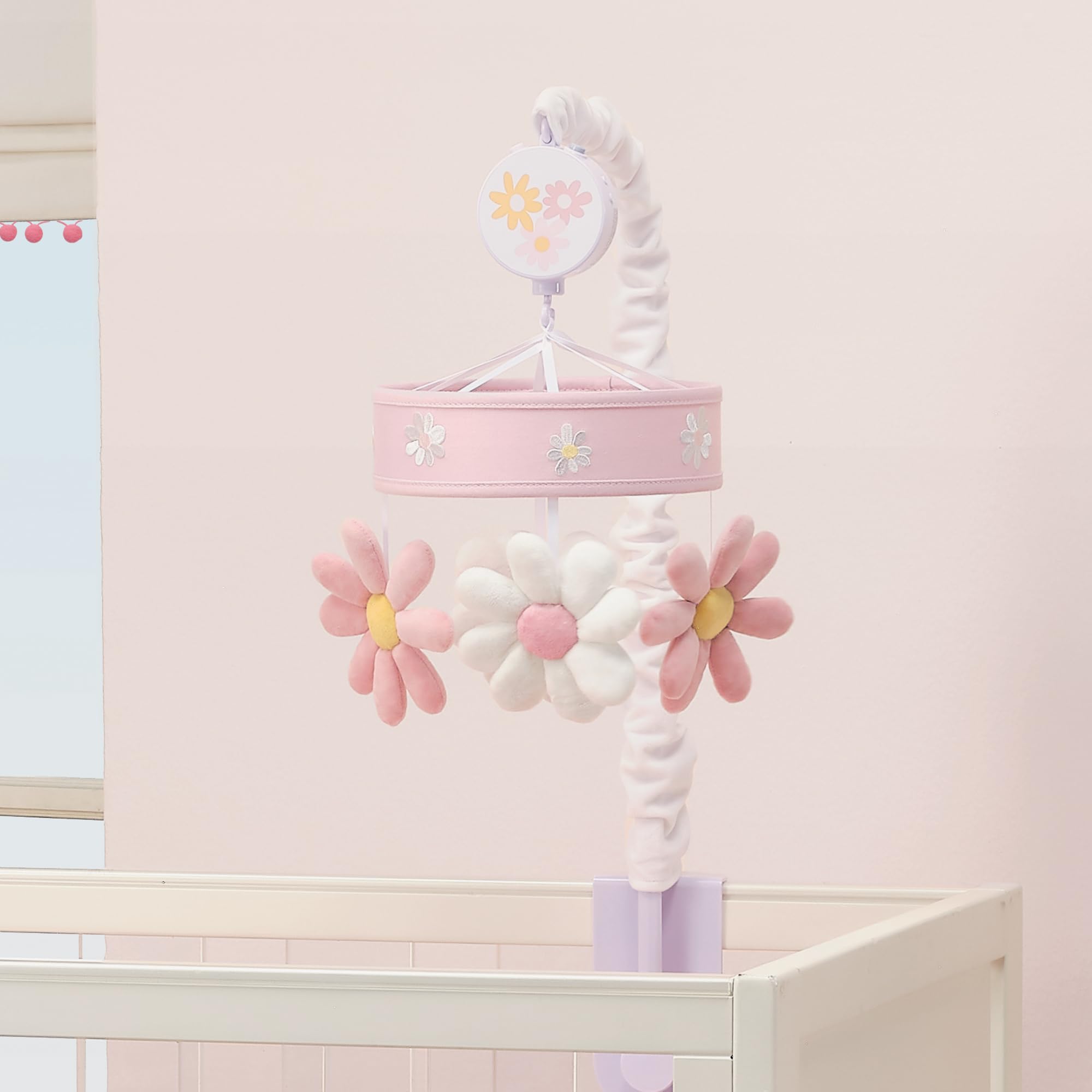 Four velour daisies rotate playfully around a rose pink ring adorned with embroidered daisies