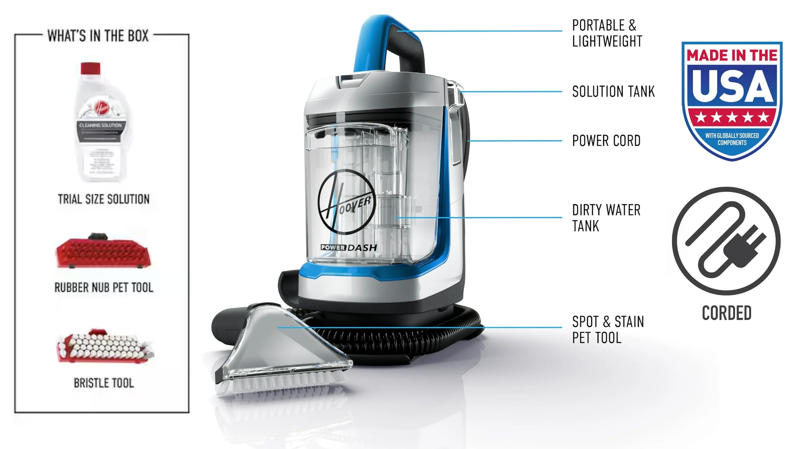 Combining 45% more suction power and versatile tools, the Hoover CleanSlate XL Upholstery & Carpet Spot Cleaner permanently removes stains and messes with powerful suction. Featuring a WidePath tool to quickly clean large areas, a TightSpot tool to reach into crevices and hard-to-reach places, and a Pet Tool to tackle tough pet messes, this spot & upholstery shampooer machine has the flexibility to clean mishaps of any kind. The XL 96-fluid-ounce tank capacity means fewer trips to the sink and more cleaning. With a light, portable design, it's perfect for removing spills and stains on the go. Plus, with the Hose Rinse tool, your machine stays clean and ready for the next mess. For more than 100 years, Hoover has designed powerful, easy-to-use products that clean your entire home from floor to ceiling. Since 1908, consumers and businesses have trusted Hoover to provide reliable, innovative cleaning solutions. Today, we offer a comprehensive line of products for general and special-purpose vacuuming, including full-size uprights and canisters, deep cleaners, and hard floor cleaners.
