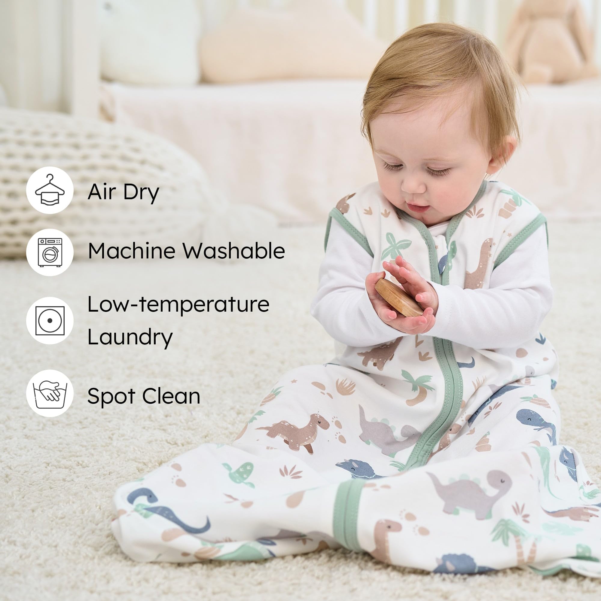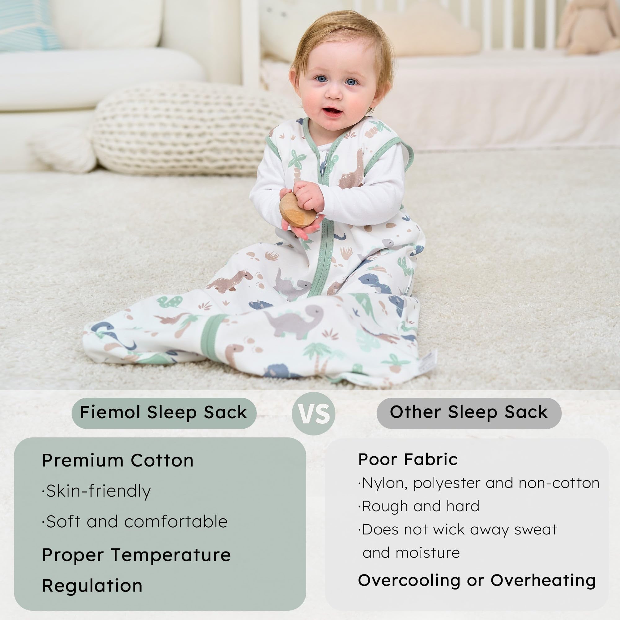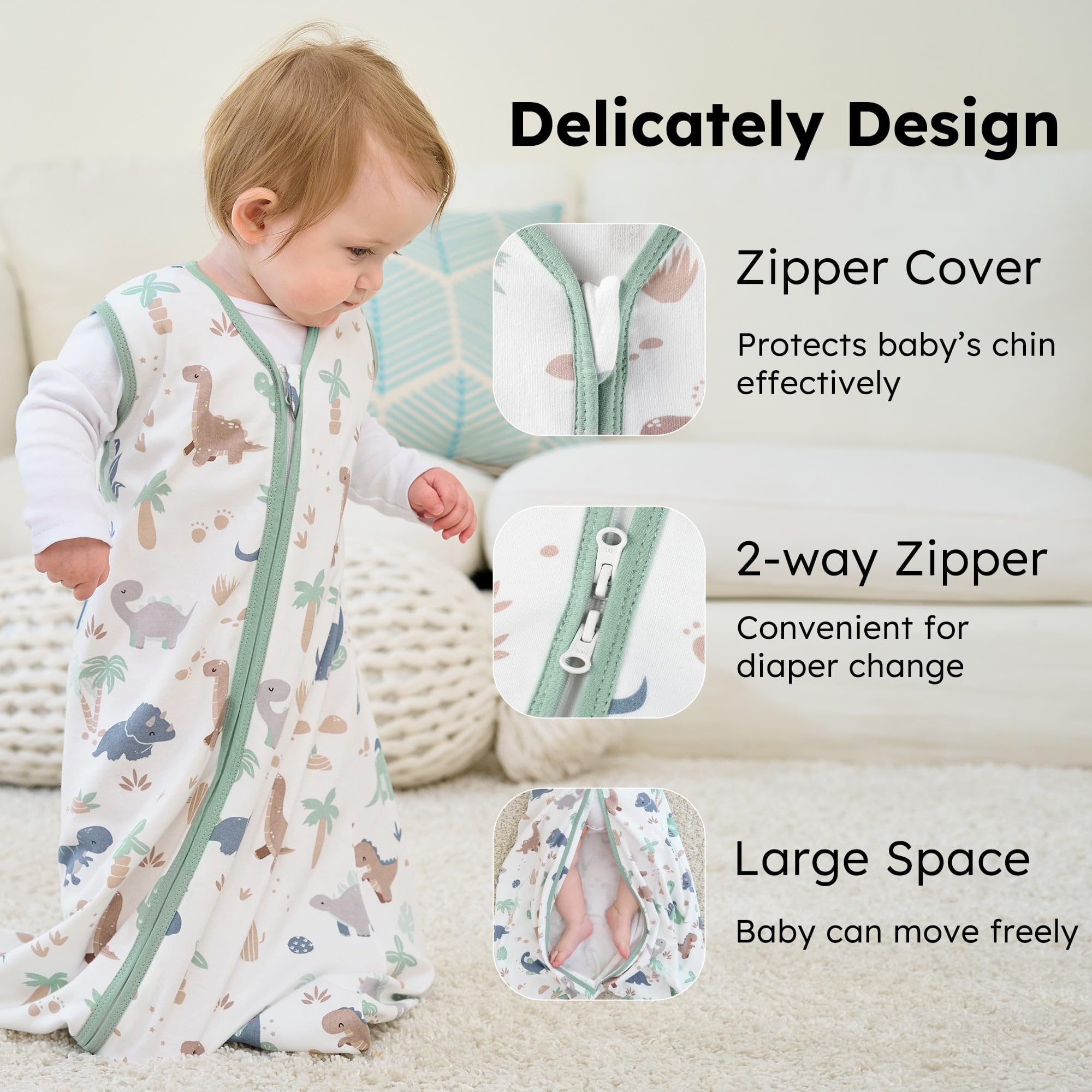Designed for Safety: Concerning for the safety and comfort for babies, we had soften the edge of neck and arm of the baby sleep sack. You could see the extra protector on the collar and soft edge on the arm of the blanket. So that the edge would not cause any discomfort to your baby.