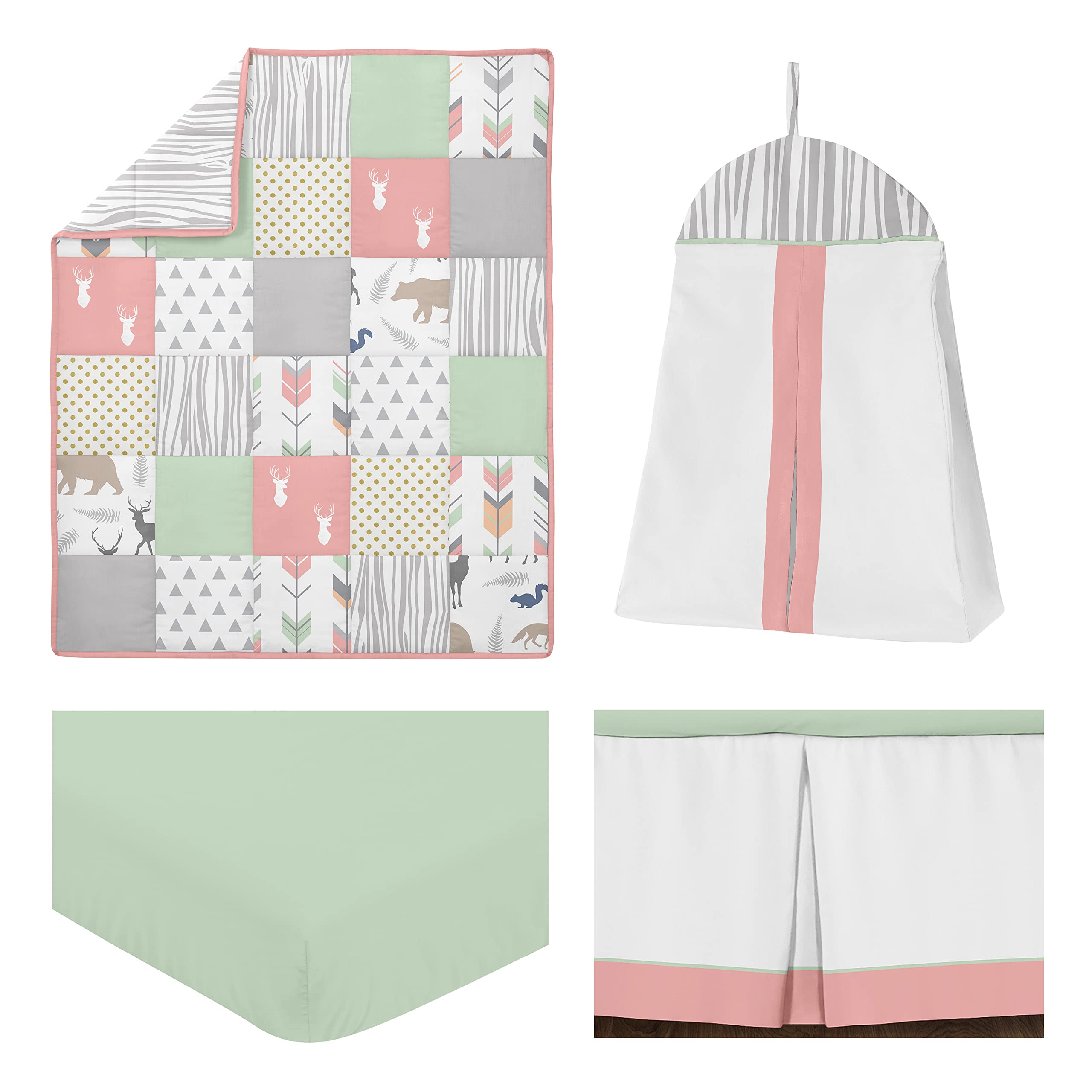 4 Piece Set Includes: Crib Blanket: 45 in. x 36 in., Fitted Crib Sheet: 52 in. x 28 in. x 8 in. pocket, Crib Skirt: 52 in. x 28 in. x 12 in. Drop, Diaper stacker: 15 in. x 20 in. x 6 in.