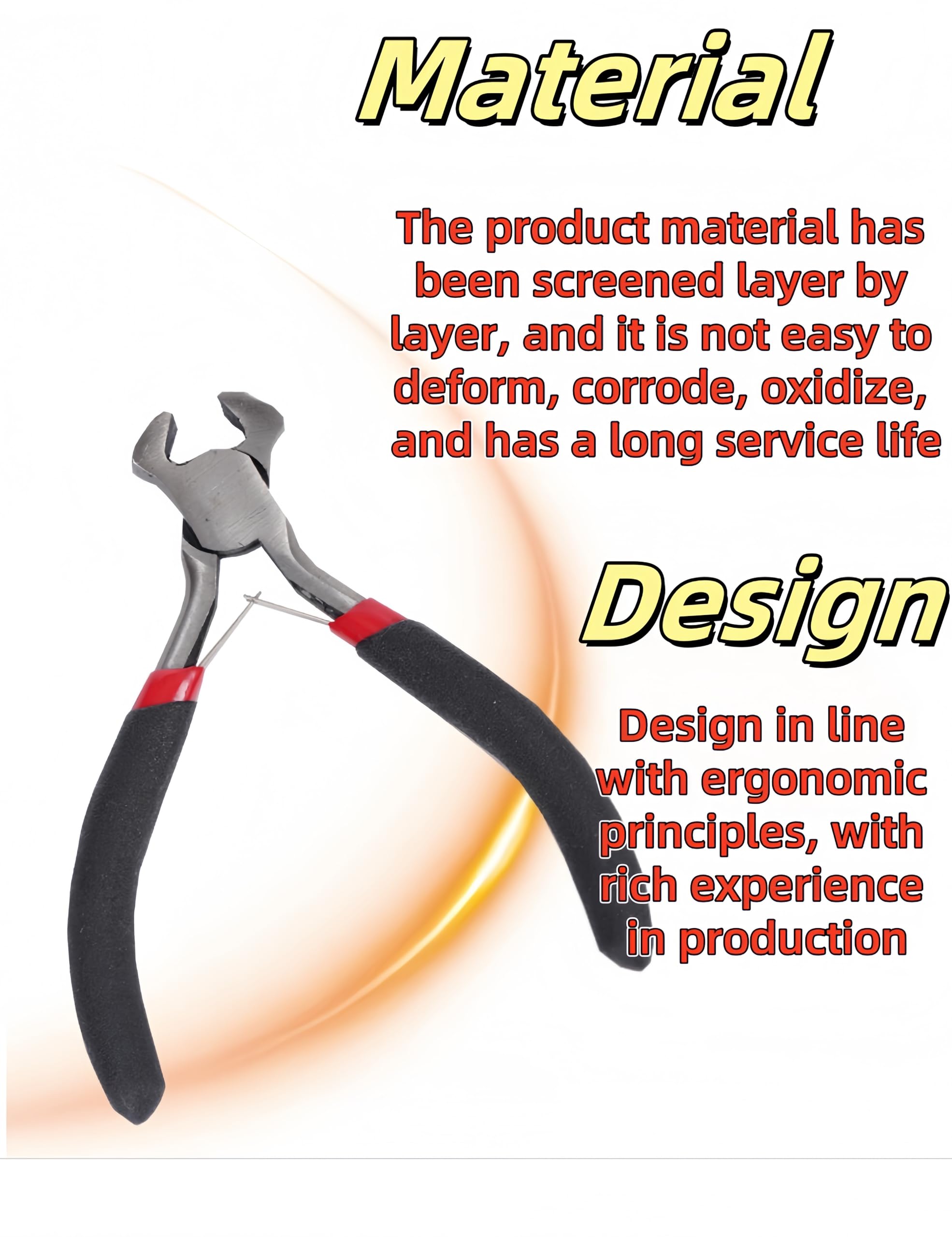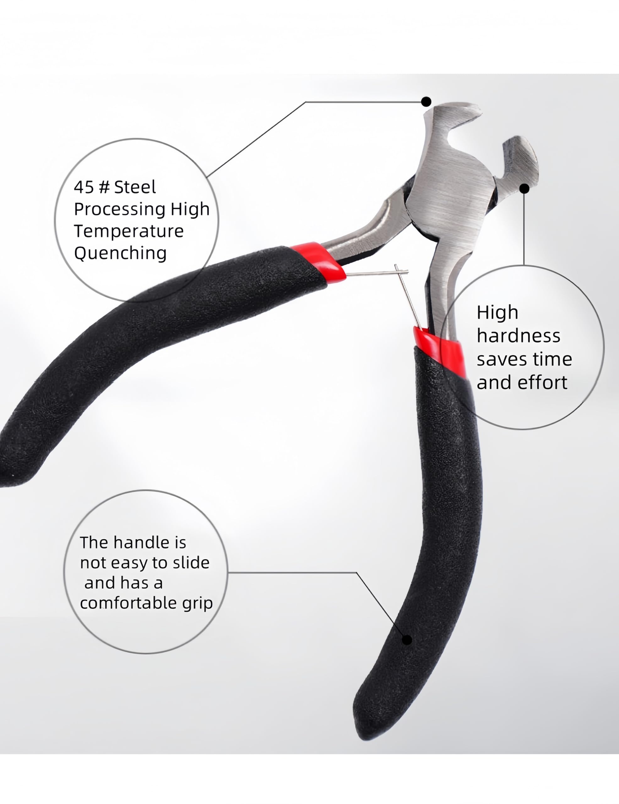 Our Strength: -Sharp cutting jaw is perfect to cut all kinds of wires -High-polished hardened steel that is smooth and cutting powerful -Non-slip Handle makes it comfortable to grip and reduce manual accidents when crafts Product Features: · Material: hardened steel · Handle Color: black · Size: 4.52 inches Package: -1 x end nipper pliers