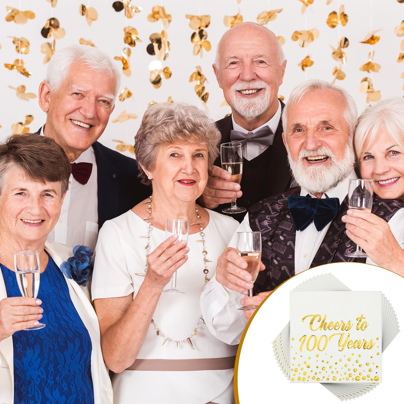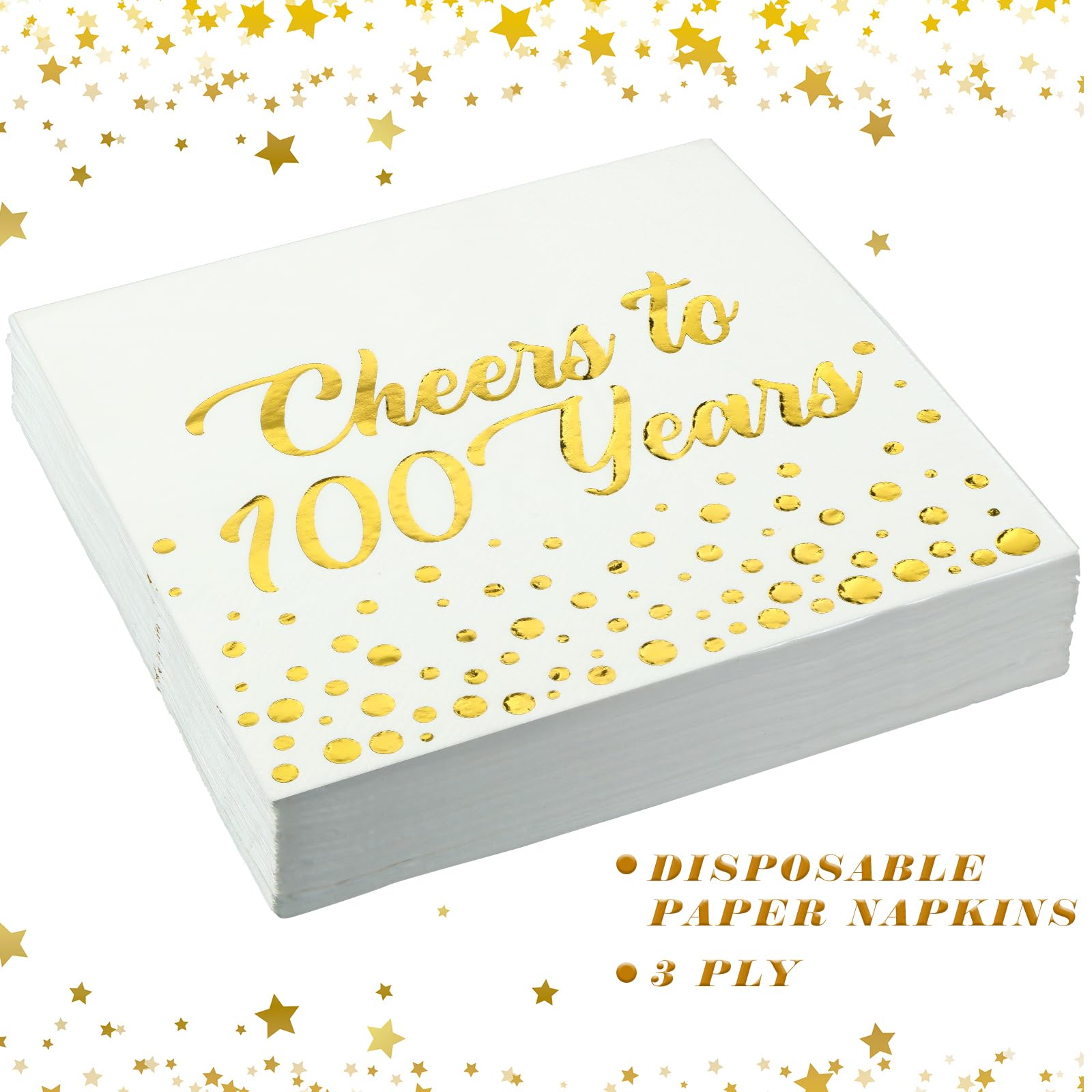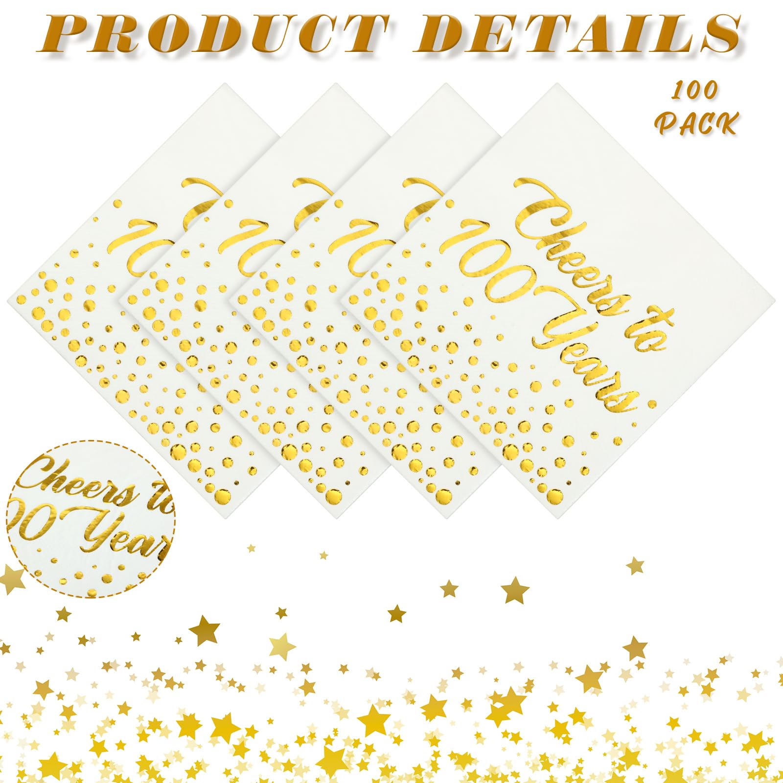 Stylish and Elegant Party Decorations: accentuate the elegance of your 100th birthday or wedding anniversary party with these white and gold foil 100th anniversary napkins; The napkins are printed with 'Cheers to 100 Years' and small gold foil dots; The design adds a sense of sophistication and charm to your event, impressing your guests with the attention to detail