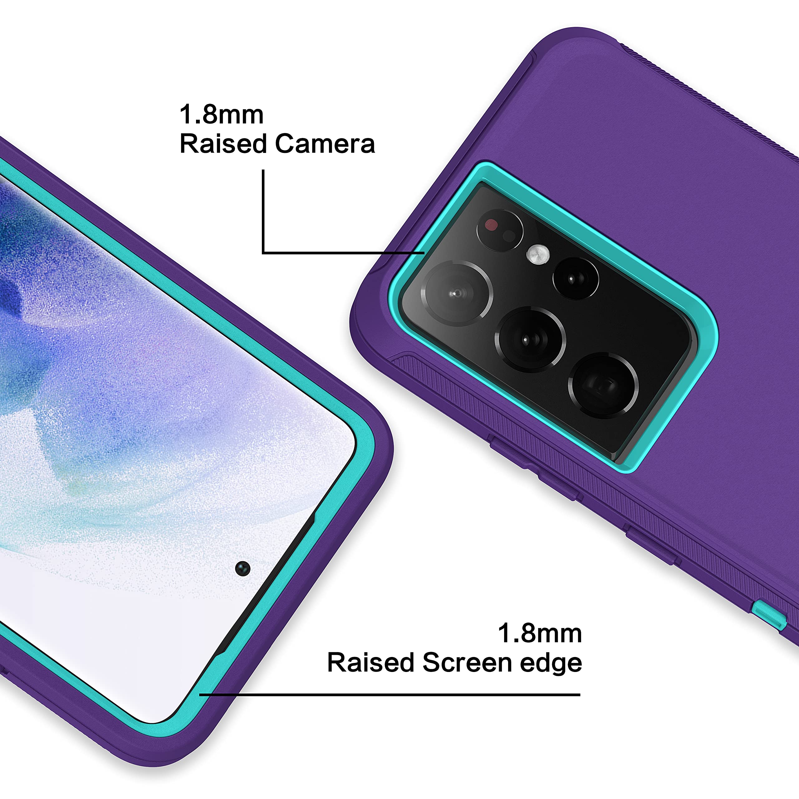 Features of Case S21 Ultra 5G: Raised beveled edges protect your screen and camera. The front edge lips and lens lips provide heavy-duty protection for your phone's screen and camera lens against drops and daily wear