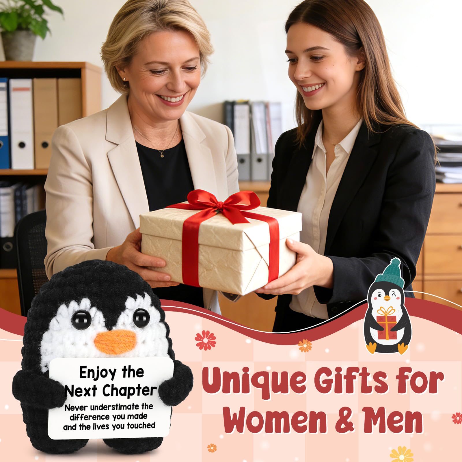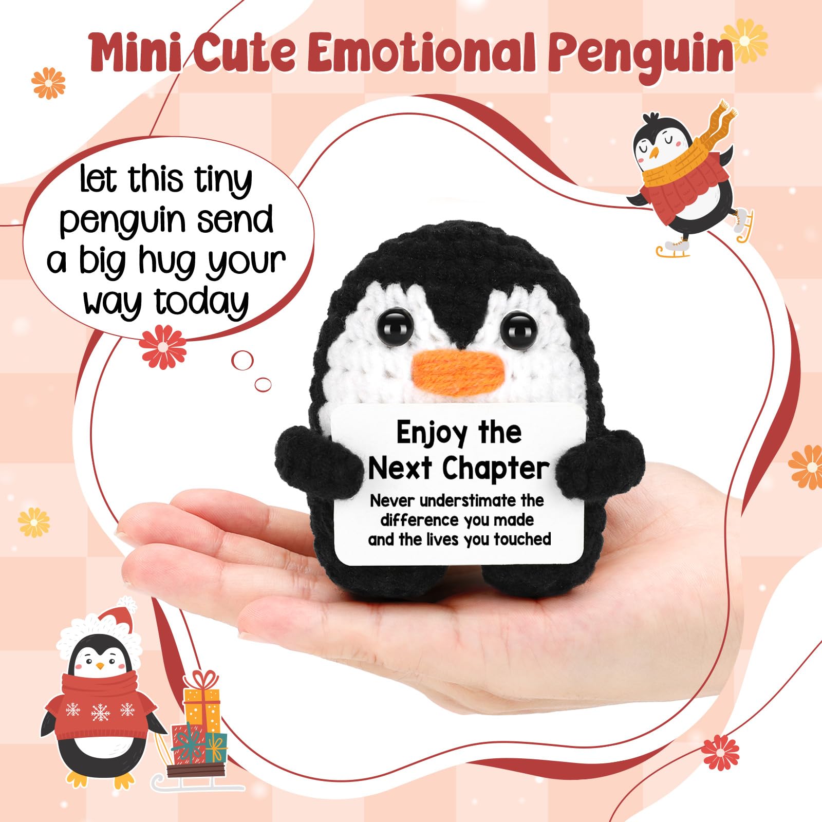 Mini Funny New Beginning Gifts for Women & Men: Struggling to find a meaningful way to honor someone special? This handmade crochet penguin is more than a gift—it’s a heartfelt companion for their new journey, it comes with the uplifting card "Enjoy The Next Chapter!" , is always there to remind their worth, warmth, and the joy they’ve brought to others