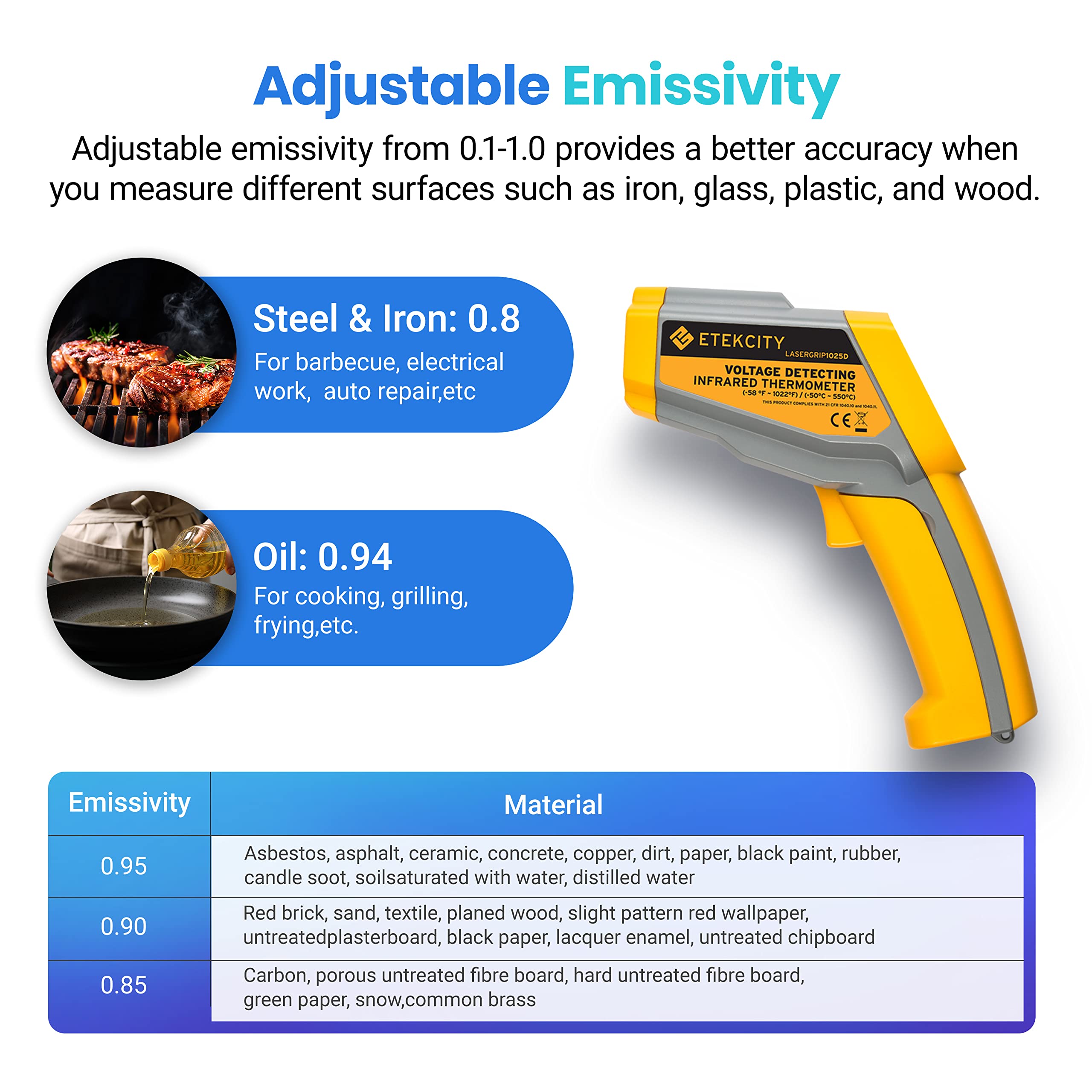 ADJUSTABLE EMISSIVITY AND MULTIFUNCTION: Adjust emissivity from 0.1-1.0 to improve the accuracy of your measurements across different types of surfaces. Other key features include: ºF and ºC capable, max measurement hold, automatic data hold, low battery indicator, and auto-off to save battery