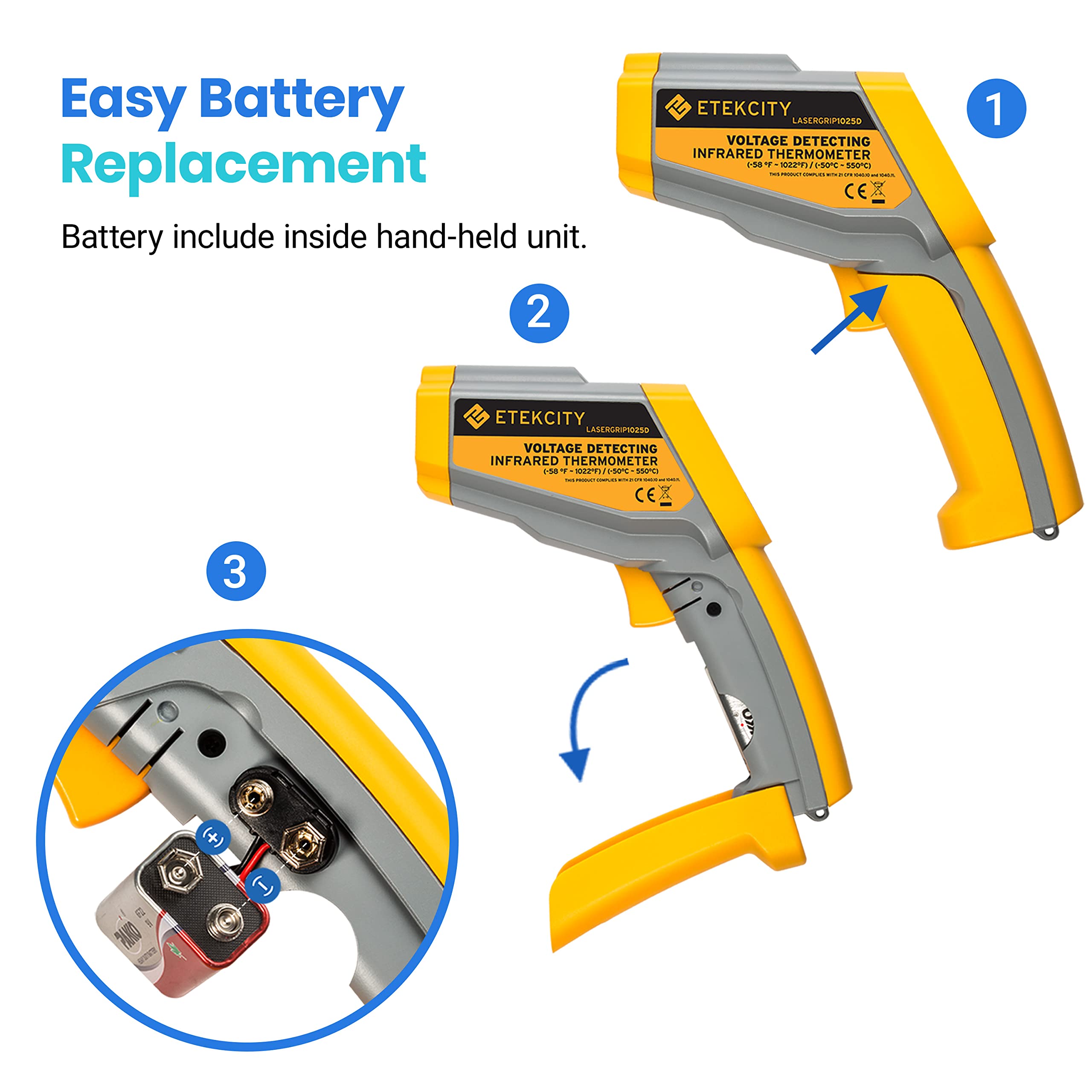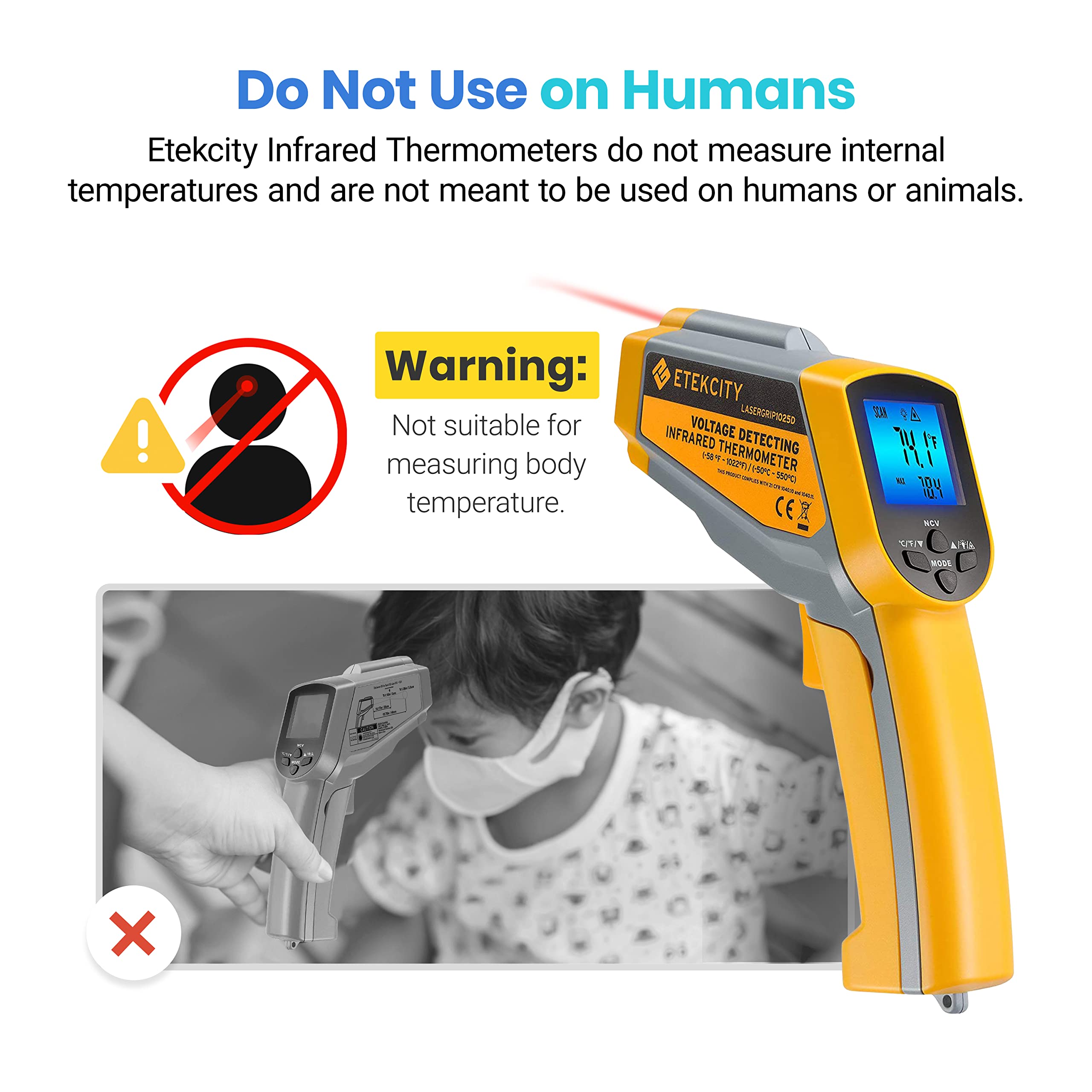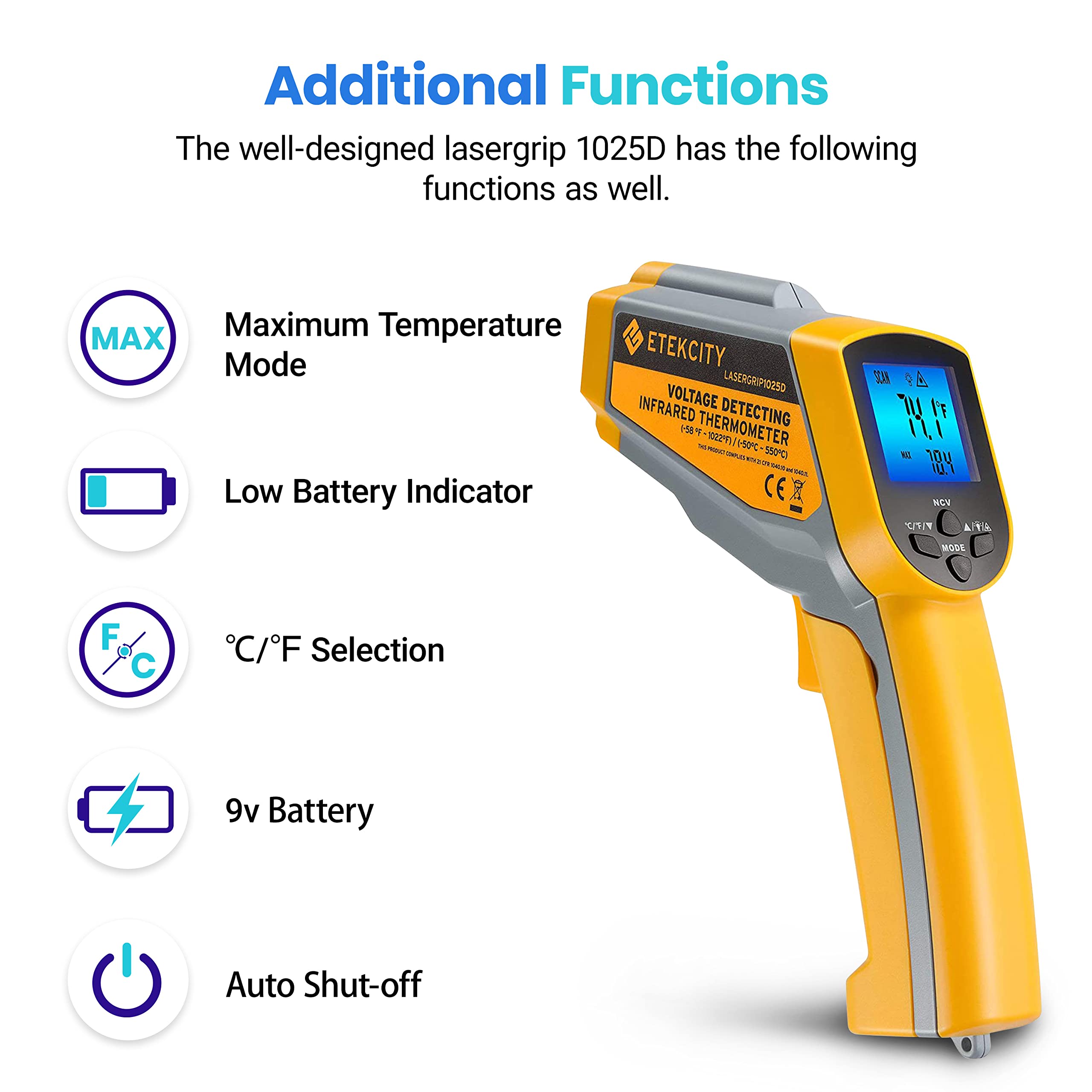 Handy Versatility From air vents to hot water pipes to even car engines, the Etekcity Laser grip 1025D Infrared Thermometer has got you covered for accurate temperature measurements. The 12:1 distance to spot ratio allows you to measure extreme temperatures ranging from -50°F to 1022°F without being in harm's way. Non-Contact Voltage Detection Simply press the NCV mode button and point the 1025D Laser grip Thermometer to a terminal strip, outlet, or cord. When the thermometer beeps, it indicates the presence of live voltage. Electricians, maintenance professionals, and safety personnel can use the 1025D Laser grip Thermometer to quickly test for energized circuits and defective grounds—it’s ideal for any electrical professional or to have at home. Measure Adaptively Improve the accuracy of your results with adjustable emissivity on the thermometer. The emissivity of a material is its efficiency in emitting thermal energy (most organic materials and painted or oxidized surfaces have an emissivity of 0. 95). Non-reflective surfaces have a higher emissivity (closer to 1) than reflective surfaces (closer to 0). Other materials, such as polished metal surfaces, have a different emissivity level, which should be taken into account for accurate readings. Note: For best accuracy, the distance between the thermometer and object of measurement should be approximately 14. 17 inches (36cm); this device should only be used on inanimate objects for surface temperature. Specifications Temperature Range: -58ºF 1022ºF (-50ºC 550ºC) Accuracy: ≥100°C2% ≤100°C2°CDistance Spot Ratio: 12: 1Emissivity Adjustable: Adjustable (0. 1 to 1. 0)Response Time: ≤500msResolution: 0. 1℃ or 0. 1℉Storage Temperature: -4℉~122℉(-20℃~50℃ )Package Included1x Etekcity Laser grip 1025D thermometer1x 9V DC battery1x User's manual.