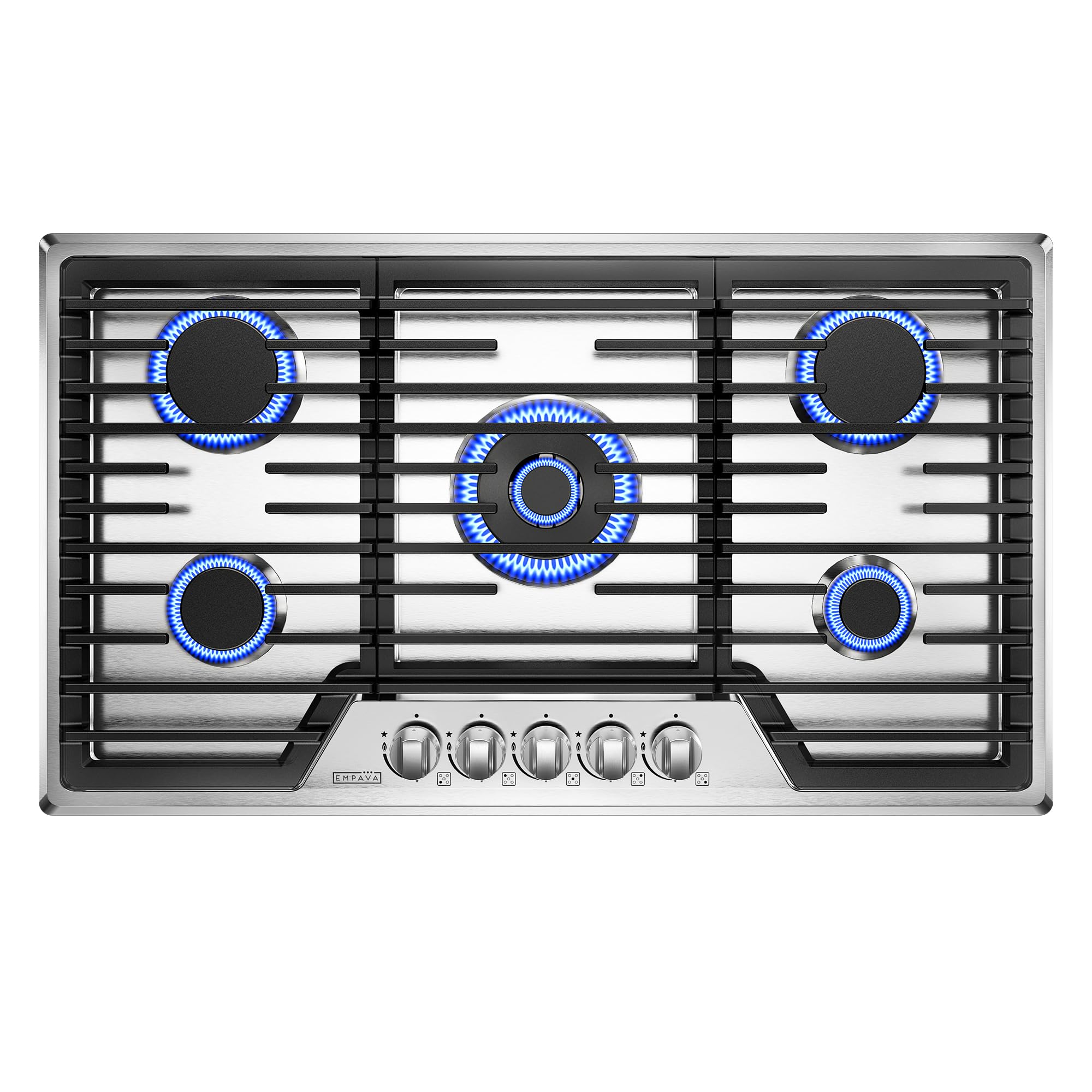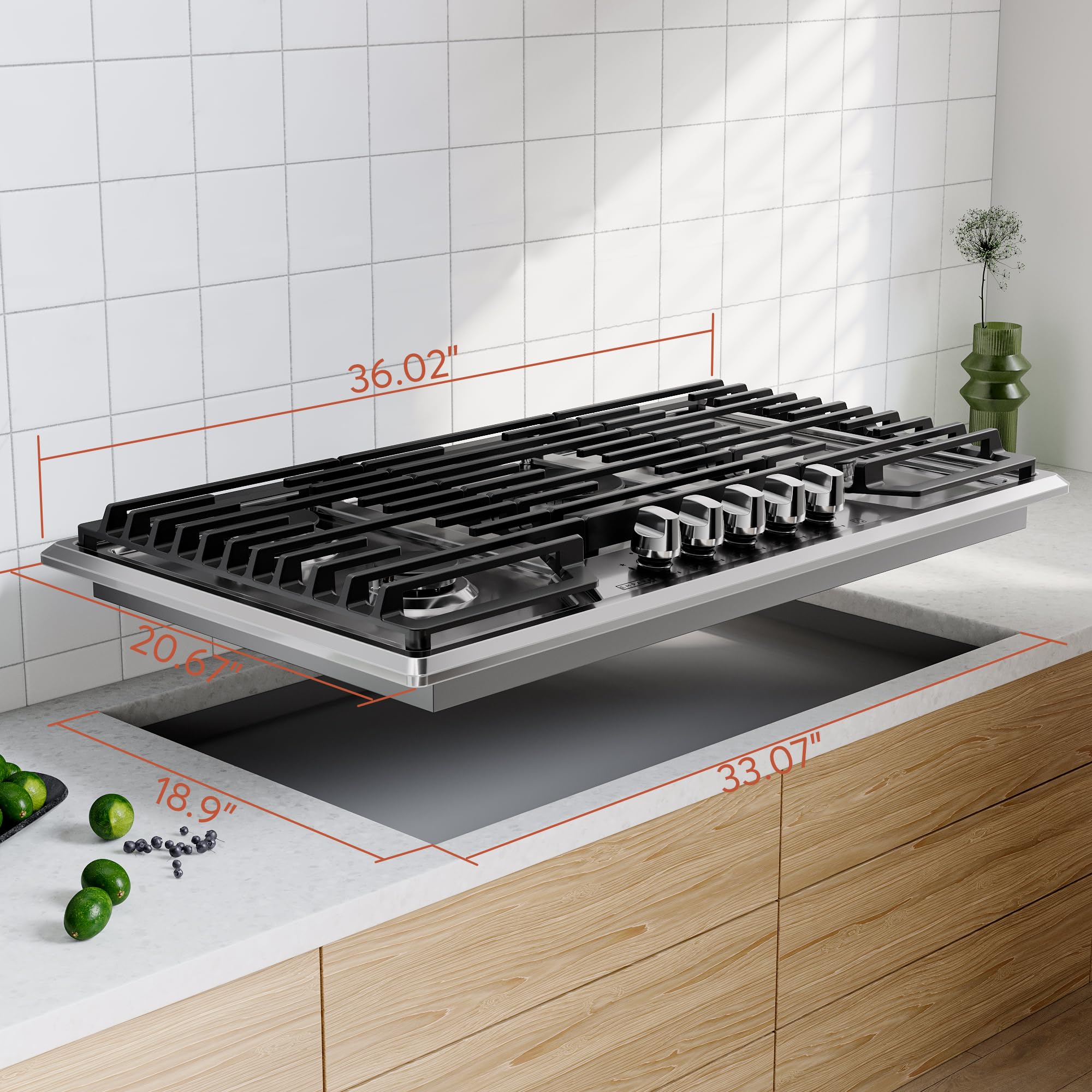 Compact Design for Seamless Installation - Product dimensions: 36.02" W × 20.67" D × 3.85" H. Cutout dimensions: 33.07" W × 18.9" D × 1.18" H. Includes 110V power cord and LPG nozzles.