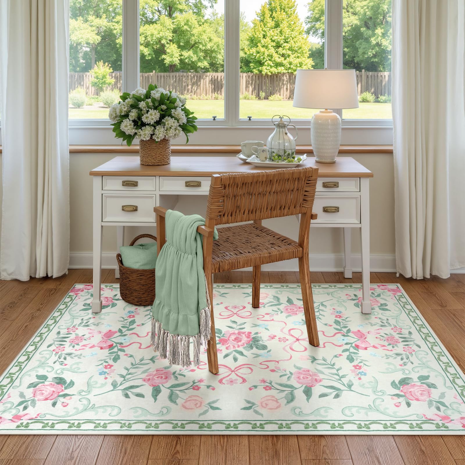 Vibrant Design: This lovely and beautiful rug is designed with a blend of bow ribbons and floral plants, combined with elegant color tones, it is a great fit for your home, giving your interior space a vibrant and elegant natural style charm