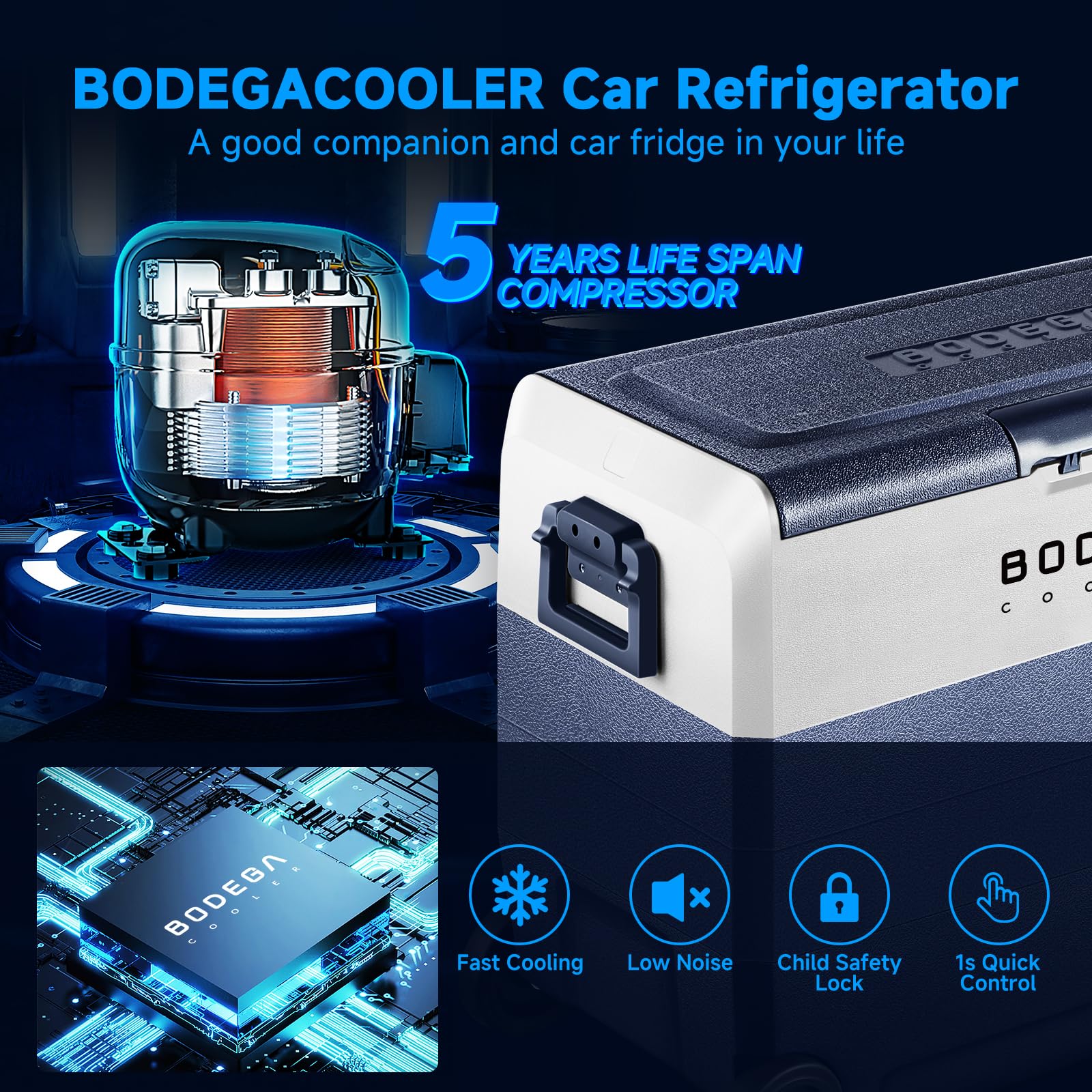 Anti-Shaking: BODEGACOOLER 12v fridge is designed for silent working.Because of its overall external smooth lines and equipped with a multi-functional non-slip base, the lateral displacement is greatly reduced. Even your car is climbing at an inclination angle of 30 degrees, the car portable freezer still run stably.this portable car refrigerator allows you to enjoy cold drinks in stable and low noise during the road trip.more outdoor fun with friends and family.