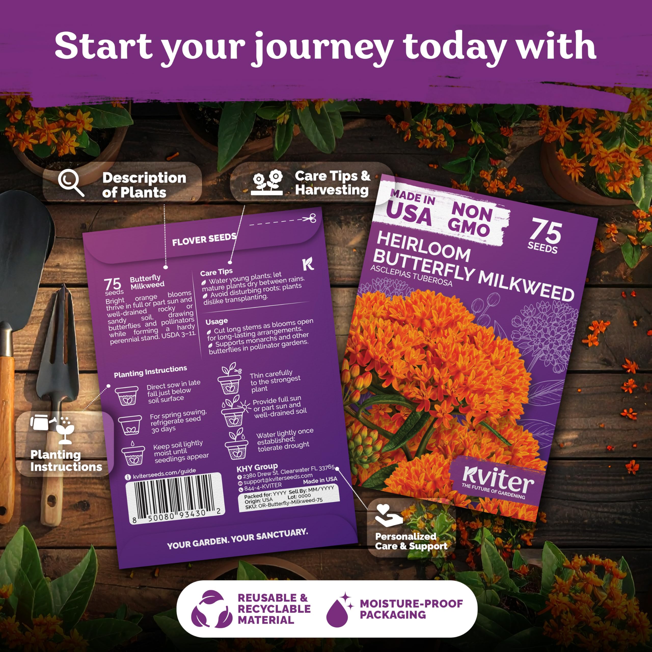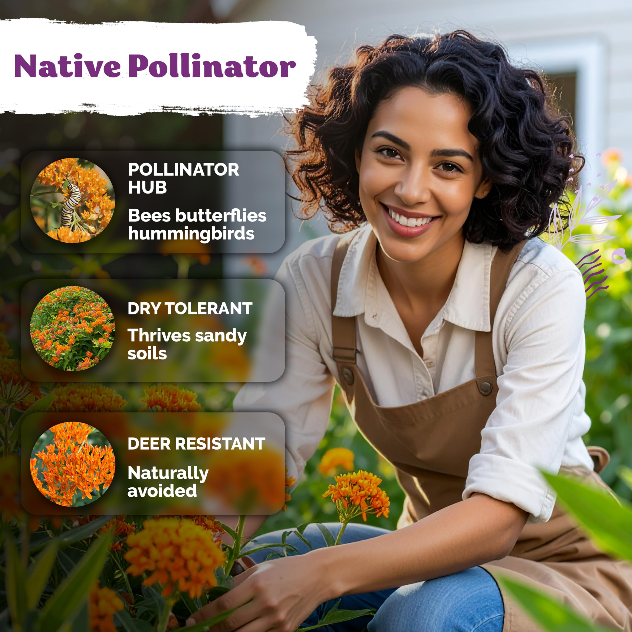 Drought tolerant once established: native milkweed seeds, pollinator seeds, love sandy, well-drained soil; water young plants, avoid soggy beds. Space 12-24 inches; slow to bloom in 2-3 years.