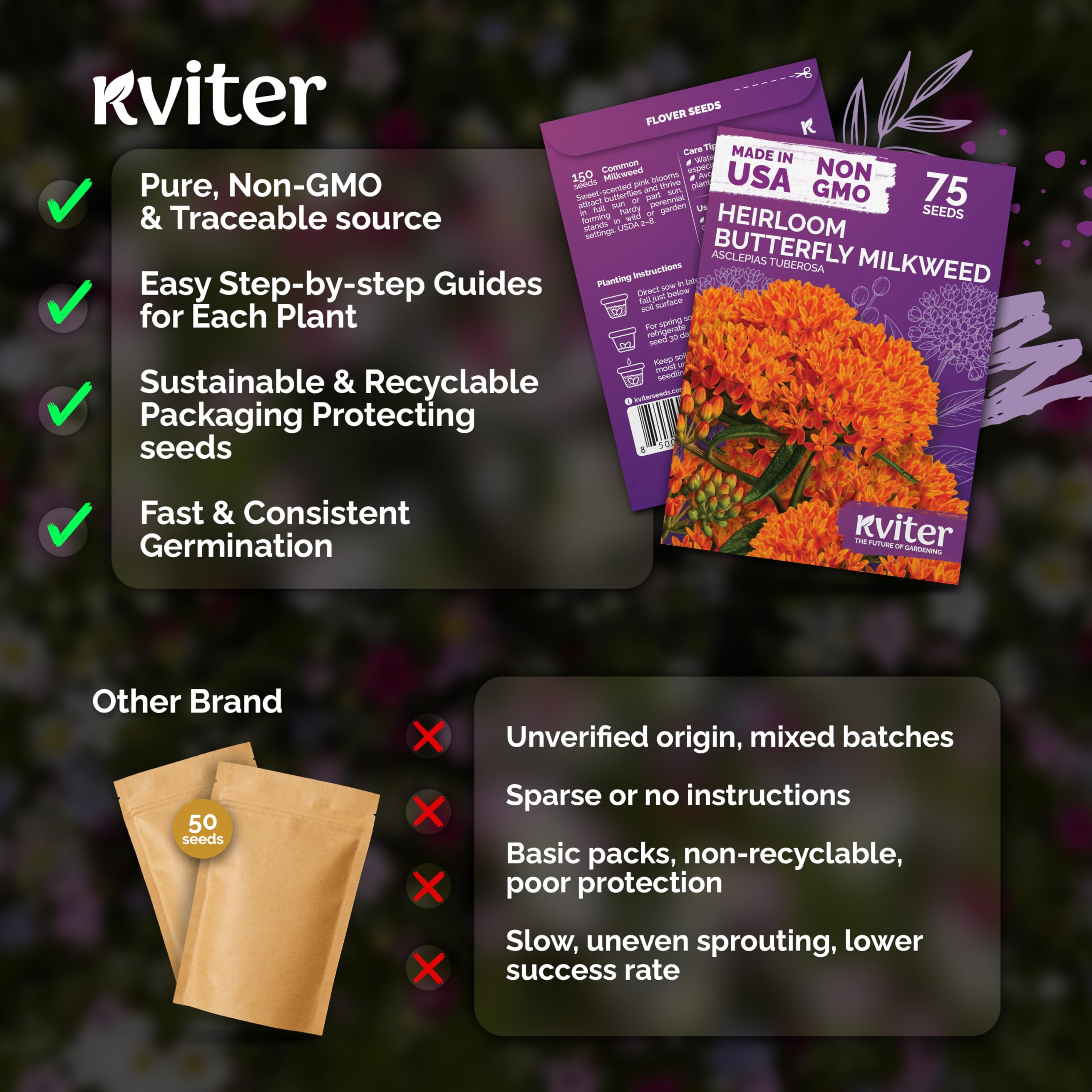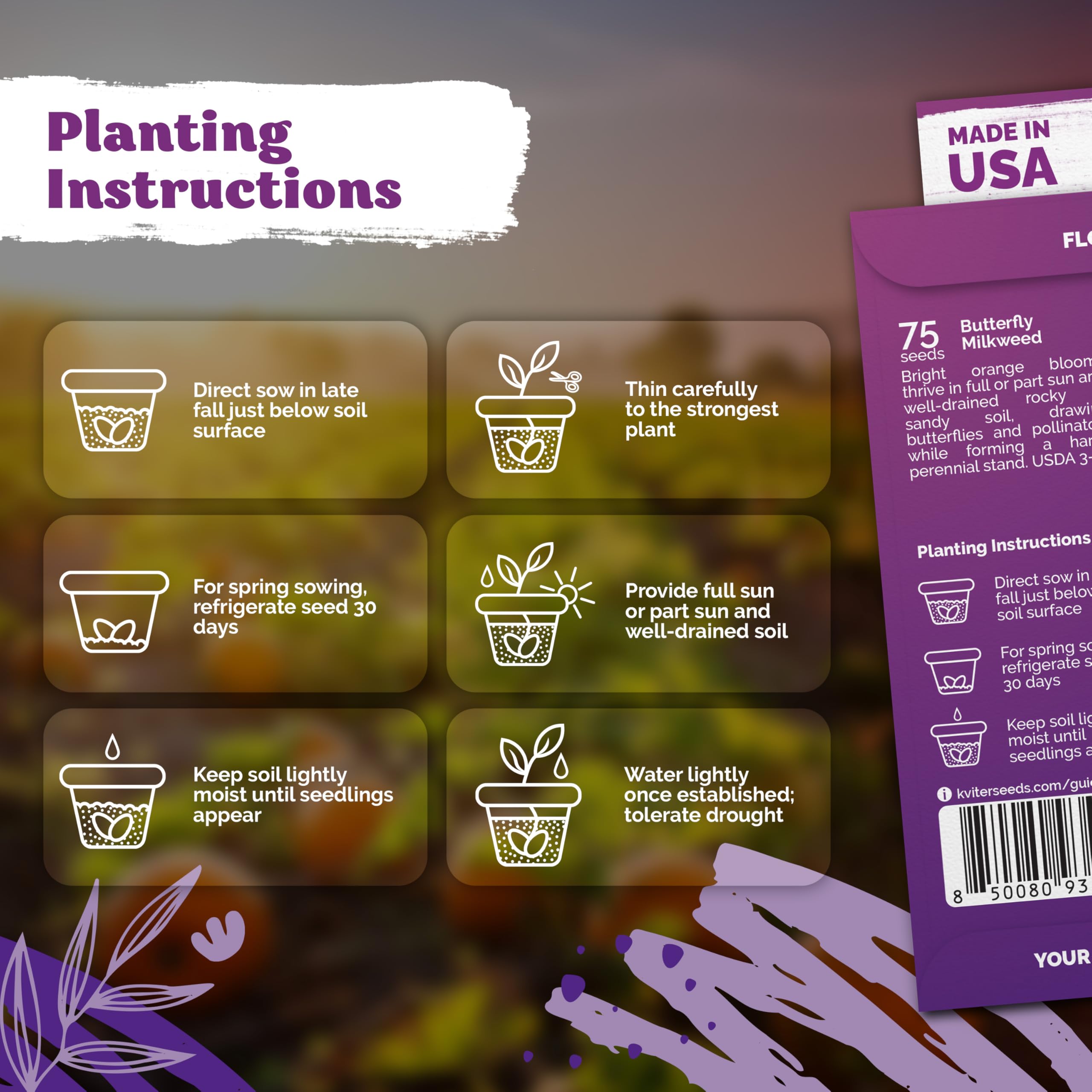 Monarch host plant: milkweed seeds for monarch butterflies thrive as perennial flower seeds in USDA zones 3-11; full sun to part sun, perfect for butterfly gardens, open fields & roadsides.