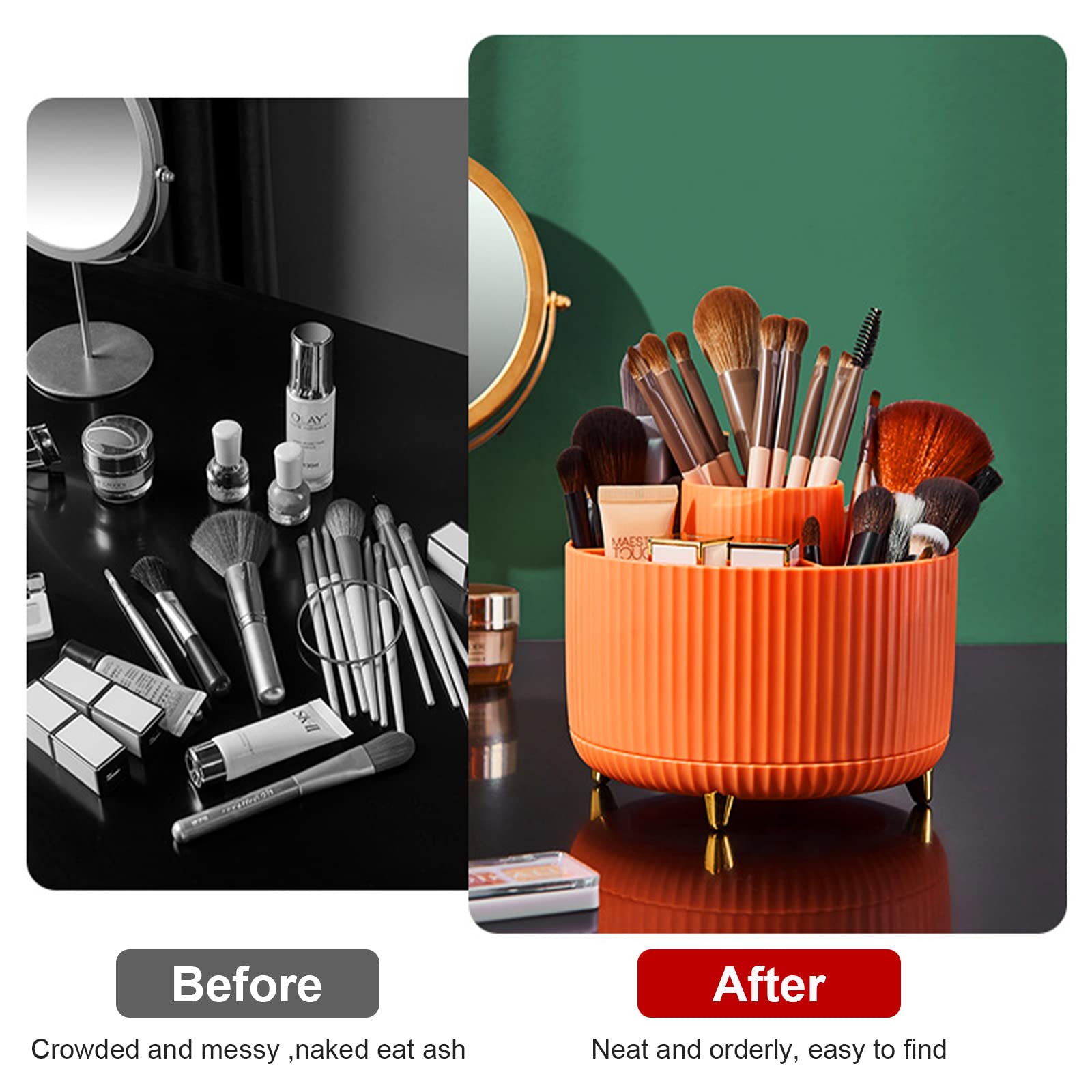 Multi-Purpose makeup brush organizer:The Spinning makeup brush organizer is used as a perfume storage rack, cosmetic lipstick rack in the bedroom or bathroom on the countertop, perfect for your vanity, bathroom. Besides, it also can be used for collecting office supplies, craft supplies, small toys. It is widely used in the home, school and office.