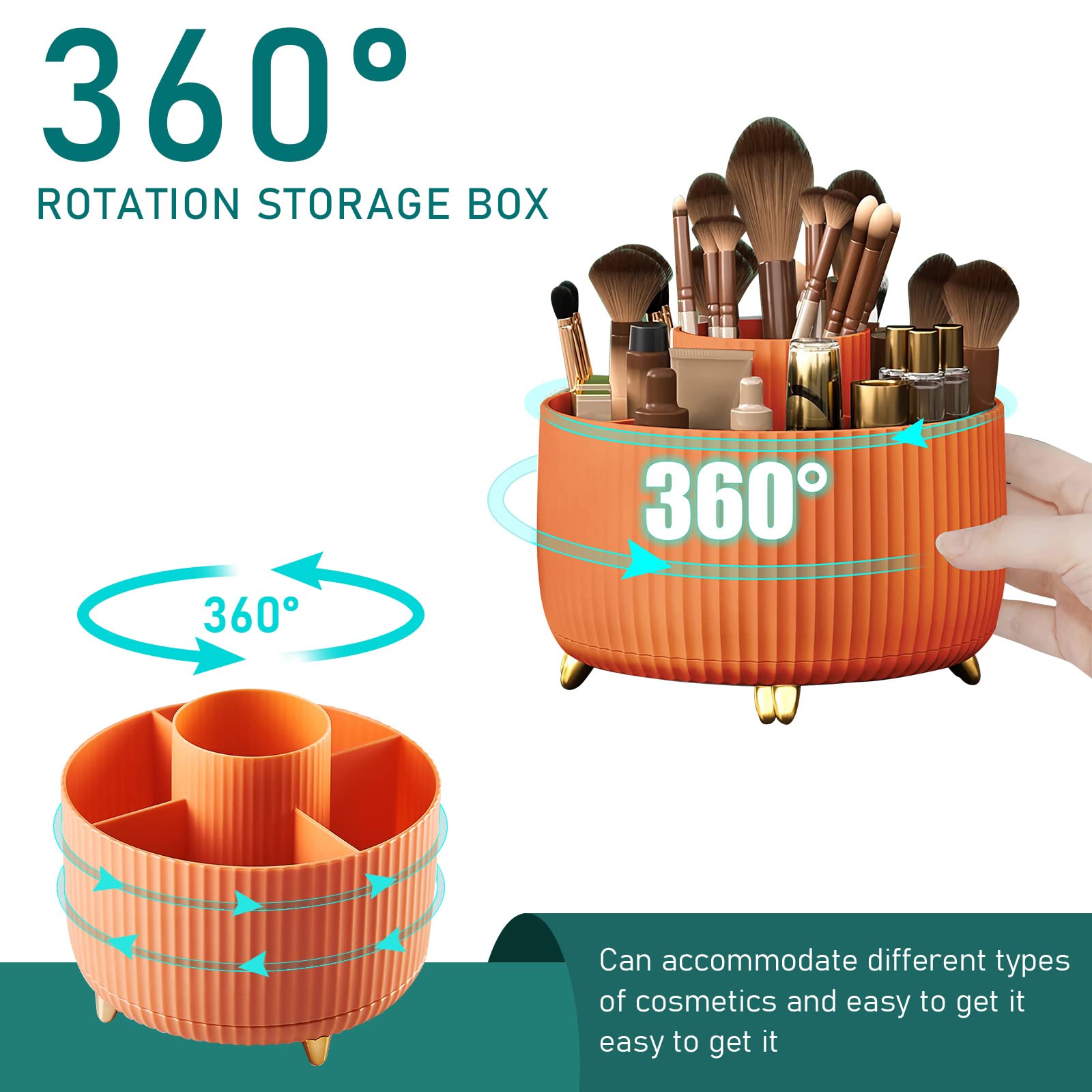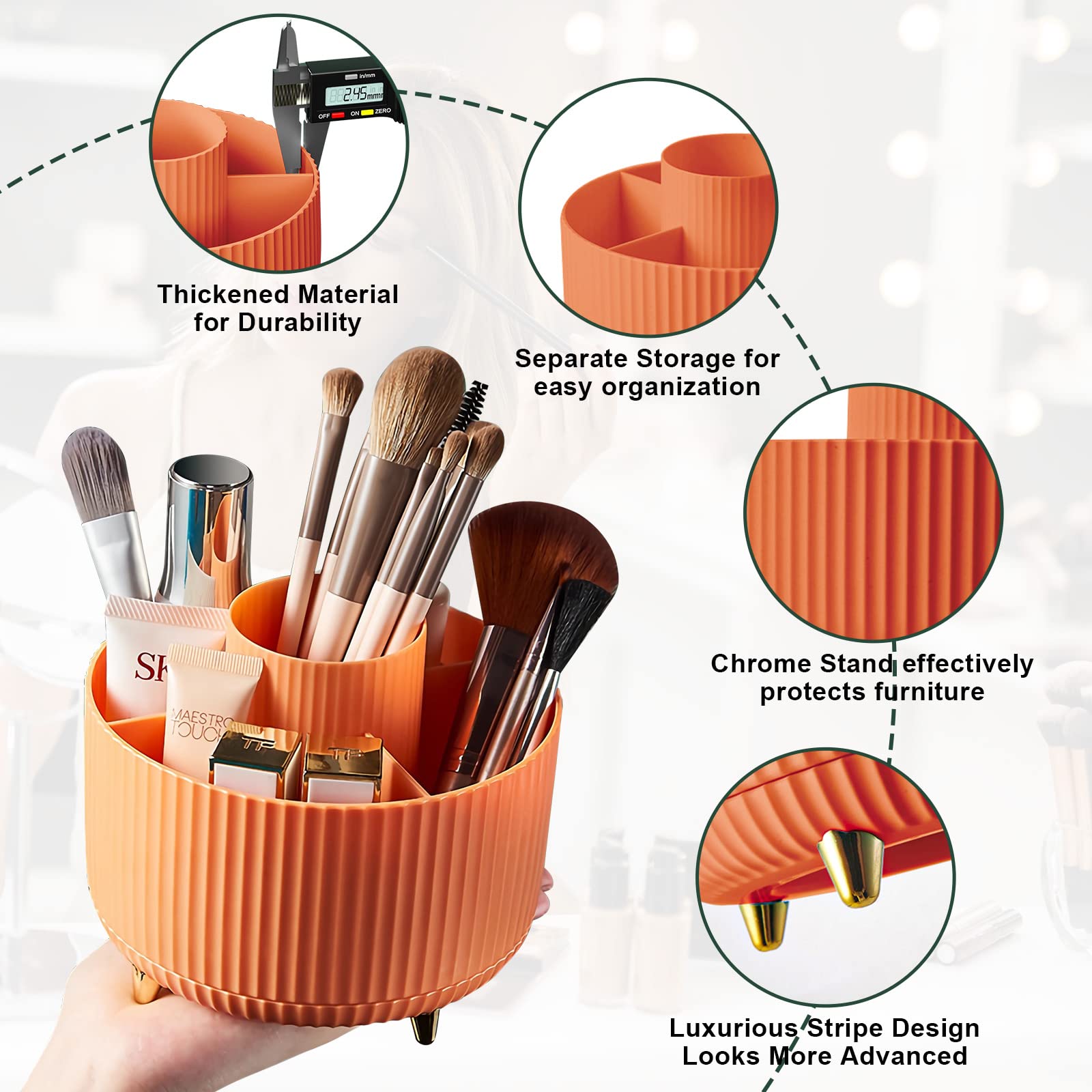 Size of Makeup Storage Organizer:Dimension is 4.9*5.9 inch. (15*12.5cm), The rotating makeup organizer features 5 compartments to accommodate your makeup brushes, nail polish, lipstick as well as small accessories, The divided spinning organizer brings you a fashion-forward way to keep your accessories more organized and easier to find.