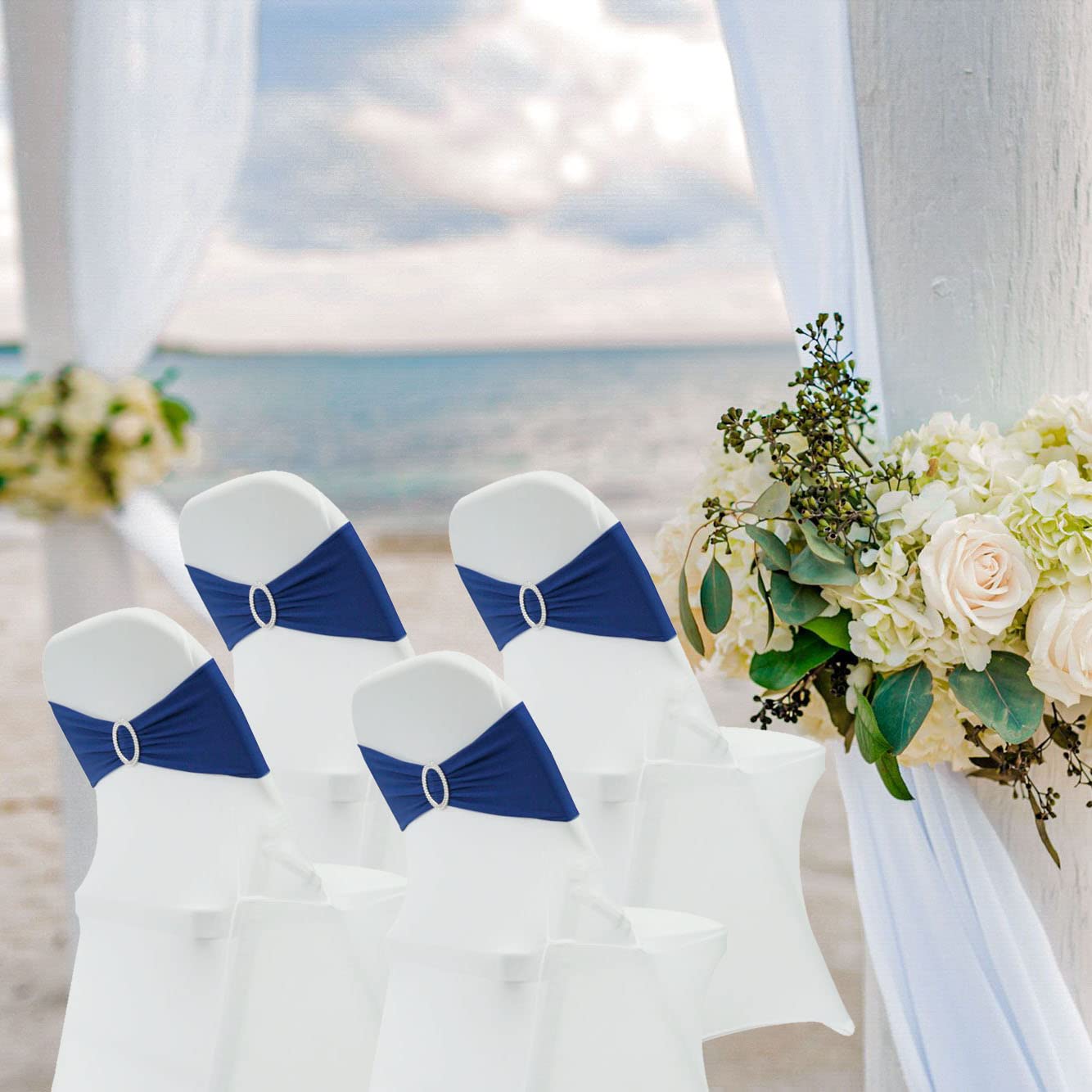 PREMIUM MATERIAL&ACCESSORIES:Comfortable and natural feel,Our spandex chair bands is made of 90% polyester and 10% spandex material, fits 13-19 inches of chair back width and highly stretchable with drill buckle dia6.5cm.Maiangel chair bows with much Fashion,simple and sophistication