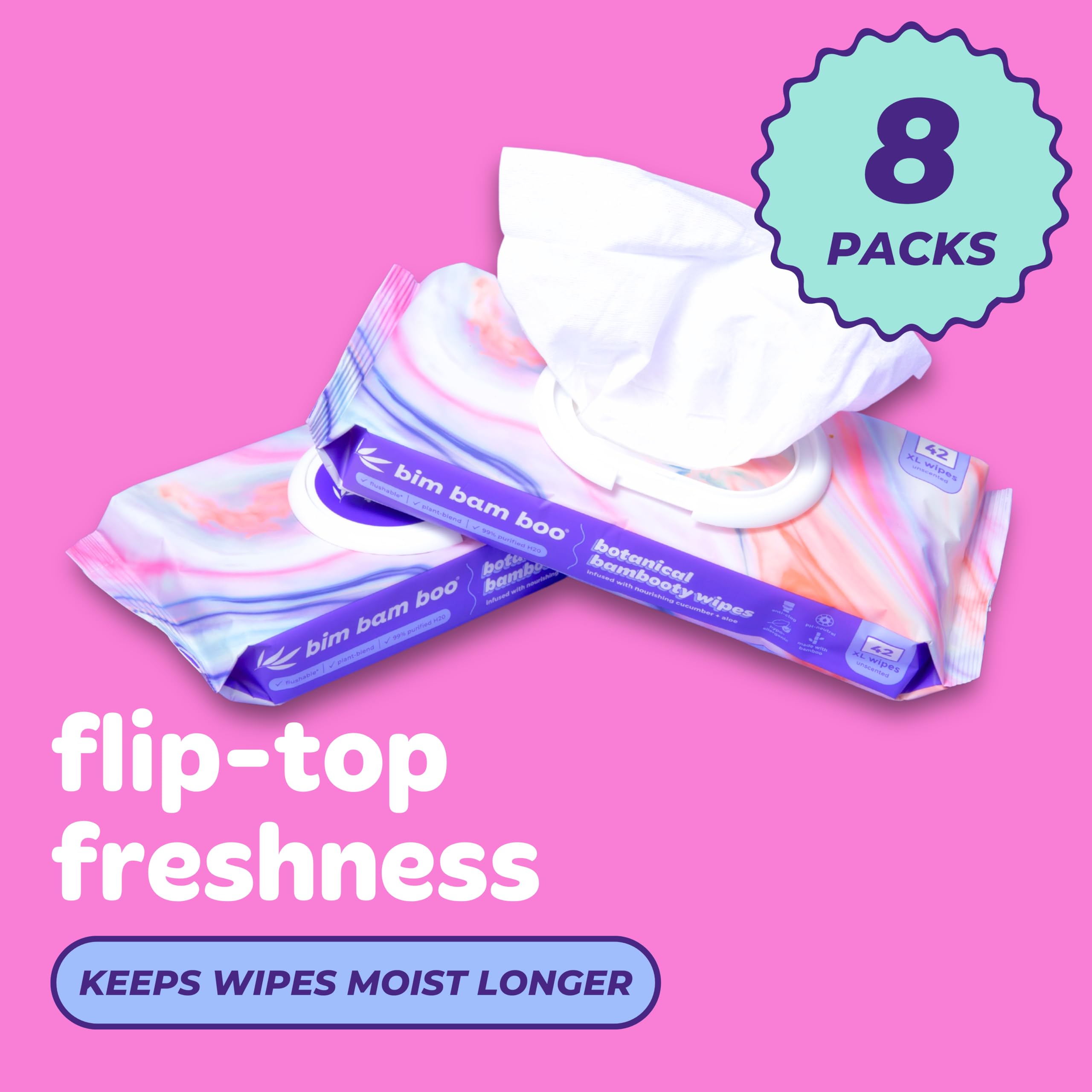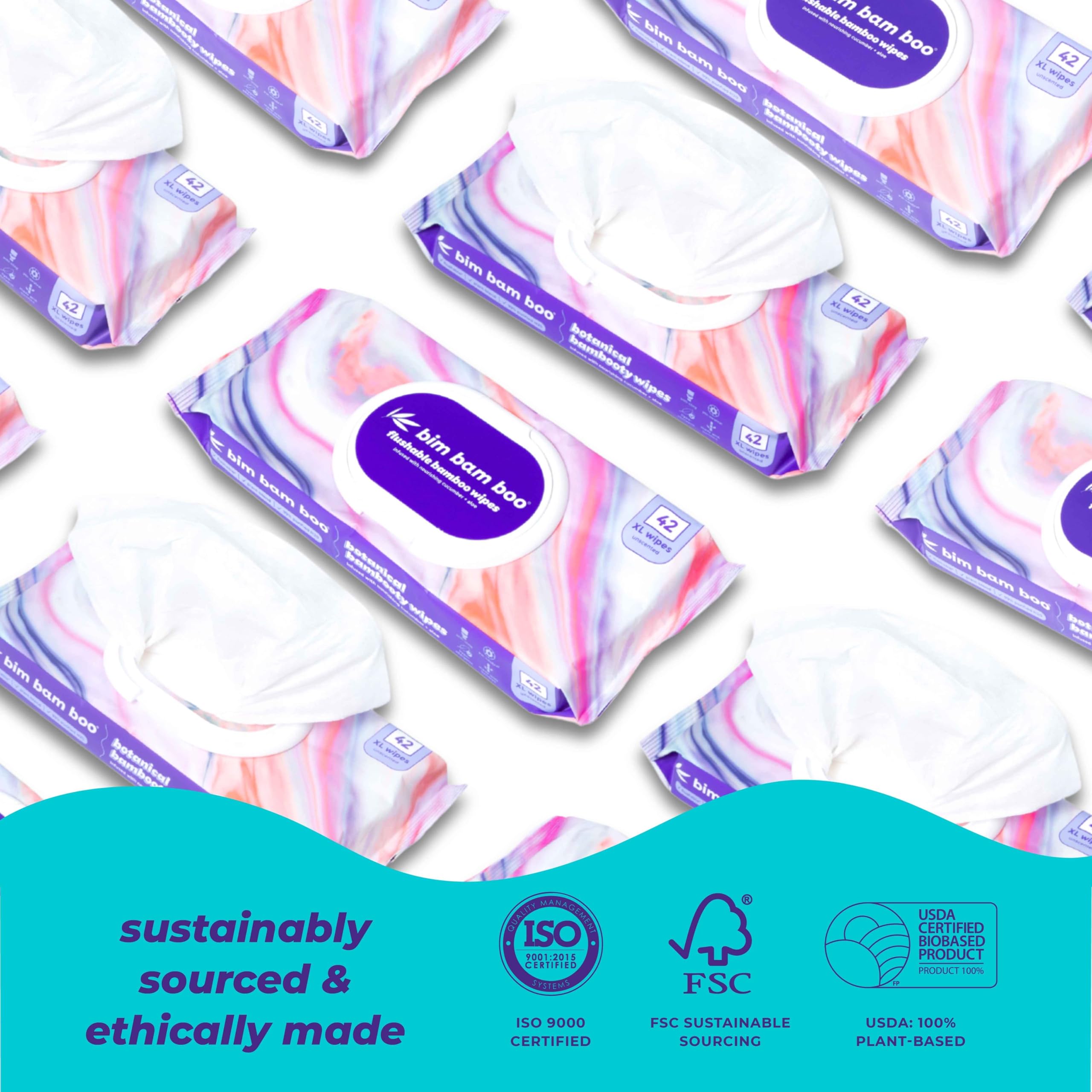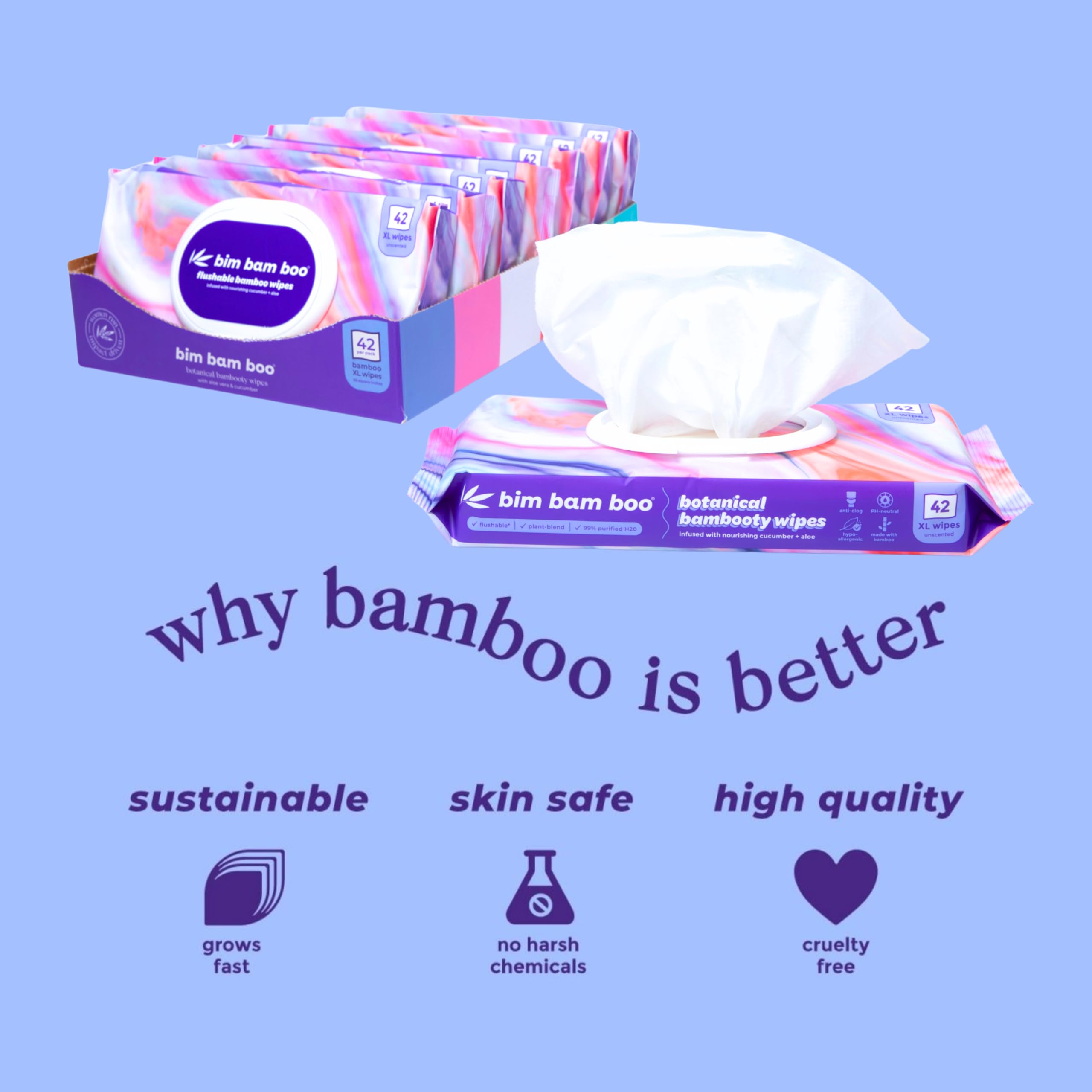 XL BUTT WIPES: Size matters and Bim Bam Boo's are the largest flushable bamboo wipes for adults on the market, 40% larger on average. Each strong wipe features 56 inches² of quality thickness, soft for dudes, dudettes, women, men, kids, and butts big and small. Wipe more with less and still be safe to flush. Our bamboo wipes have enough real estate to protect your whole hand — fold and wipe 2+ times with just one wipe!