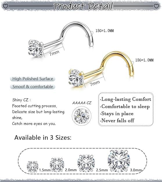 πVariety of Sizes Set: 8pcs nose studs in a set, All Gauge--18G(1.0mm); Pin Length: 7mm; Cubic Zirconia Size: 1.5/2/2.5/3mm. The multi-size set is designed to suit your everyday style. The 18Gauge nose piercings stud, adorned with a sparkling crystal, not only enhances your allure but also complements any outfit flawlessly