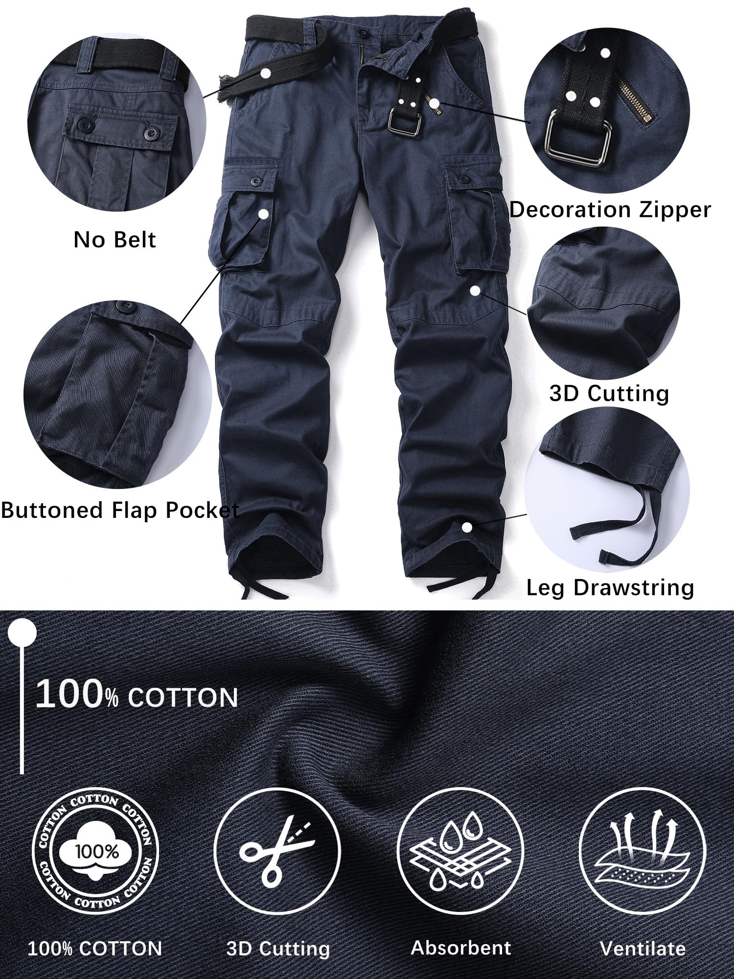 Product features: The men's cargo pants is built with fashion and comfort in mind,sits at waist,relaxed fit, the straight leg openings with drawstring tie to fit with boots, and be great for hunting pants,camping pants, working pants, tactical style, costume pants. Also,The casual work cargo pants you were wearing didn't rip even as you walked over briars because to the double-thread sewing,durability, ripstop, and scratch resistance.