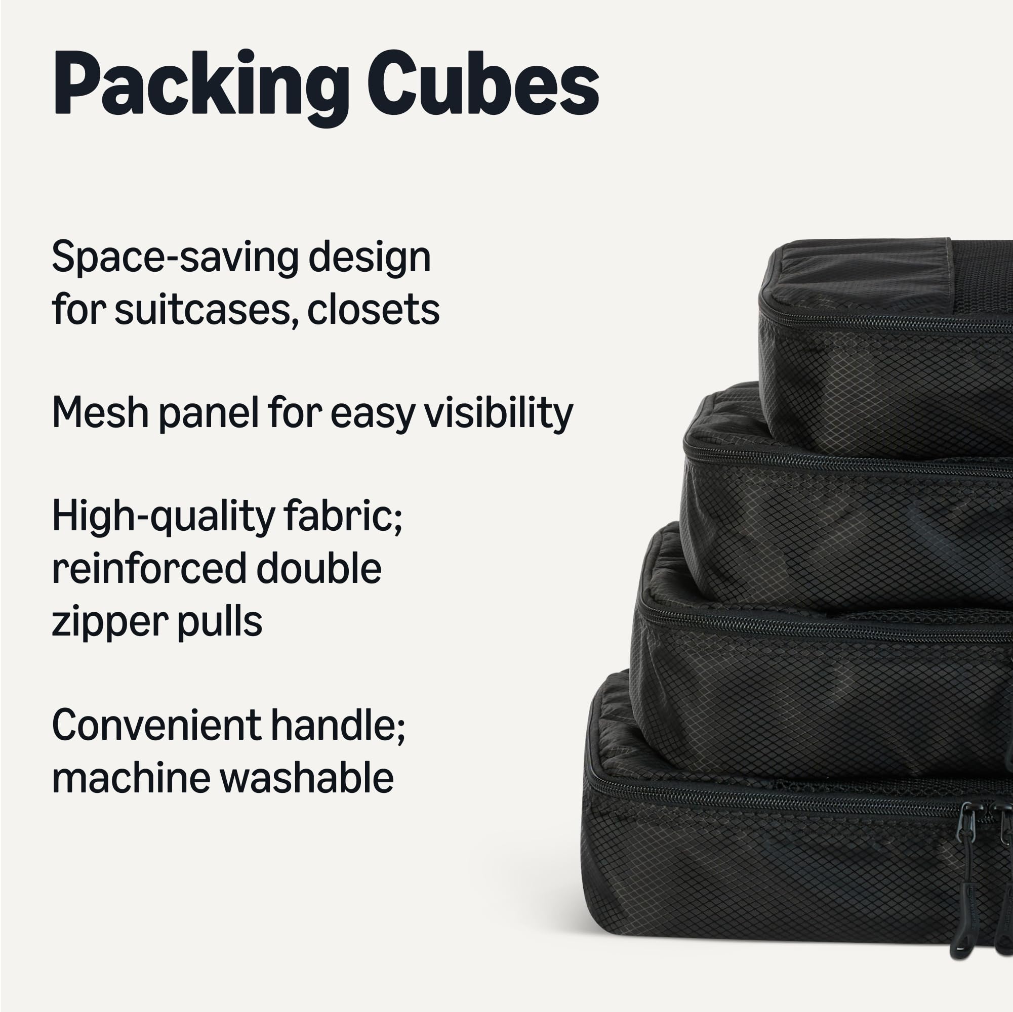 Product Description Amazon Essentials set of 4 medium packing cubes with mesh tops for visibility. Made of 100% polyester with double zips, designed to organise clothes and accessories in luggage. From the Manufacturer Amazon Essentials