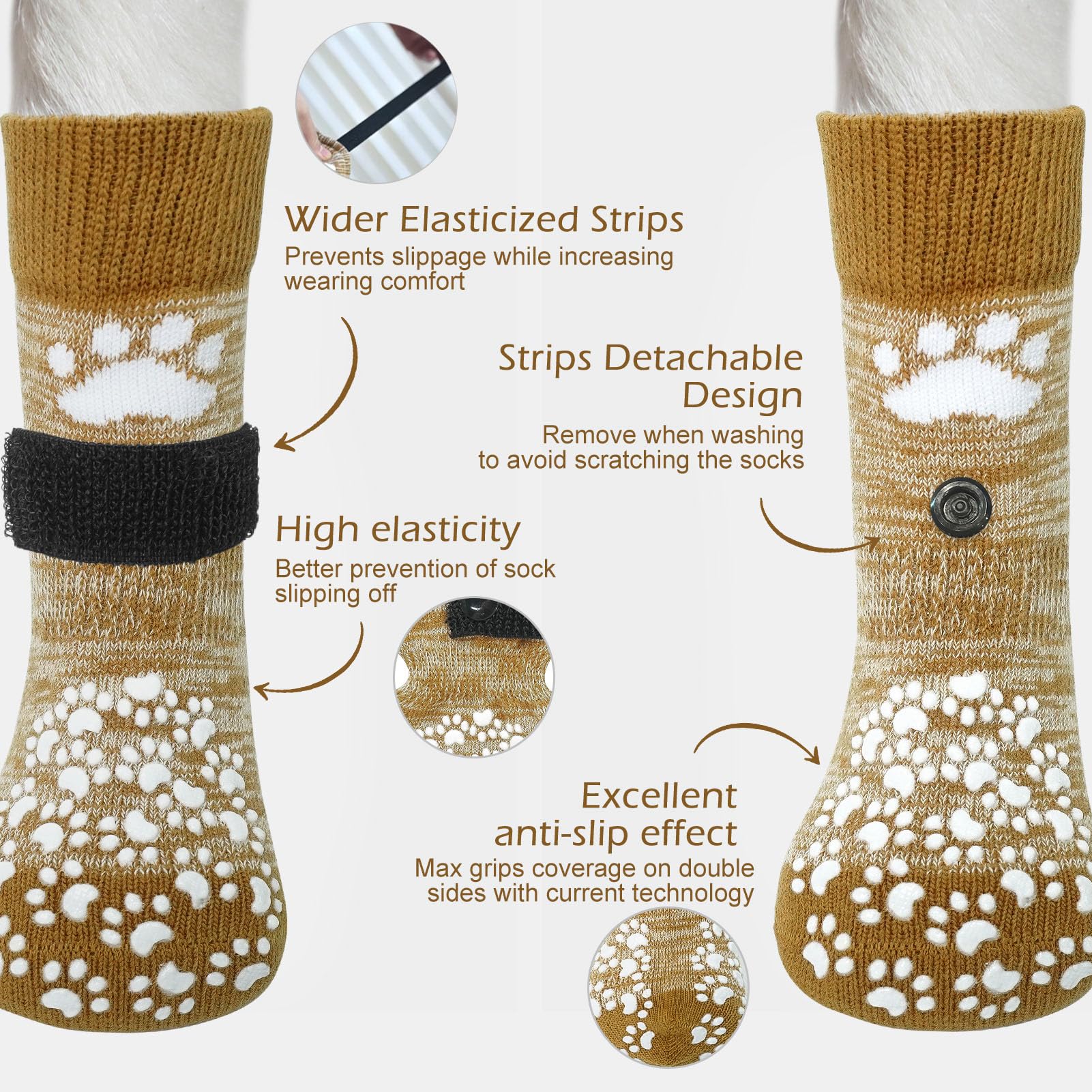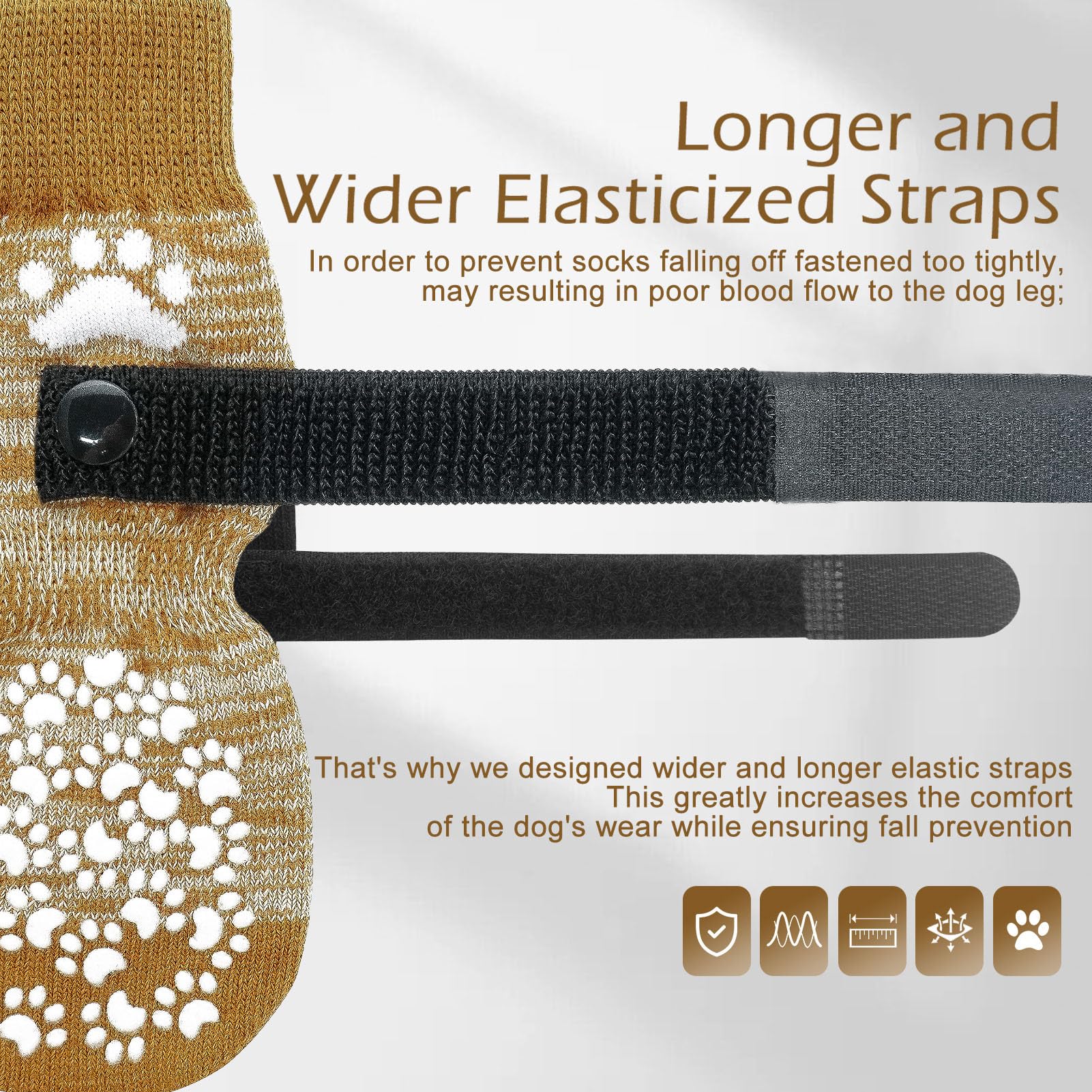 [Anti-Fall Off] Updated with wider and longer elastic sticky straps, there is more room for adjustment depending on your dog's feet, to prevent socks from falling off, greatly increase wearing comfort, and keep your socks safe from scratches in the wash, we’ve designed a removable sticky straps so you can easily take it off before washing.