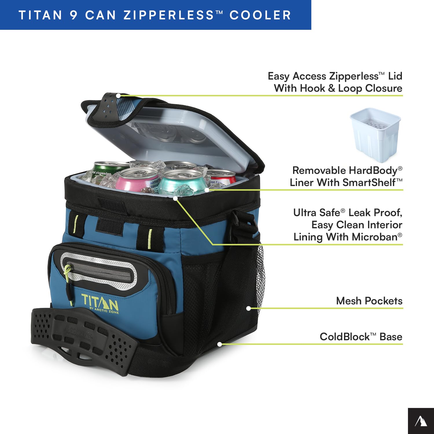 TITAN BY ARCTIC ZONE ZIPPERLESS COOLER: Cooler features a patented, "flip-open" Zipperless lid for quick access to food and drinks; Keeps ice for up to two days and holds up to 9 cans